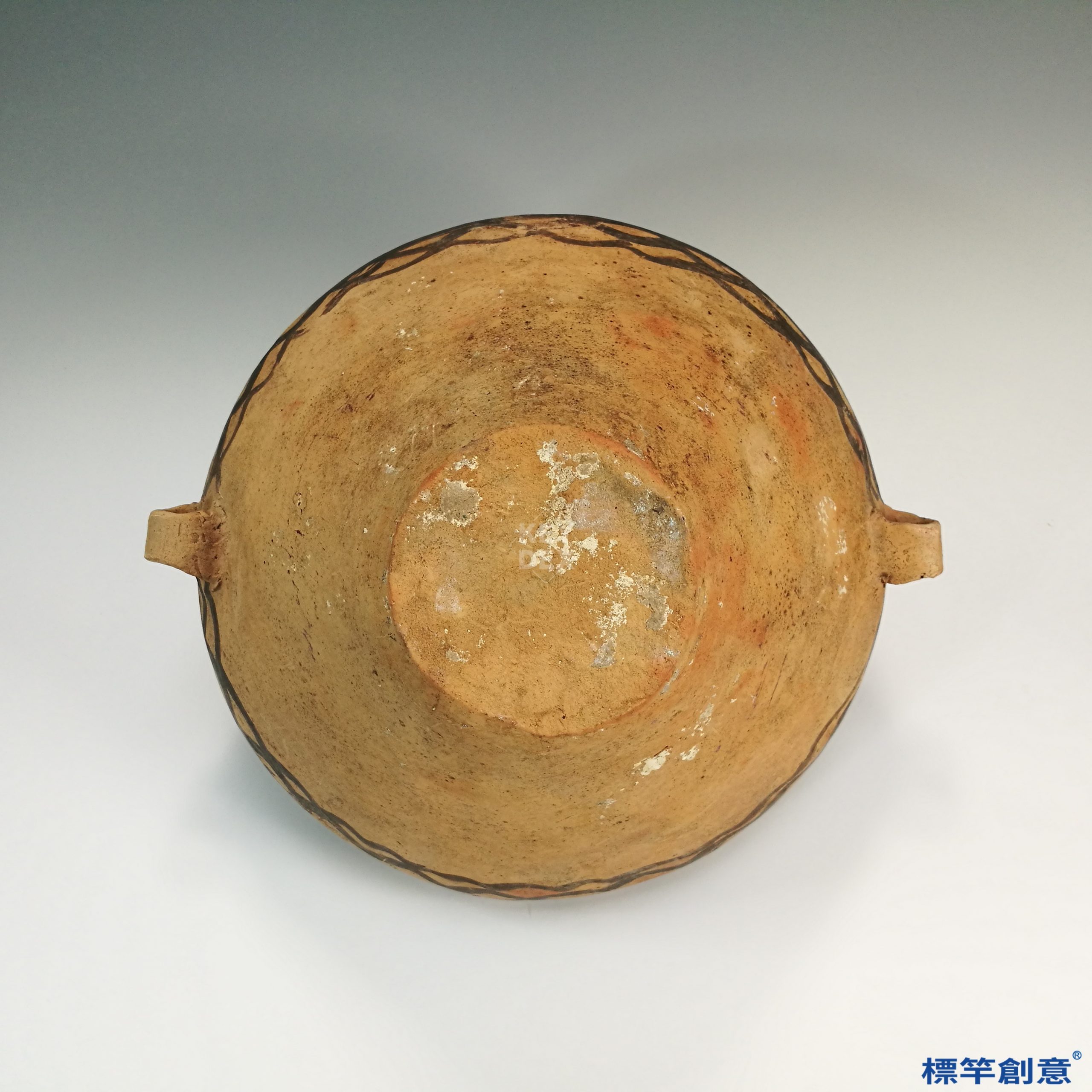 此器通高35公分,最大腹徑達39公分,體量碩大,整體呈卵圓形,腹部飽滿,口頸處略收,喇叭口外撇,雙繫橫置於肩部兩側。壺體從底至肩輪廓勻稱,線條自然,重心穩定,是典型的高肩圓腹大型貯藏陶器。