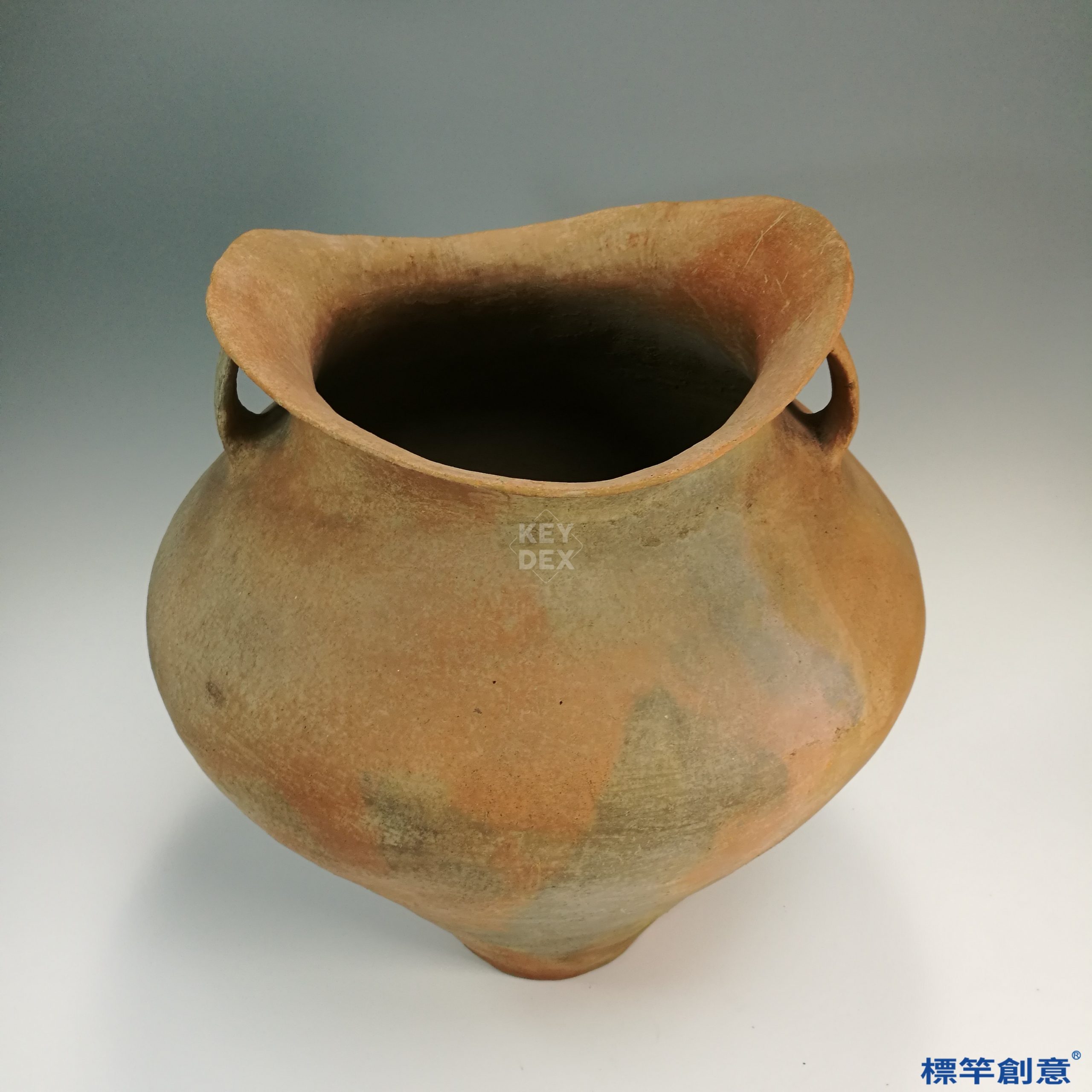 採細膩紅陶胎手工拍打成形,表面未施釉,但經磨光處理,隱隱呈現紅褐與灰黑交錯的煙燻斑痕,屬於半燒結陶的特徵,可能與燒製條件中的煙氣覆蓋有關。器形渾厚對稱,工藝成熟。