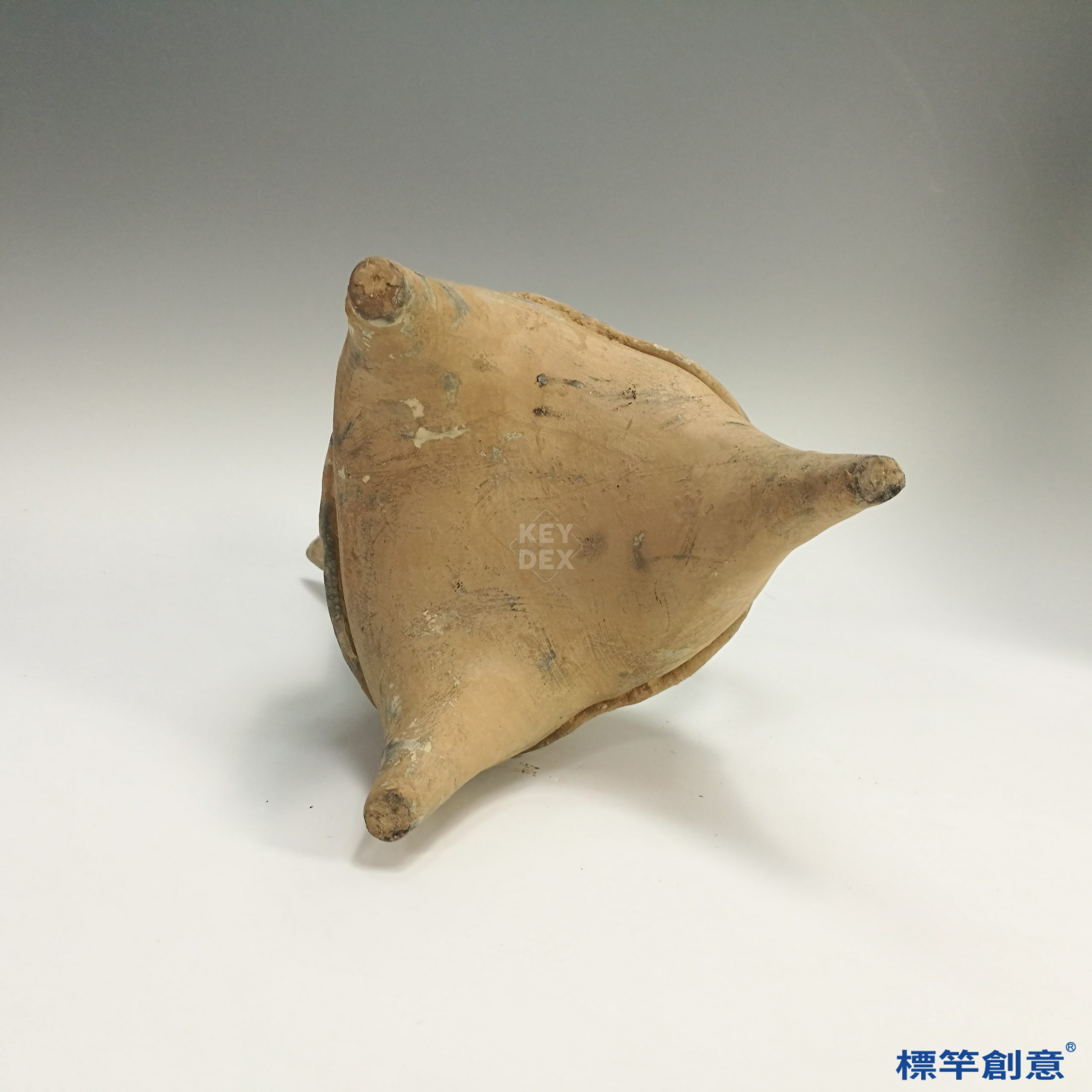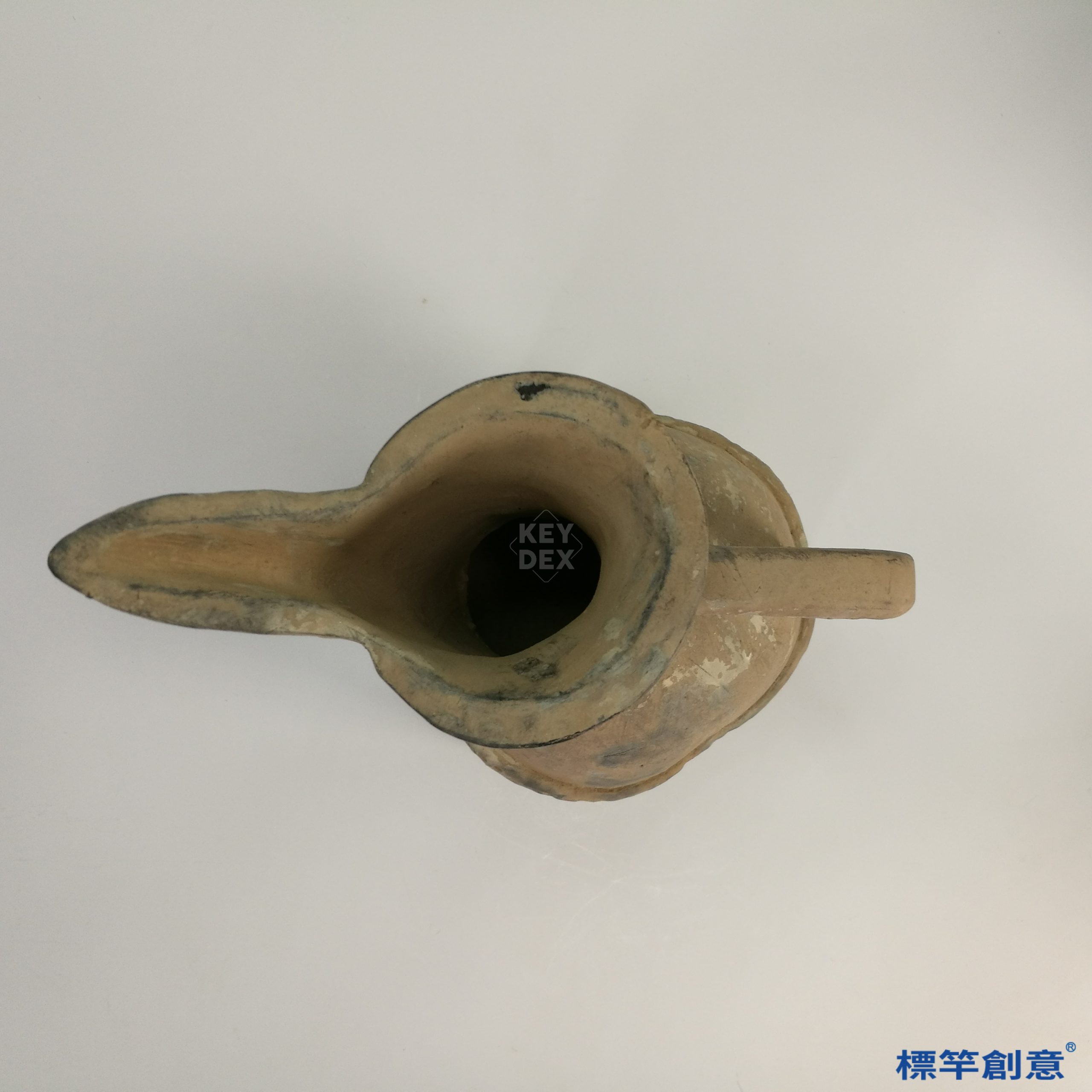器身以細灰陶胎製成,表面打磨平整,整體未施釉,燒成後呈現自然灰褐色調。三足結構穩定,肩部環繞一圈細密附飾,增添視覺層次。壺嘴修長細直,為典型「長流鬹」,配合鳥形主題極具象徵意涵。提把弧形自然,便於斟注與提攜。