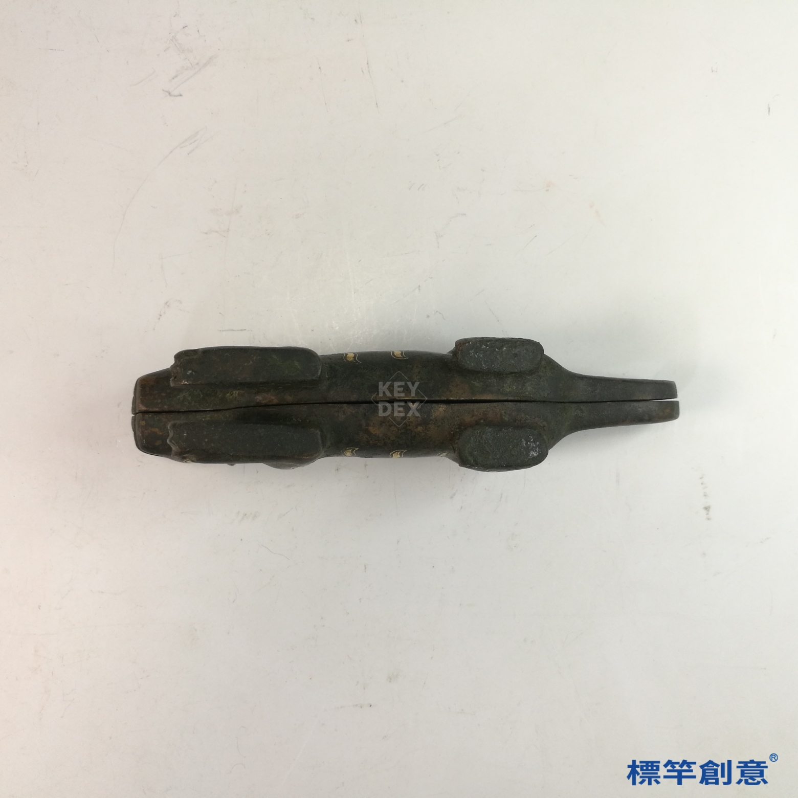 本件虎符通高約4.8公分,通長13.8公分,整體為伏虎造型,虎體扁平,四足內收,頭部微側,尾巴上捲。造型動靜兼備,身形比例勻稱,具高度寫實與裝飾性。器物斷面為合符設計,背部下方可見接榫與錯合結構,屬雙虎對合式虎符之一端,預留凹凸接口以與另一半精準結合。