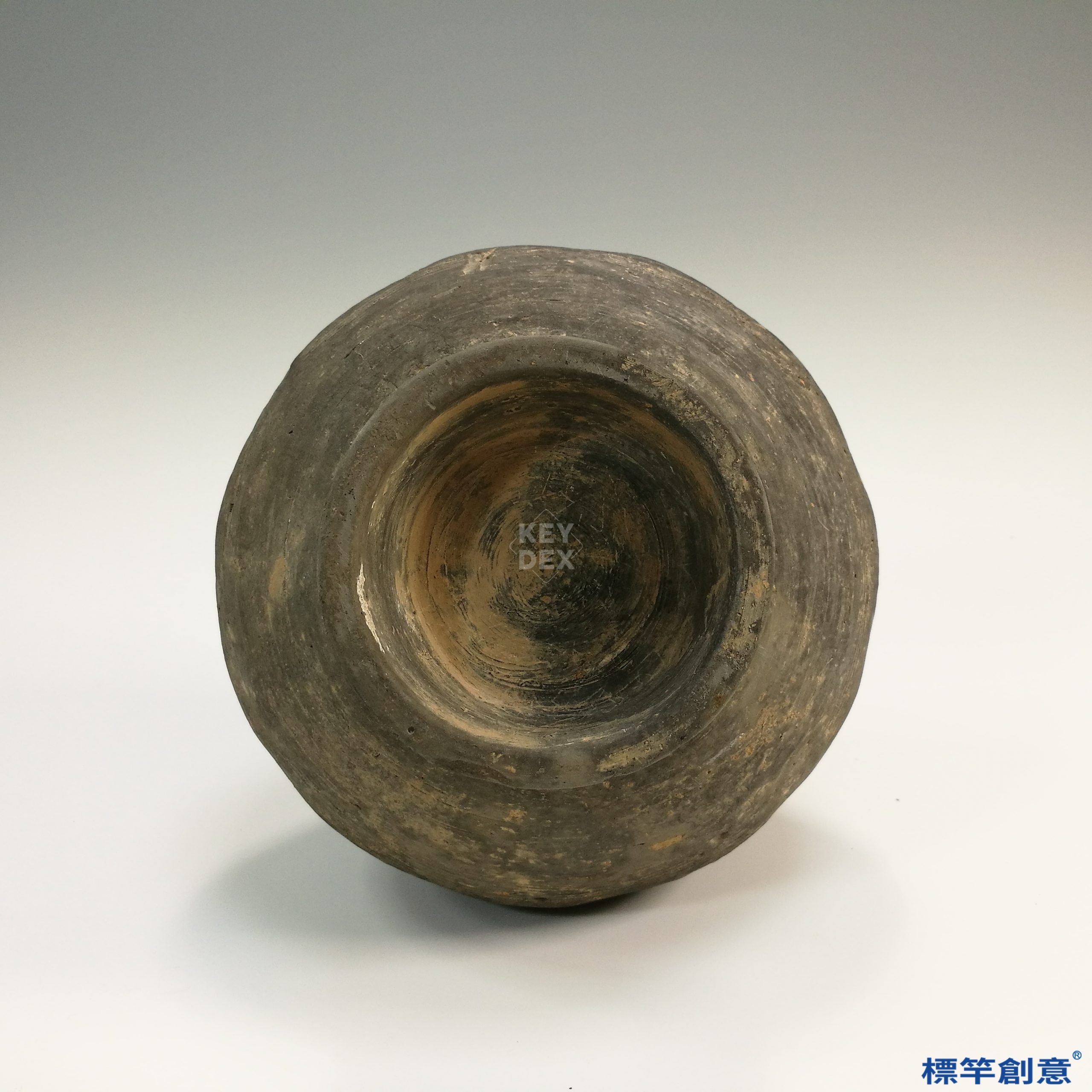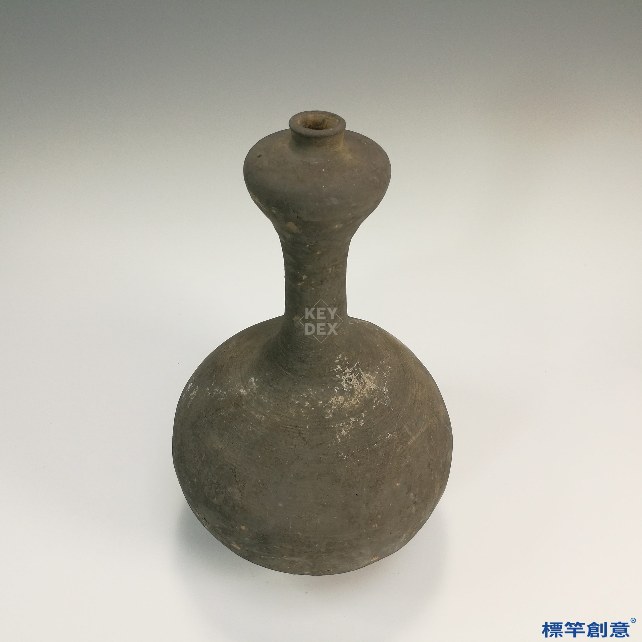 器體以細質黏土拉胚成形,未施釉,採高溫還原氣氛燒成,使其呈現深灰至黑色光澤。表面無明顯裝飾,僅存輪製痕與燒成火斑,體現漢代器物樸素沉穩的審美風格。長頸與鼓腹之比例關係極為協調,展現出漢代成熟的造型掌握。