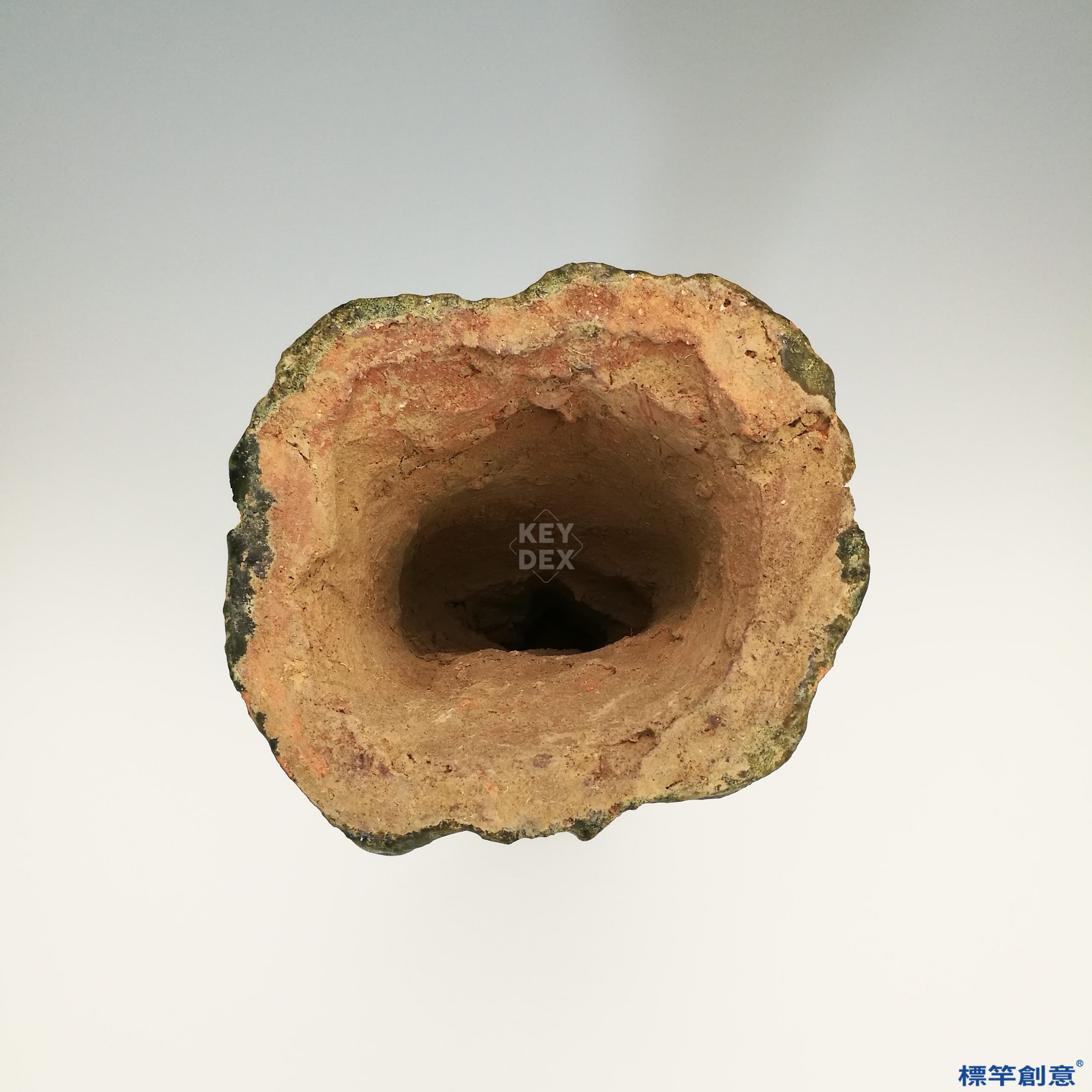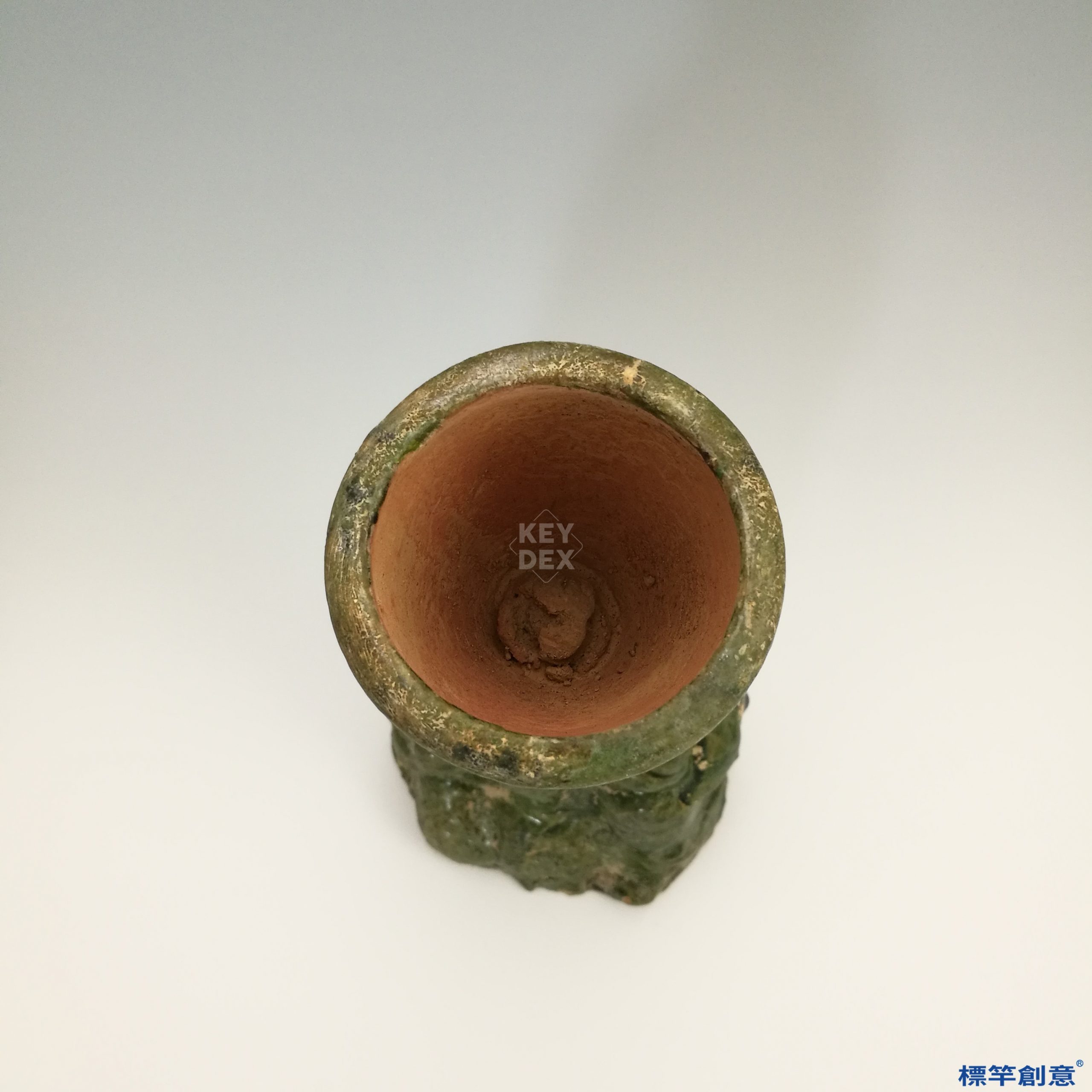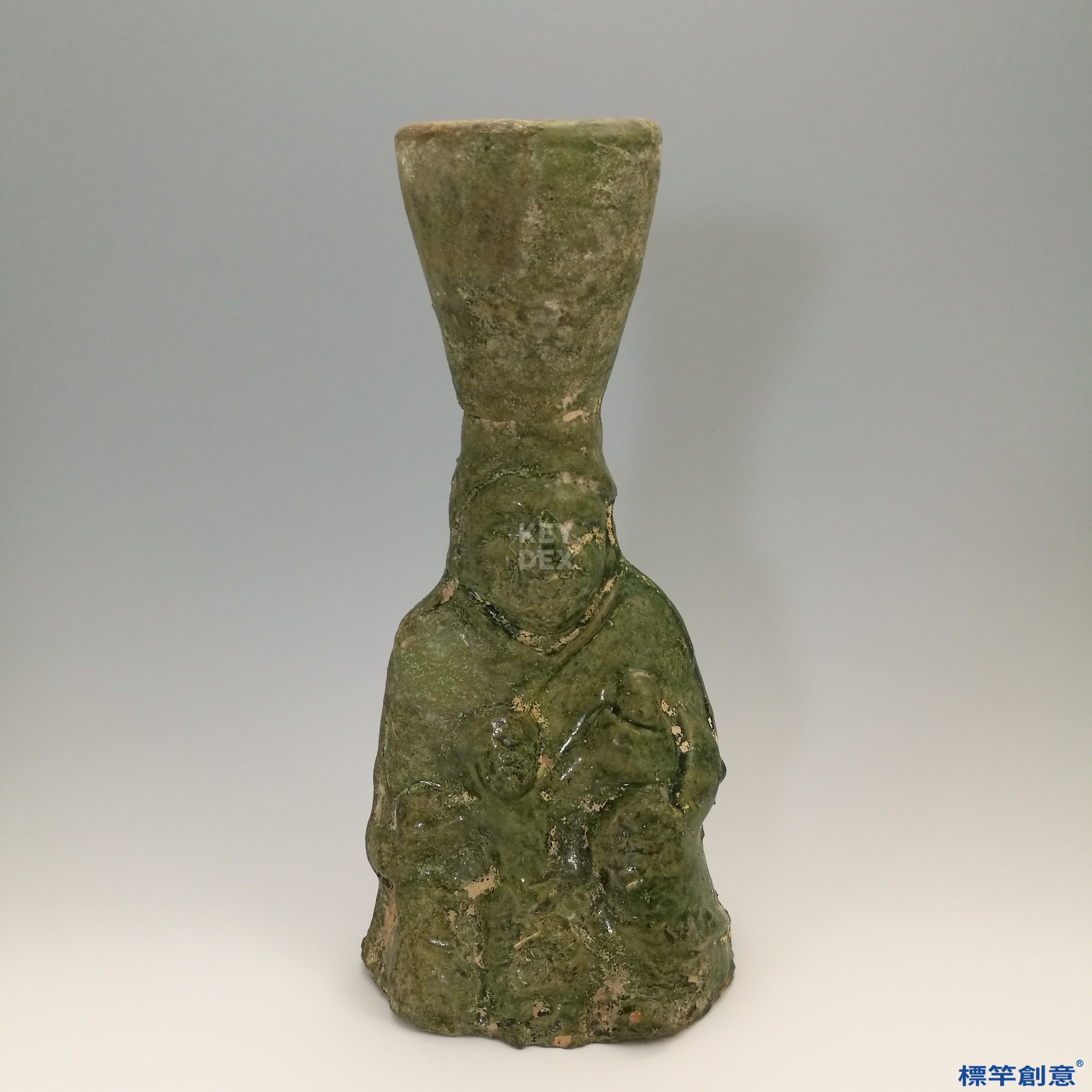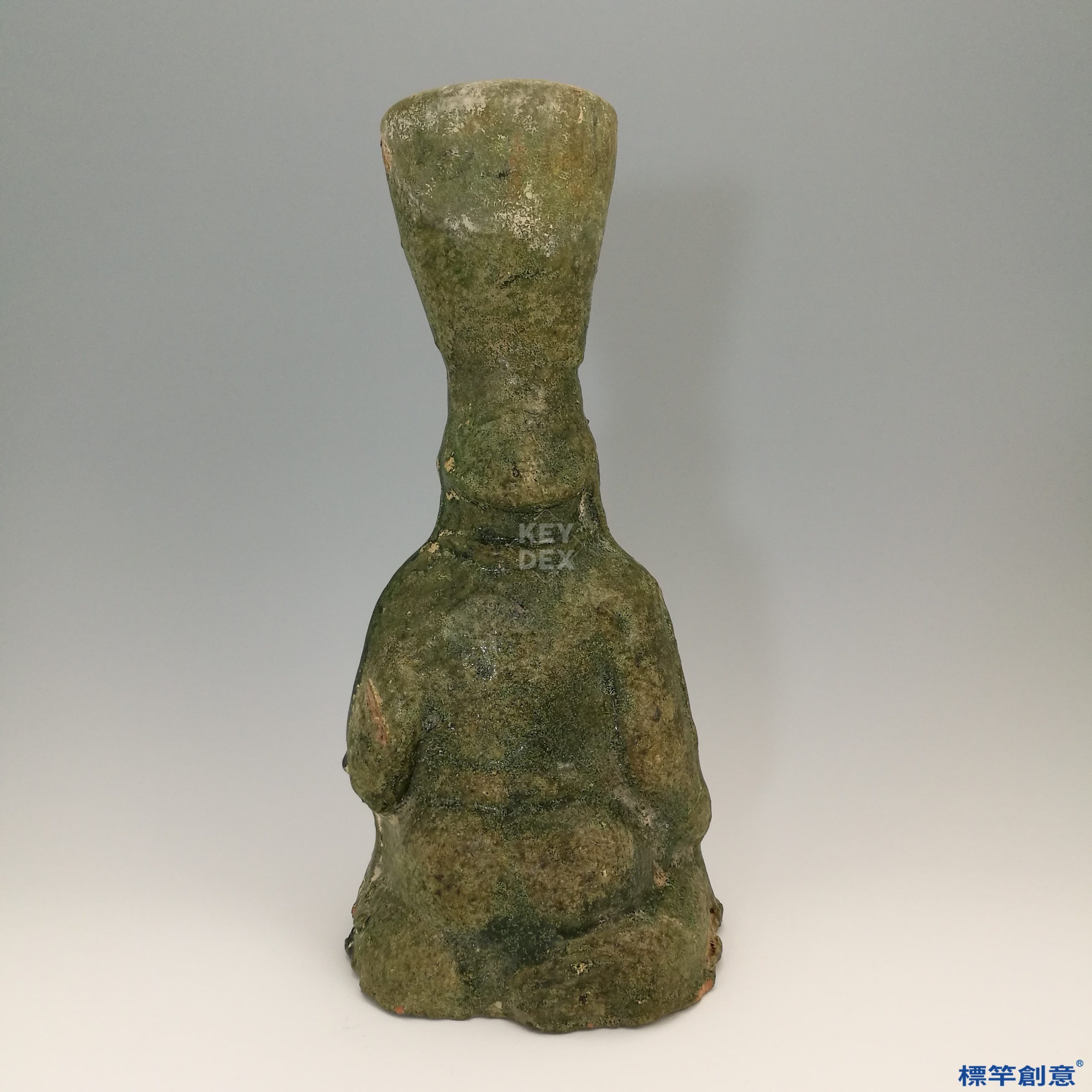 器物以泥質紅陶為胎,通體施低溫鉛釉,釉色以深綠為主,局部因埋藏與燒成條件呈現釉斑、虹彩與失光現象。釉層流動自然,具有濃厚東漢時期綠釉風格。造型寫實簡練,無多餘裝飾,重在模擬人俑持燈的實用結構。