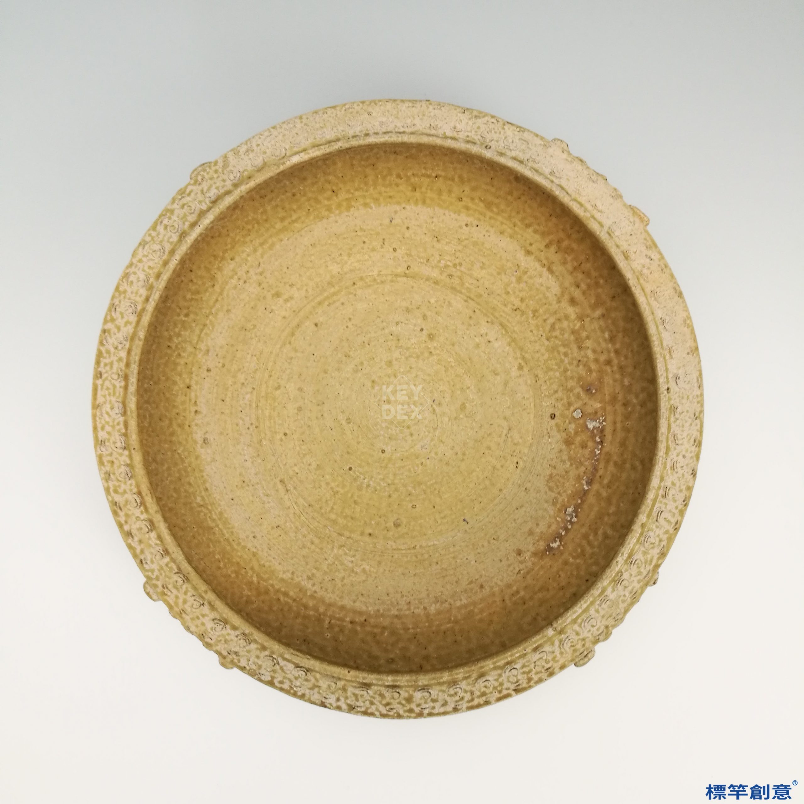 此器通高約7公分,口徑約21公分,盤體淺腹,平口外撇,底承三個獸蹄形足。器形圓穩寬厚,造型仿效漢代青銅禮器之「盤」式樣,結構樸實大氣,具實用與禮制雙重意涵。