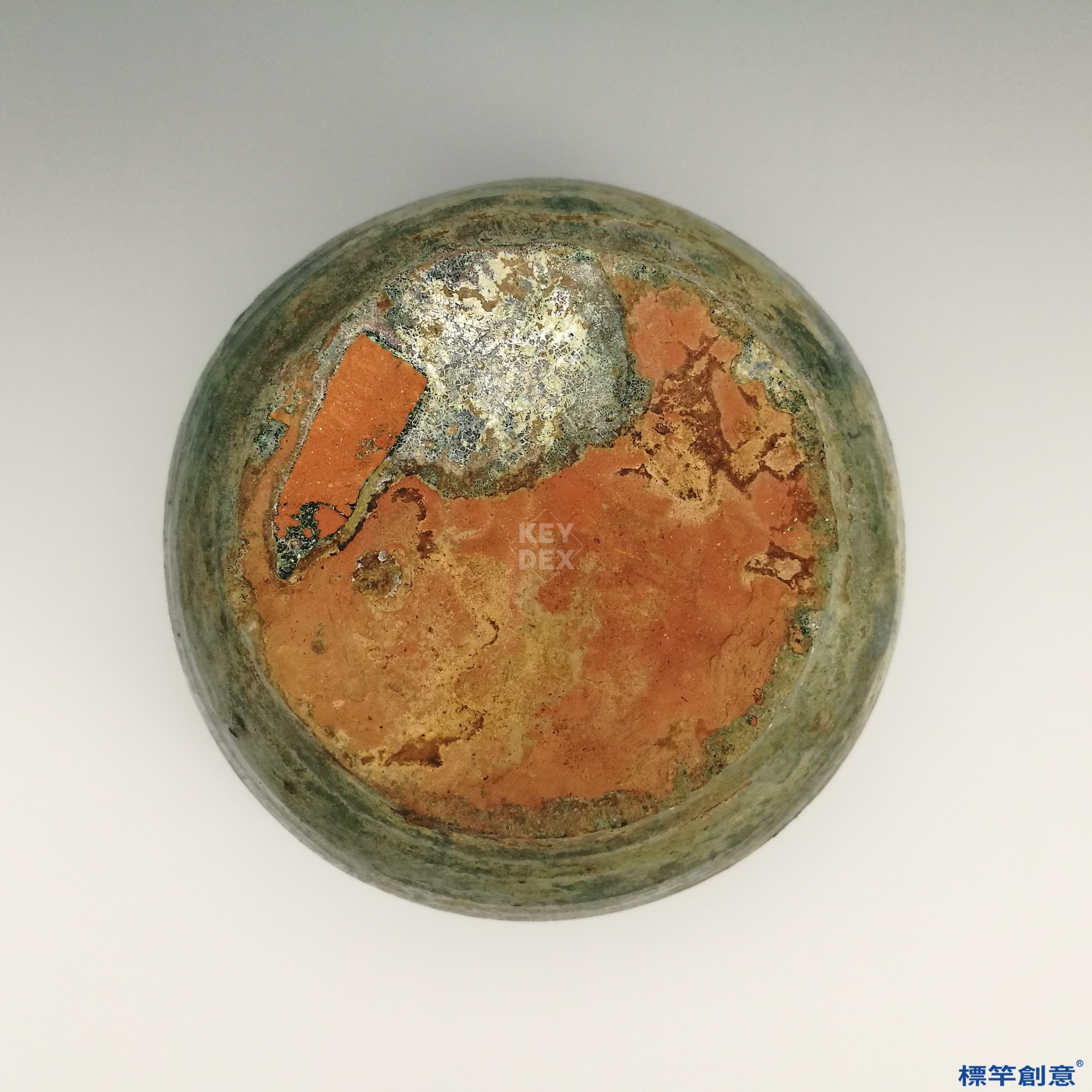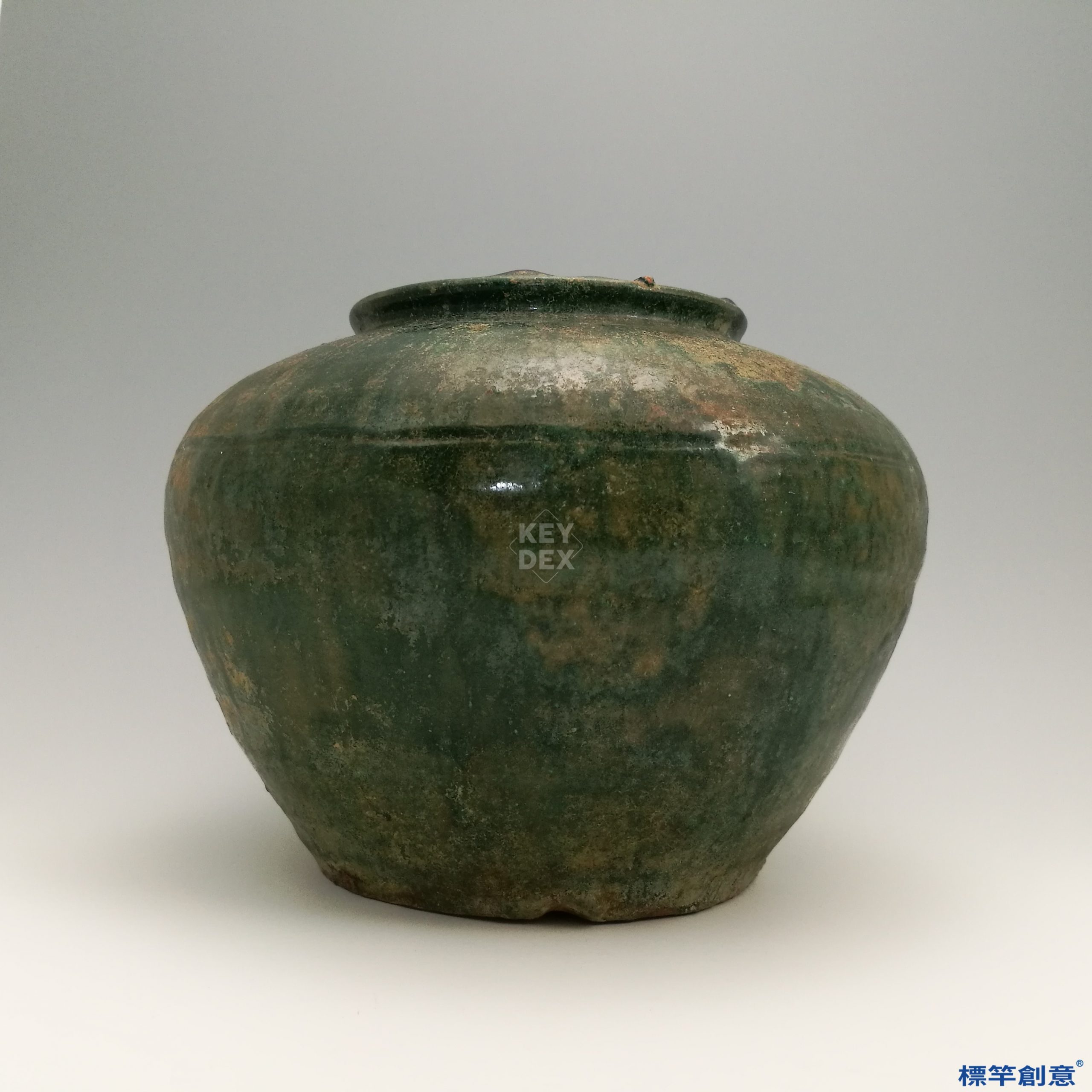 通體施褐綠釉,釉層厚薄略有不均,自口沿向下略有流釉痕跡,釉面有自然氧化與局部剝落,露出灰褐色陶胎,胎質堅實。器形為一次成型,經高溫燒製後再施釉。