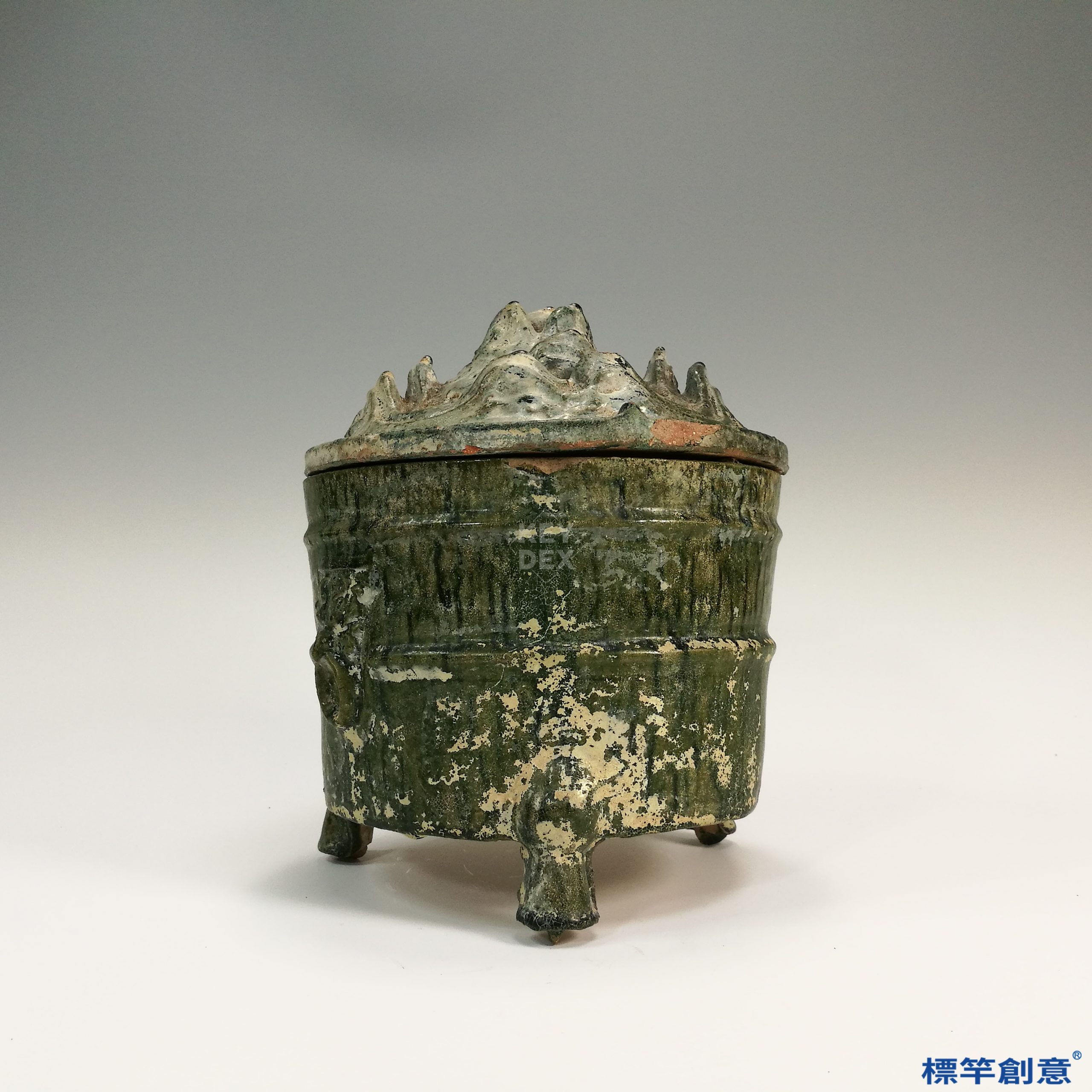器身以細緻陶土模製成形,蓋為模印山形構件貼合而成,胎體堅實,表面施鉛釉,呈現深綠釉色,具玻璃質感。經長年埋藏,釉面出現自然剝落與氧化斑駁,為典型漢代出土陶器特徵。