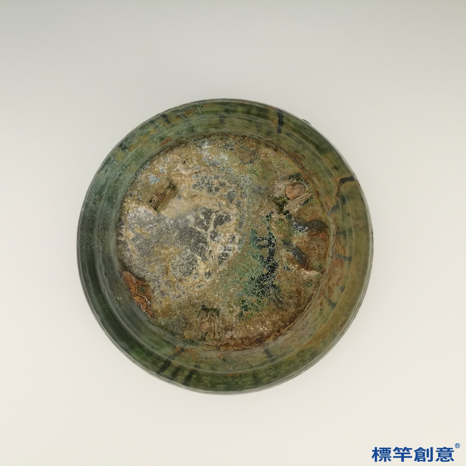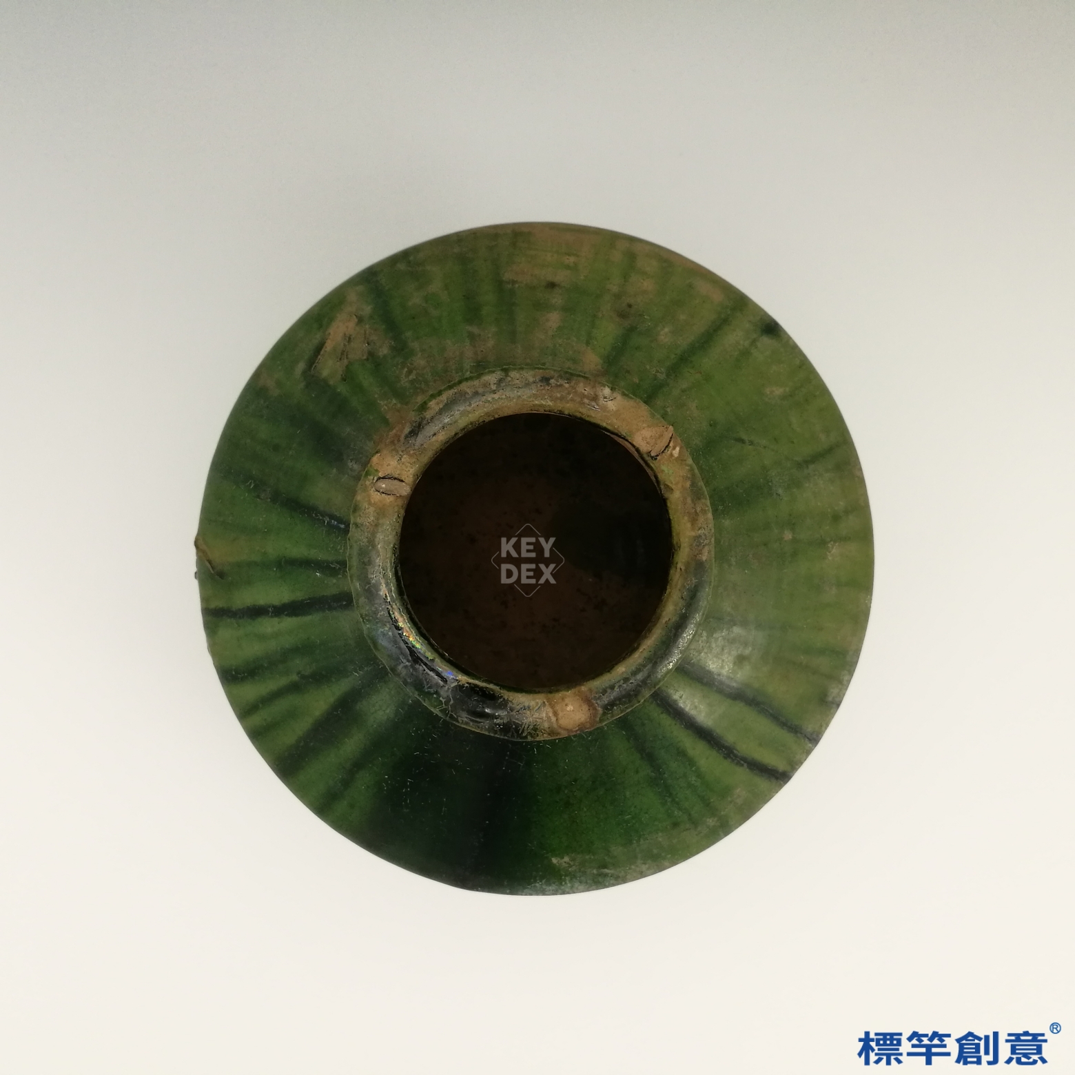 本器為漢代常見的隨葬明器,通體施覆橄欖色至墨綠色之鉛釉,屬「綠釉陶」品類。此類釉層多於還原氣氛中燒成,釉色深沉濃厚,部分釉面經千年氧化,呈現銀斑或銅綠結晶斑駁狀態,具有強烈時代風貌。