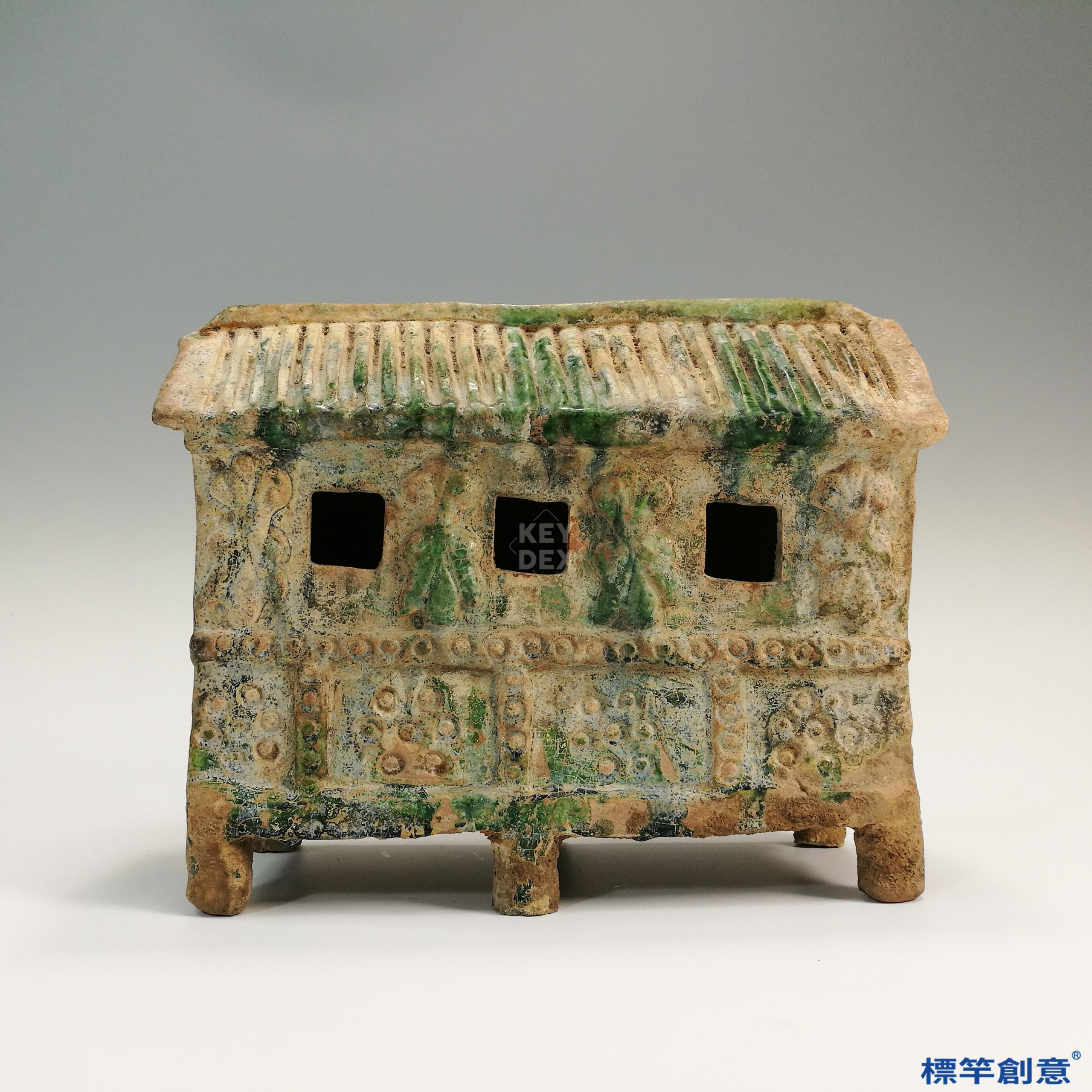 採模製與手工雕修結合技術完成,屋頂、牆體與門窗細節皆具一定程度的寫實性。表面施以青綠色鉛釉,釉層隨時間部分脫落,保留古樸自然的風化痕跡,增添歷史厚重感。