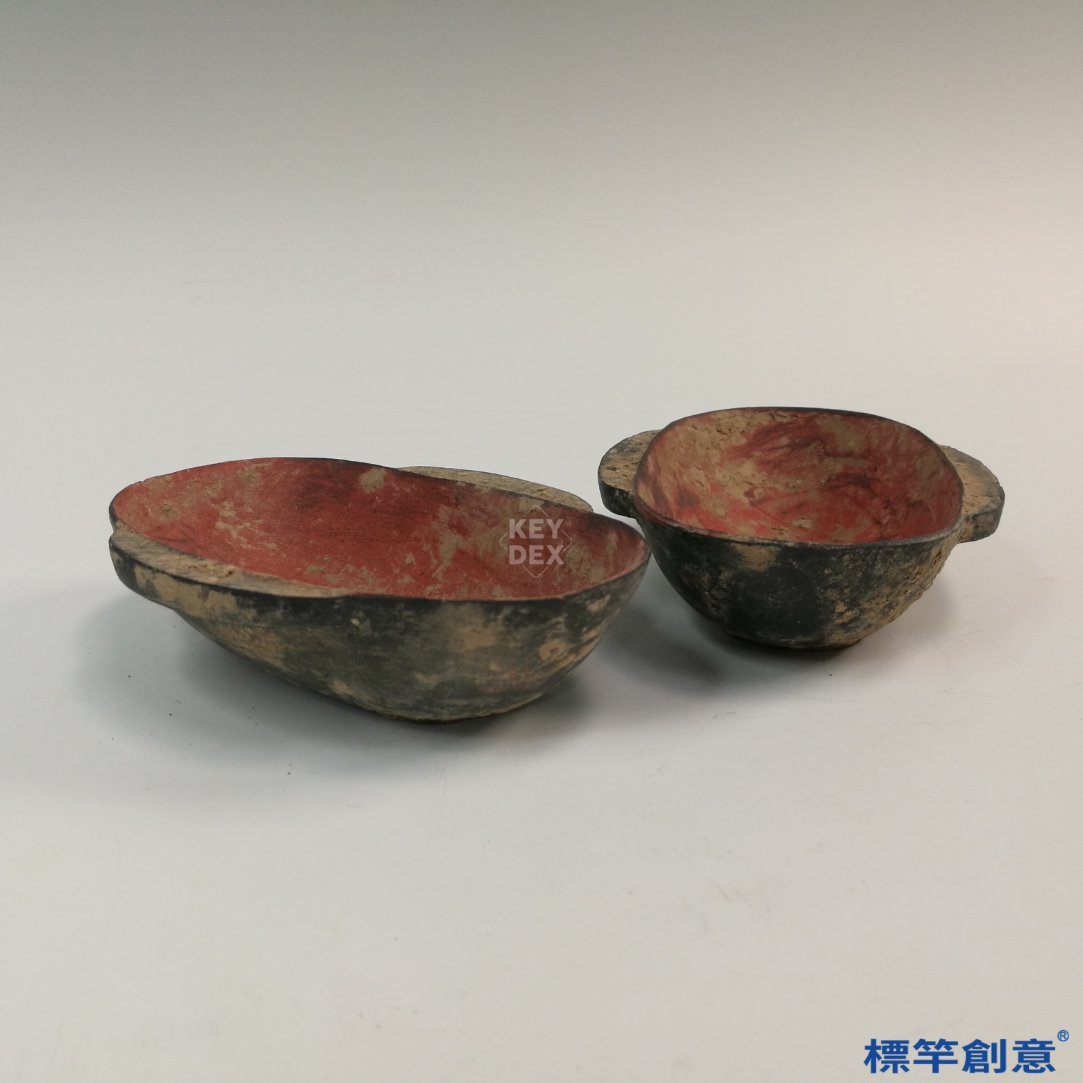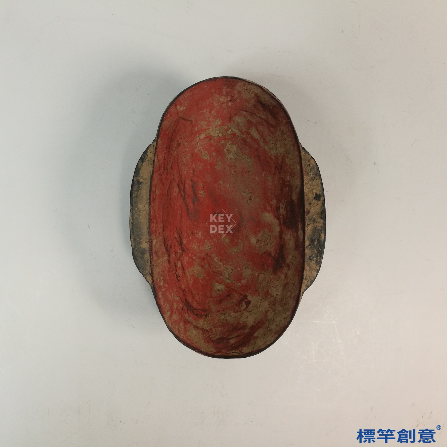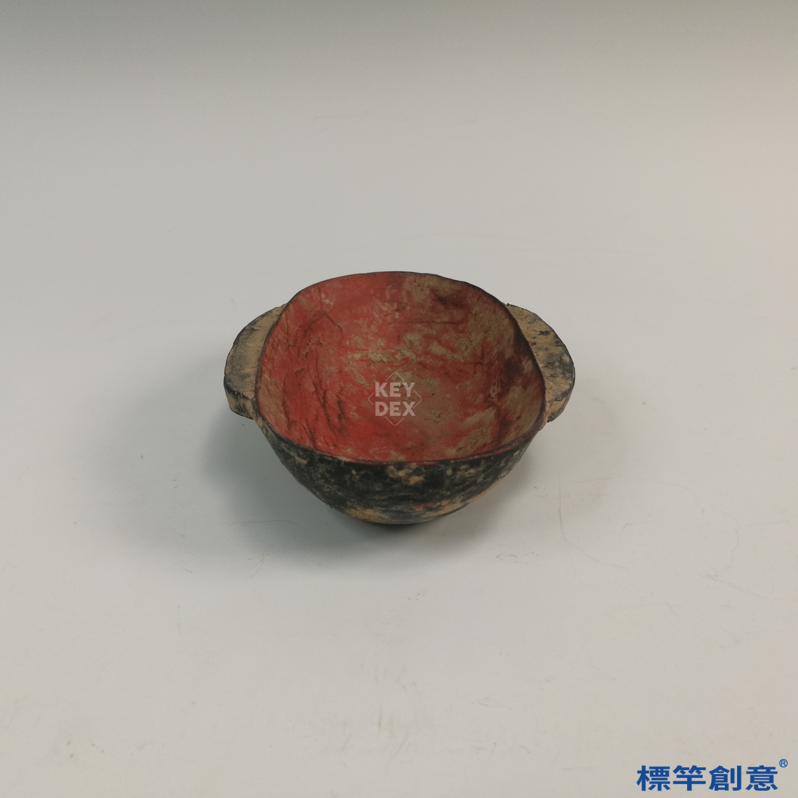 採細質泥土手工拍築或模製成形,器表經還原燒成形成黑陶質地,內壁則施以朱紅色礦物顏料塗層。雙耳貼附於肩部兩側,製作精巧,形似羽翼,為漢代羽觴風格之一。紅彩多有自然刷痕與氧化斑駁,增添古拙之趣。