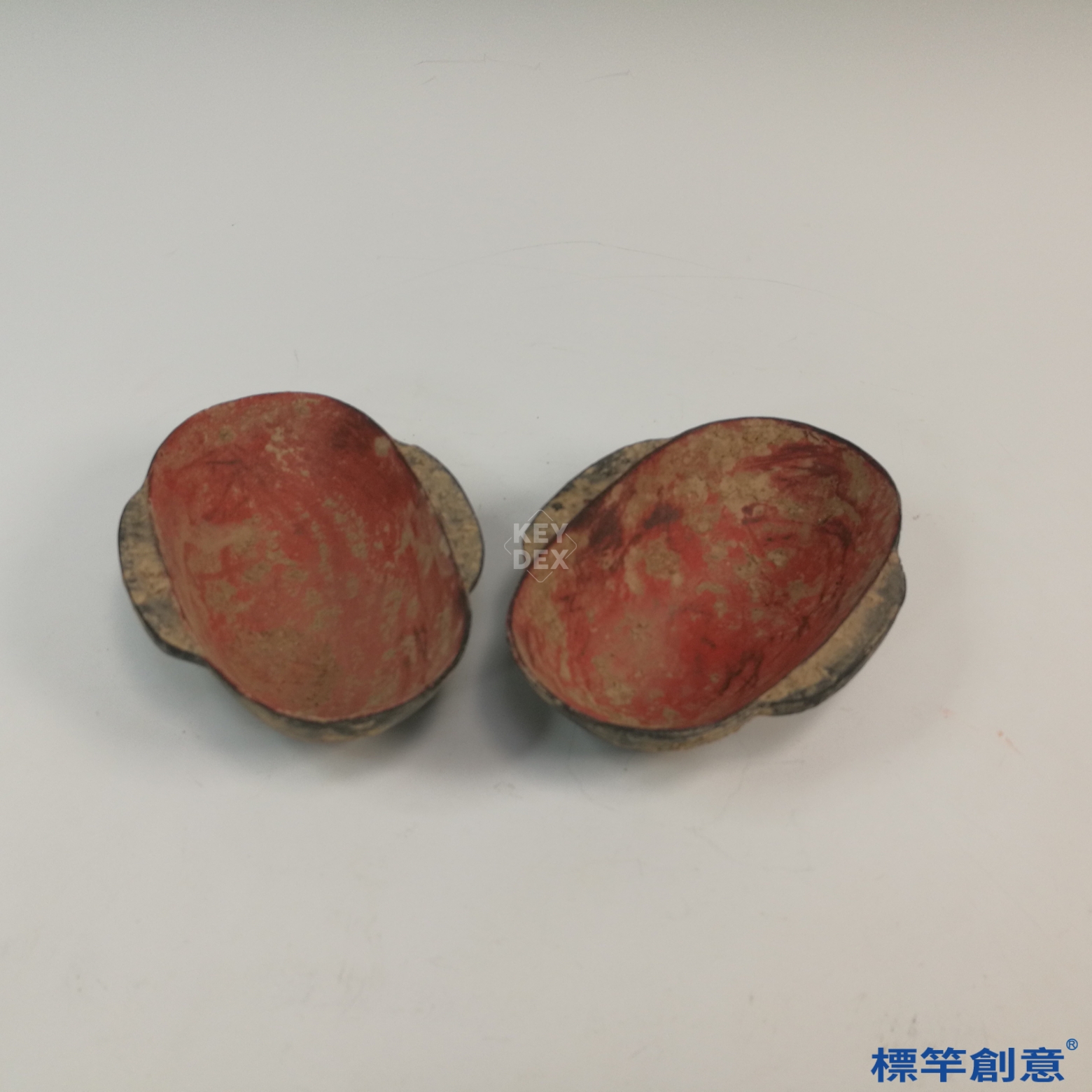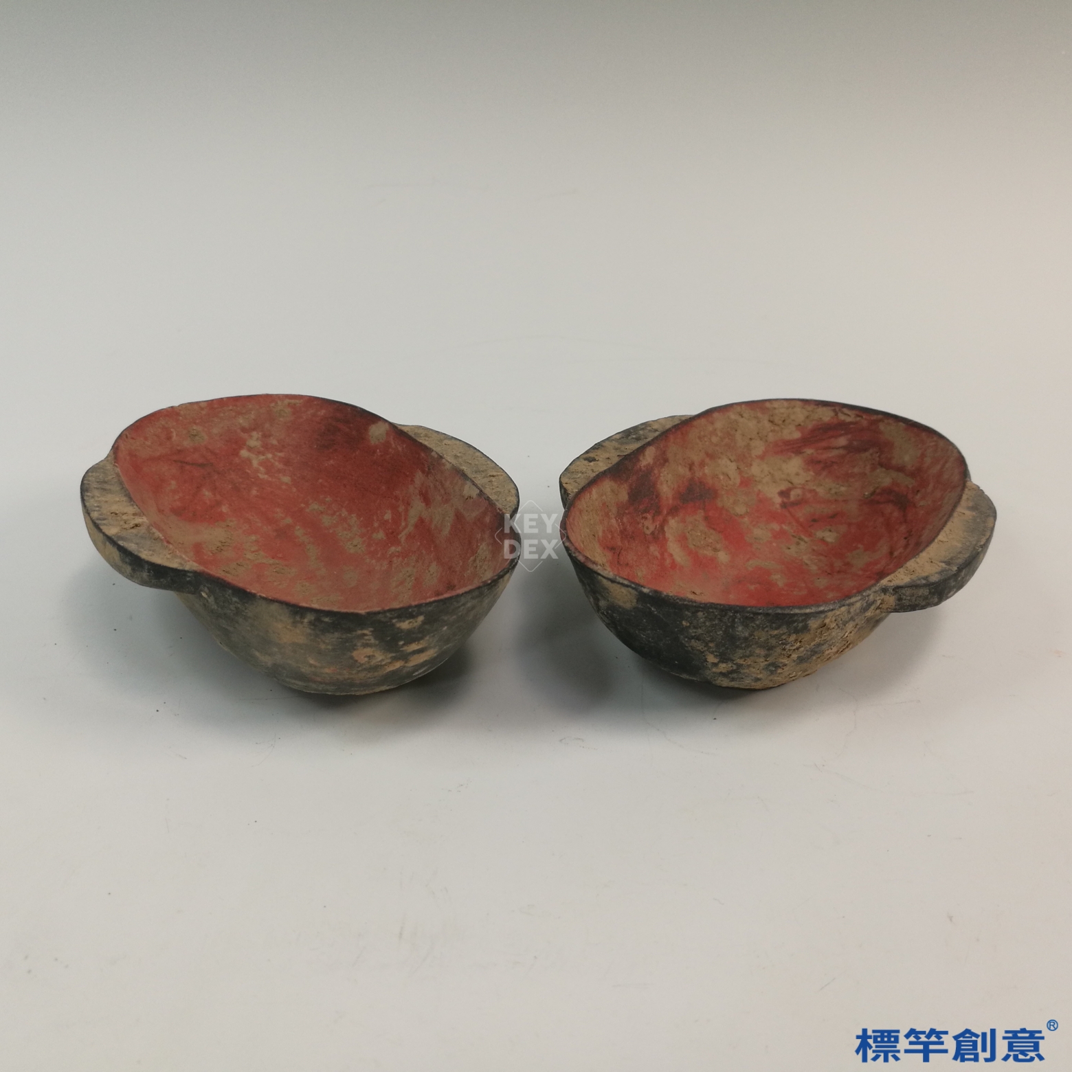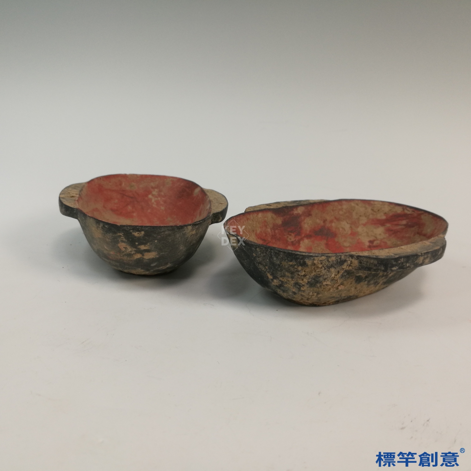 採細質泥土手工拍築或模製成形,器表經還原燒成形成黑陶質地,內壁則施以朱紅色礦物顏料塗層。雙耳貼附於肩部兩側,製作精巧,形似羽翼,為漢代羽觴風格之一。紅彩多有自然刷痕與氧化斑駁,增添古拙之趣。