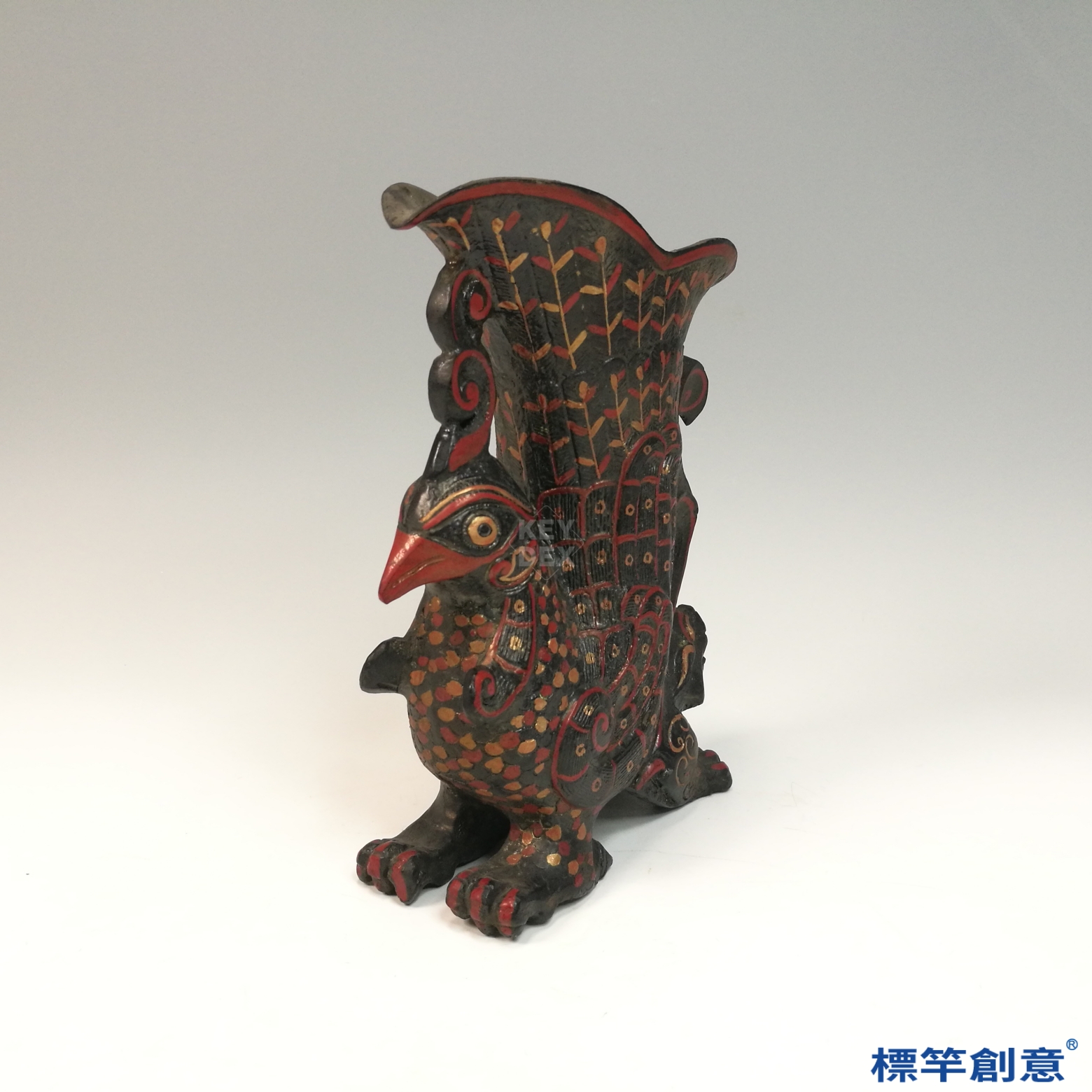 器物以銅胎為基礎,外層施以黑漆為底,再以紅、黃、褐等彩漆點繪羽紋與渦卷獸紋,局部綴以彩漆圓點,強化立體視覺效果。整體造形誇張富麗,色彩對比強烈,為漆工藝術之精品。