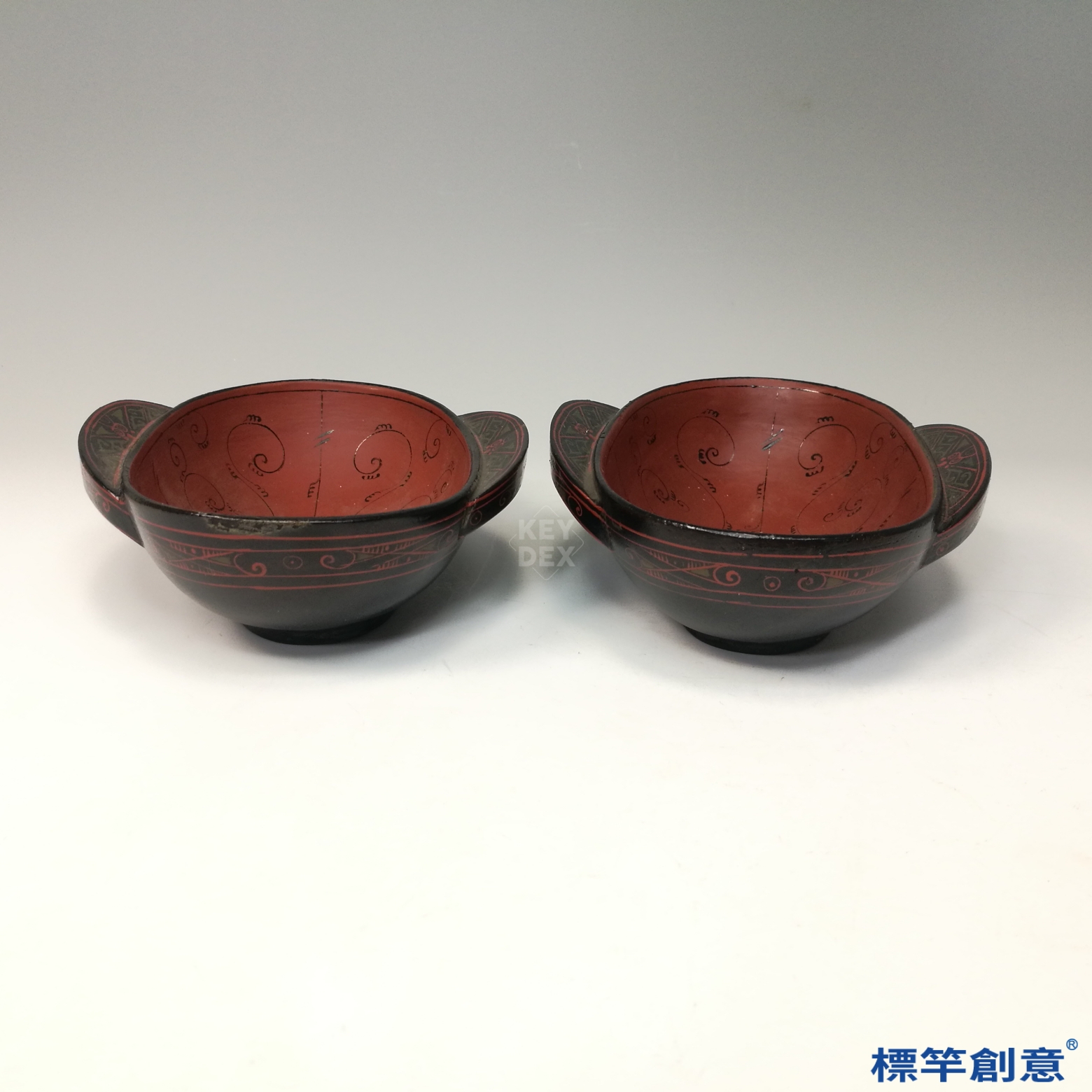 DB045 漢代麻布胎漆器紅地描玄紋耳杯一對