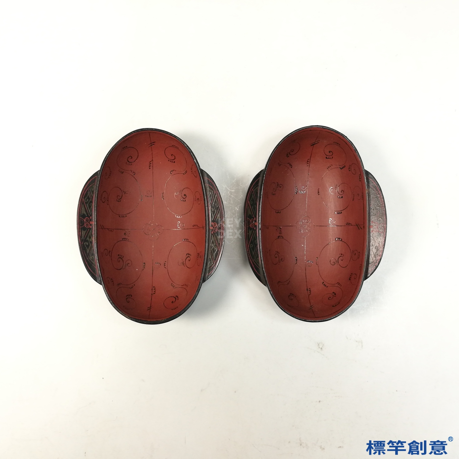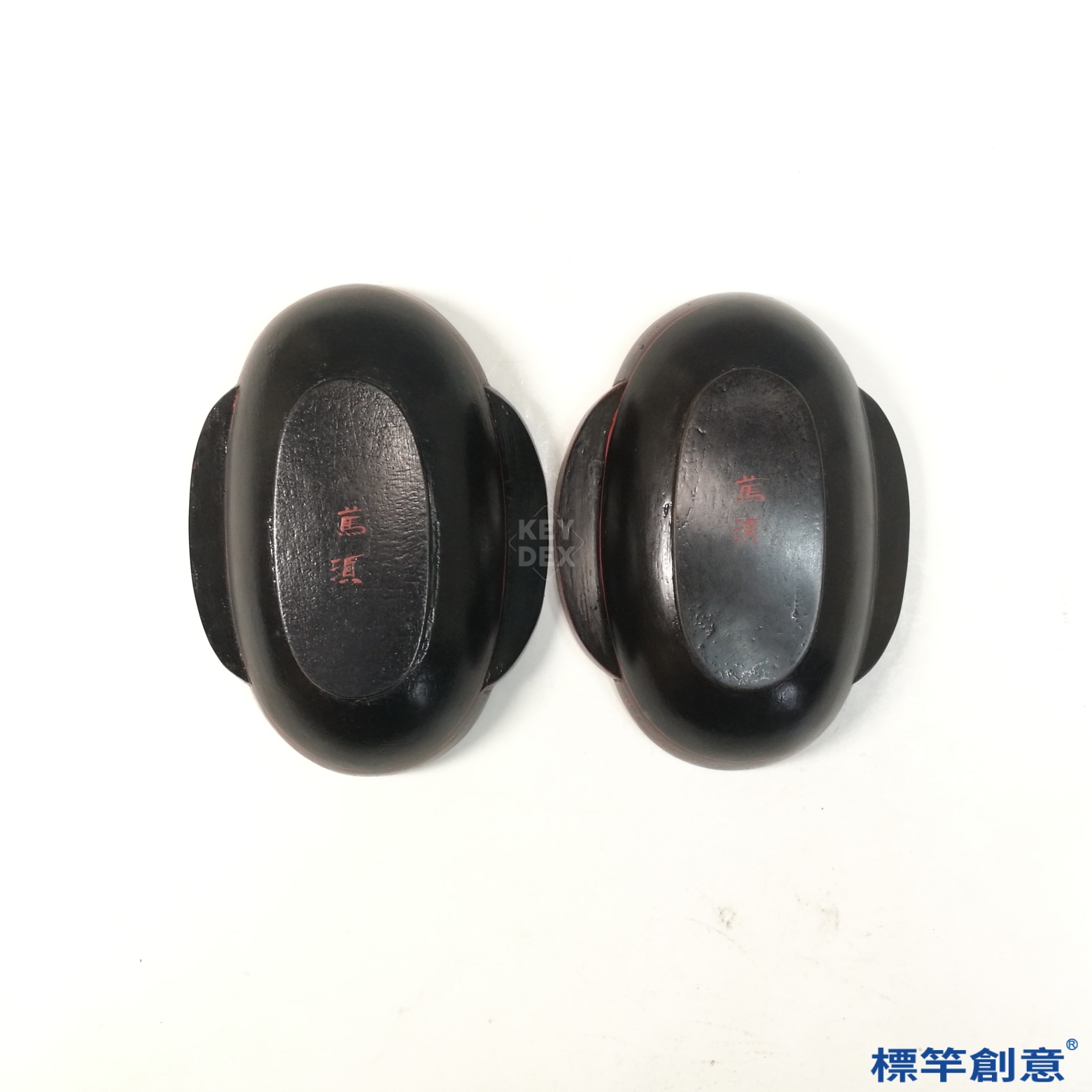 本組作品為成對漢代漆器耳杯,高4.8公分,長16.2公分。杯身橢圓,口沿兩側對稱伸出半月形耳柄,底部平整微凹。整體線條柔和優雅,比例勻稱,為典型漢代漆耳杯制式。