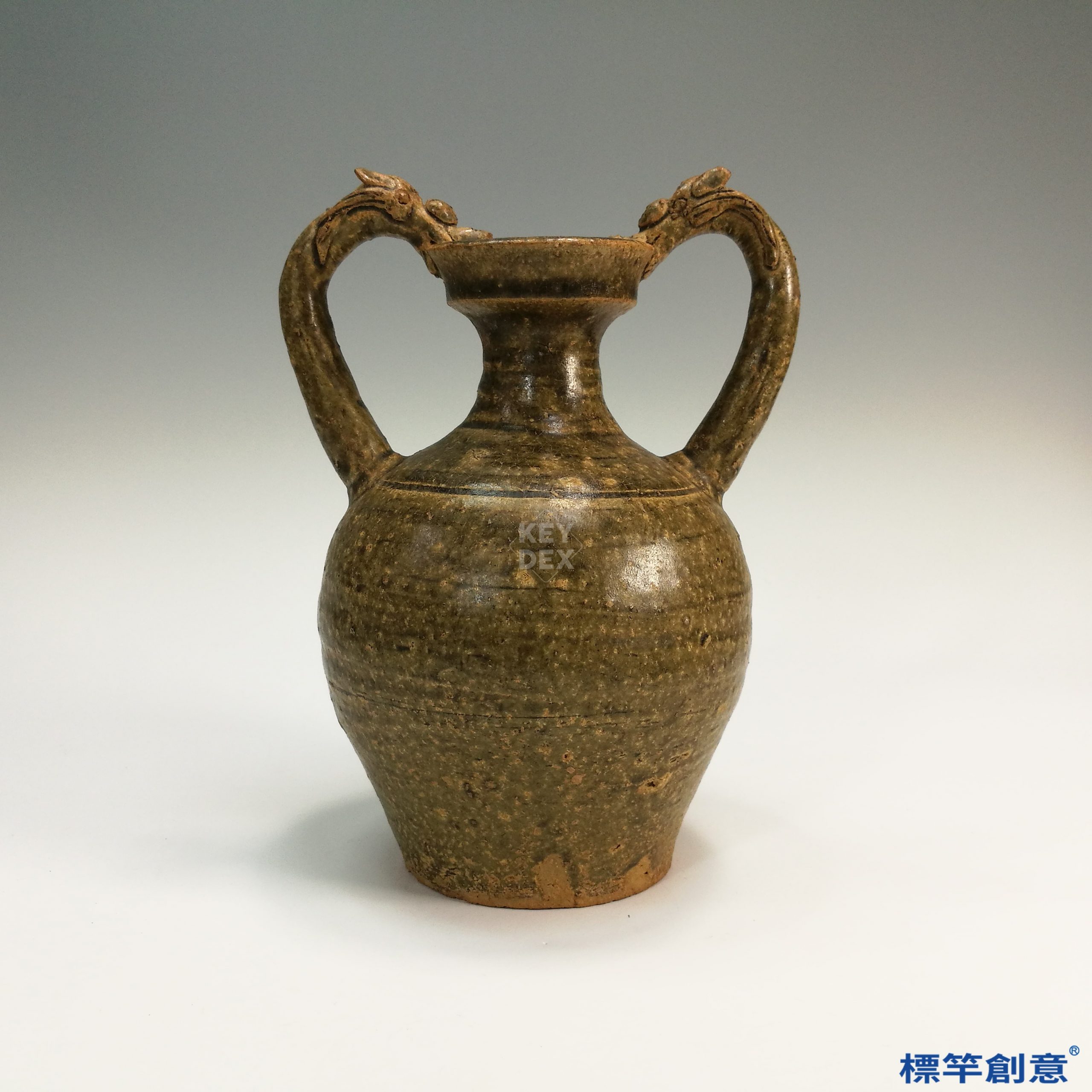 DE014 東漢越窯褐青瓷雙龍耳瓶