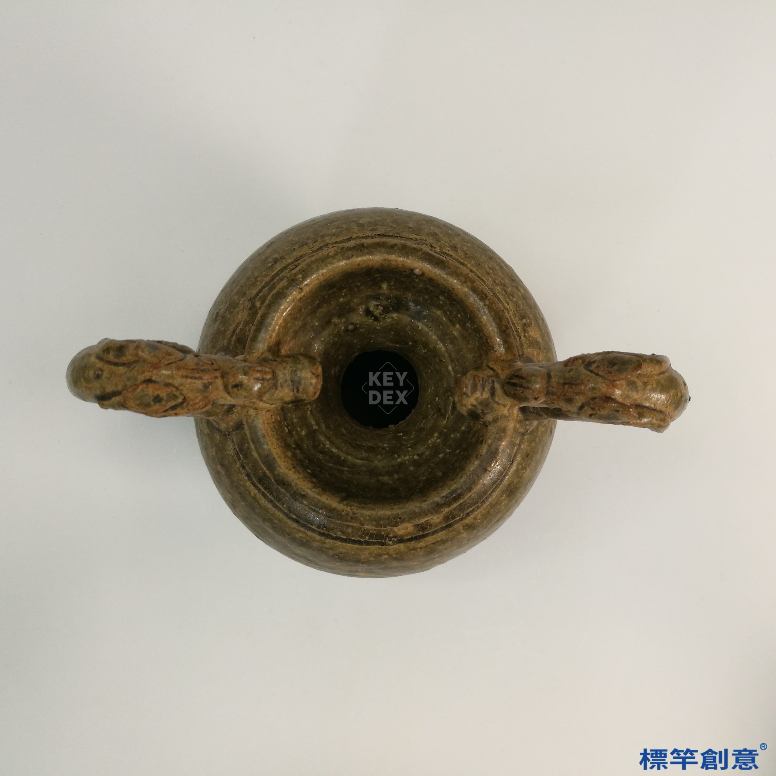以灰白色陶土拉坯成型後進行龍耳貼塑與整體修整,乾燥後施鉛質褐青釉,於約800–950℃低溫還原氣氛中燒製而成。器底圈足修整規整,露胎處可見氧化色變現象。