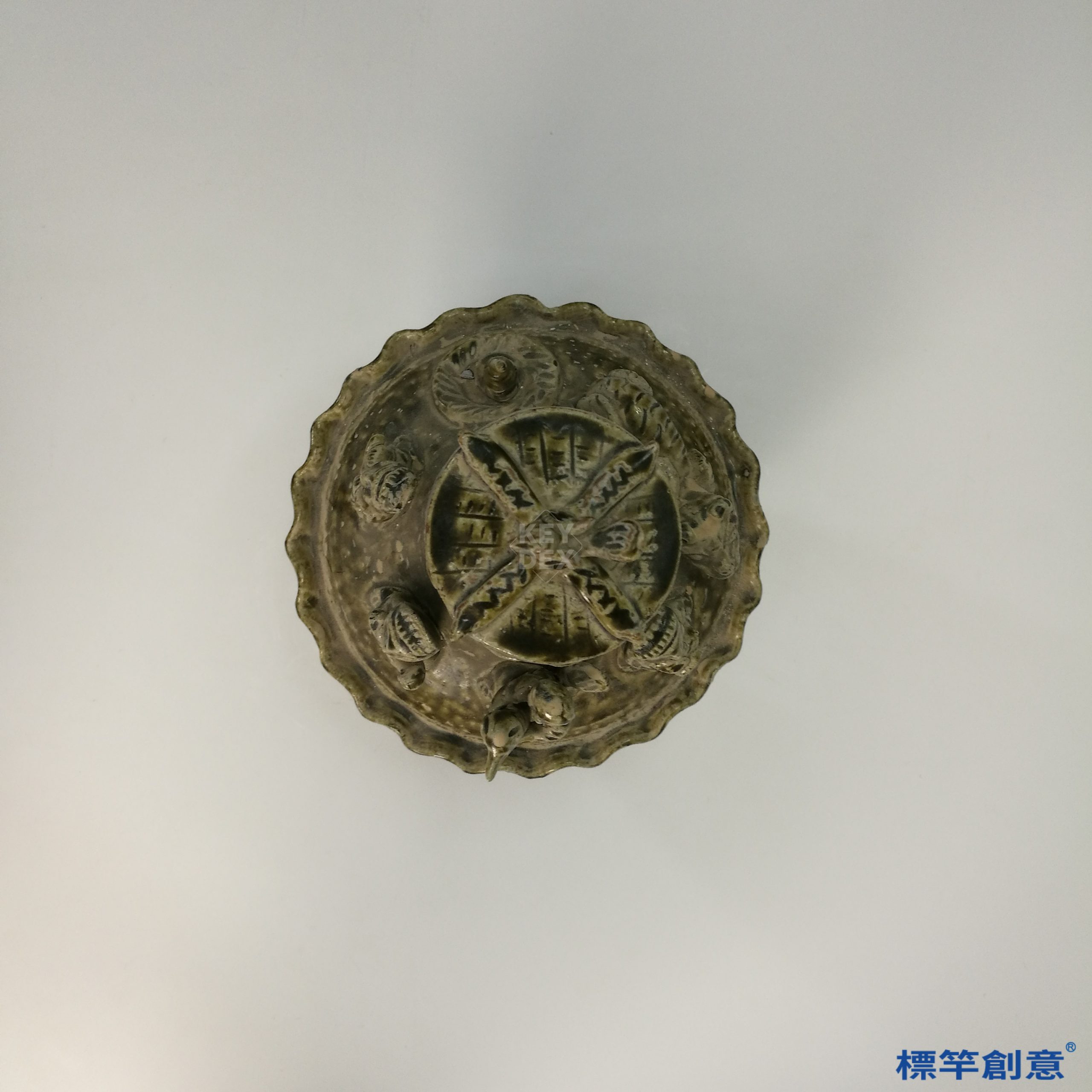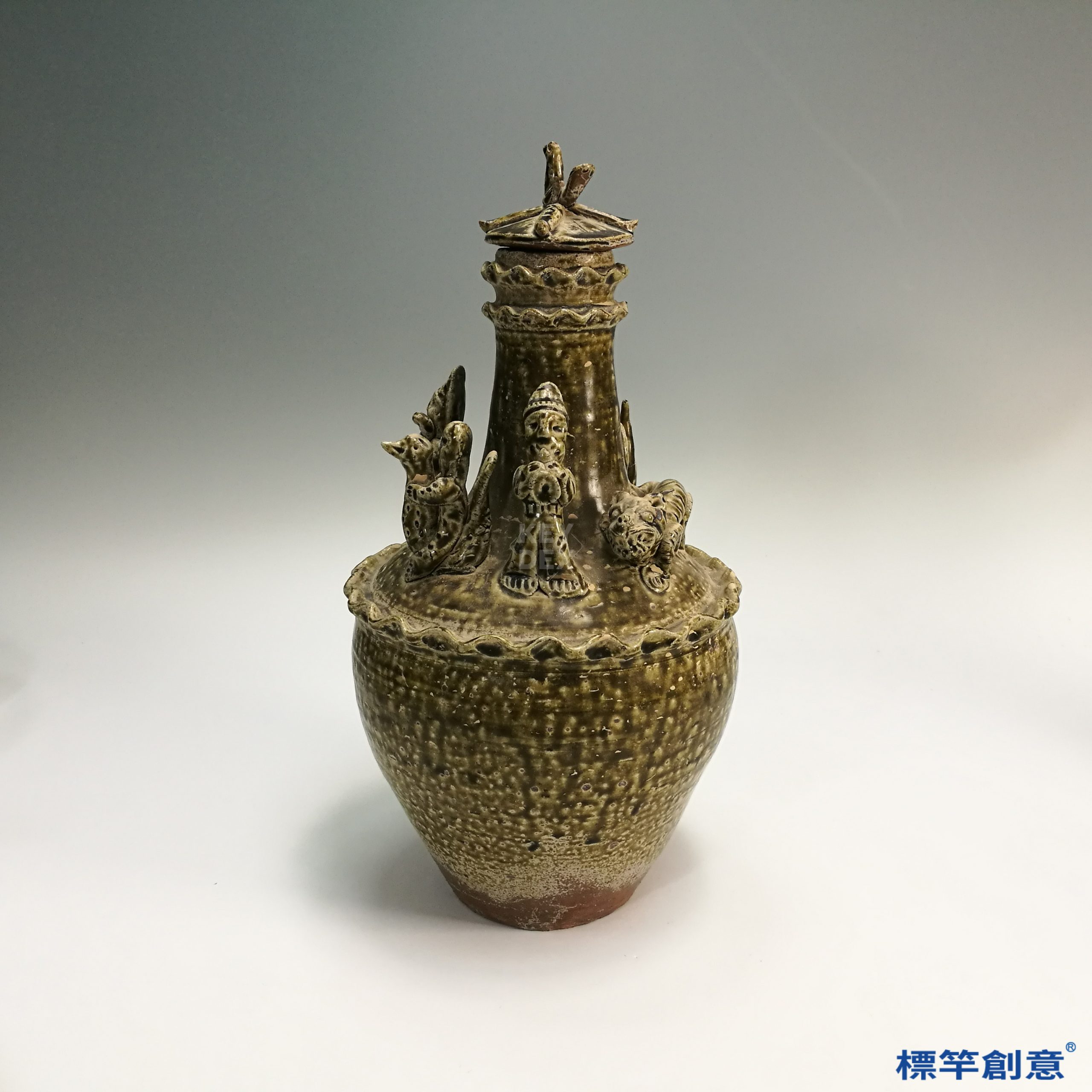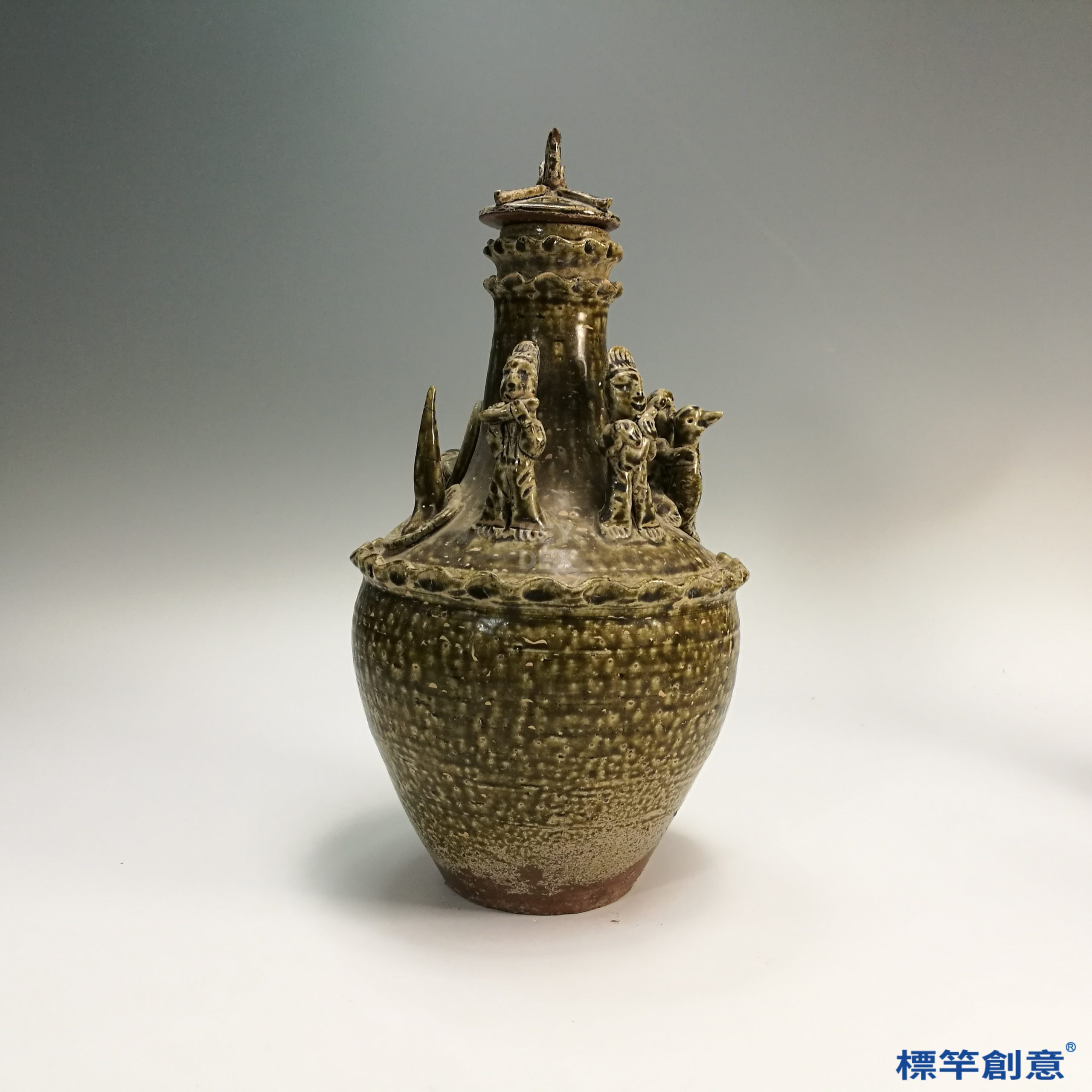 器身與蓋分別輪製與模塑成型,人物與鳥獸貼塑後再施褐青釉,於約900–1000°C的還原氣氛中一次燒成。釉面有自然釉變與局部斑駁,富手工痕跡與歷史感。