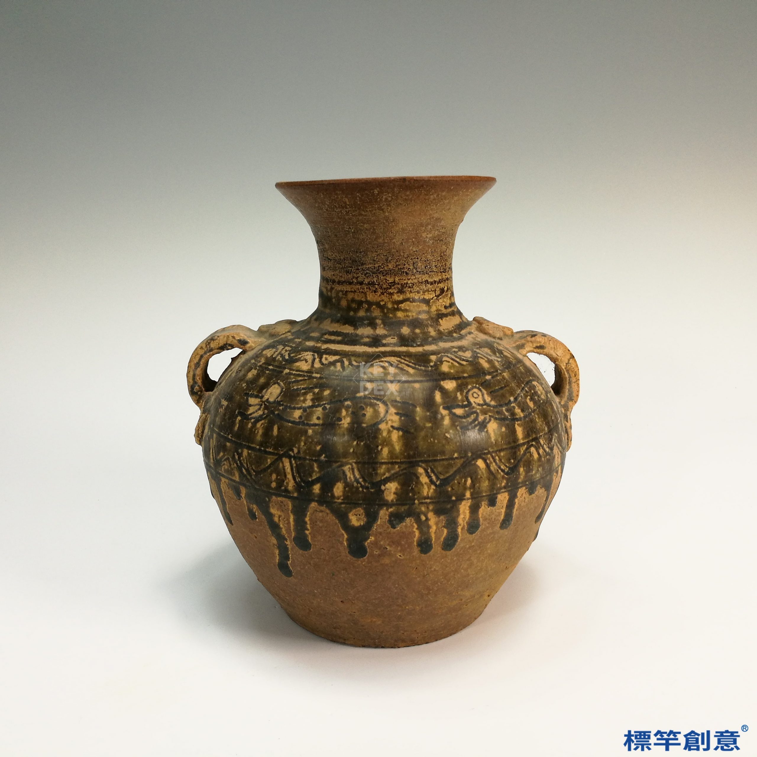 DE019 東漢越窯褐青瓷刻繪鳥紋雙耳罐