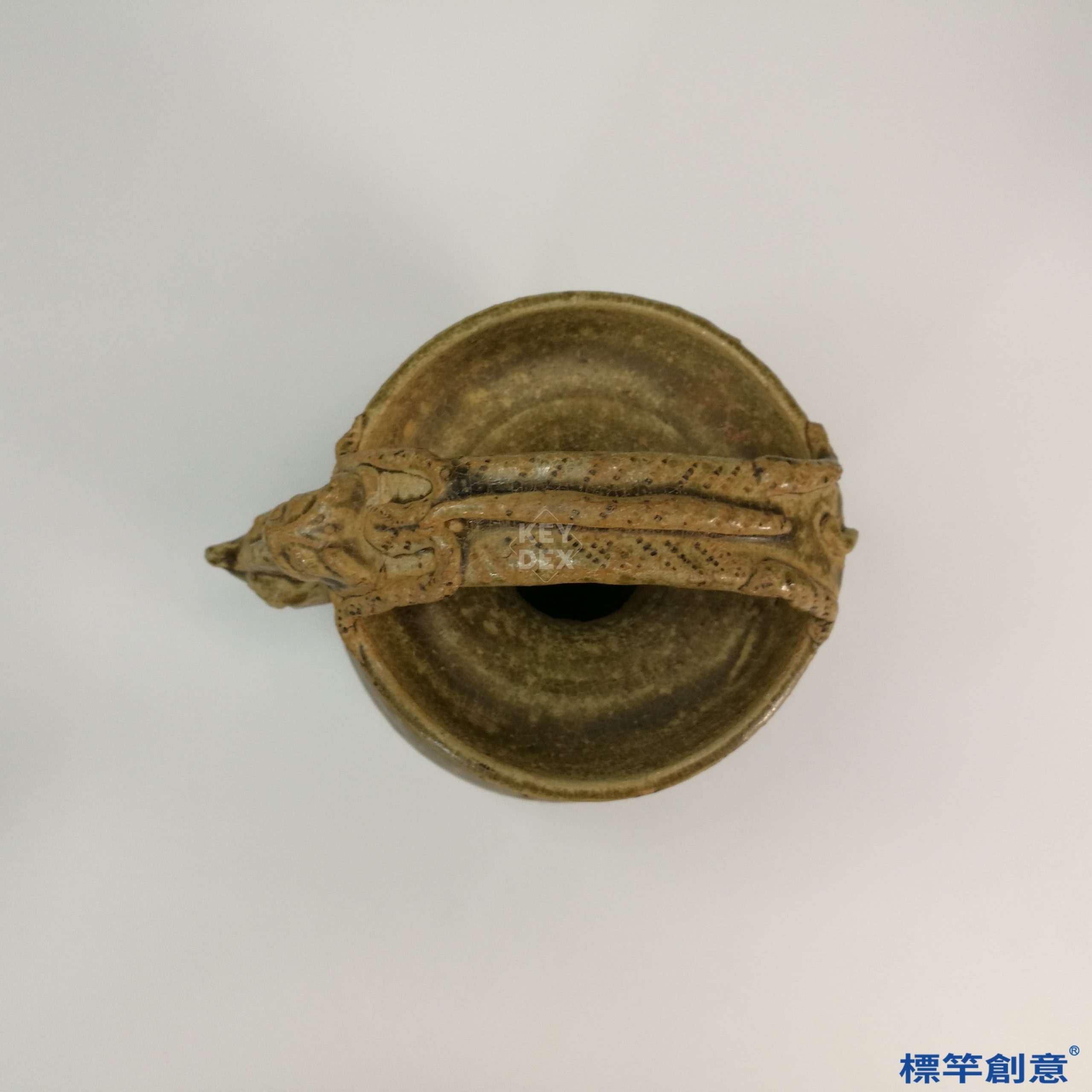 採分段製作工藝,先拉坯成型,再模印獸首與耳,黏合後整體施釉,一次高溫還原燒成。越窯在東漢時期已掌握穩定還原氣氛,使釉色呈現深沉褐青色調,具有早期成熟青瓷特徵。