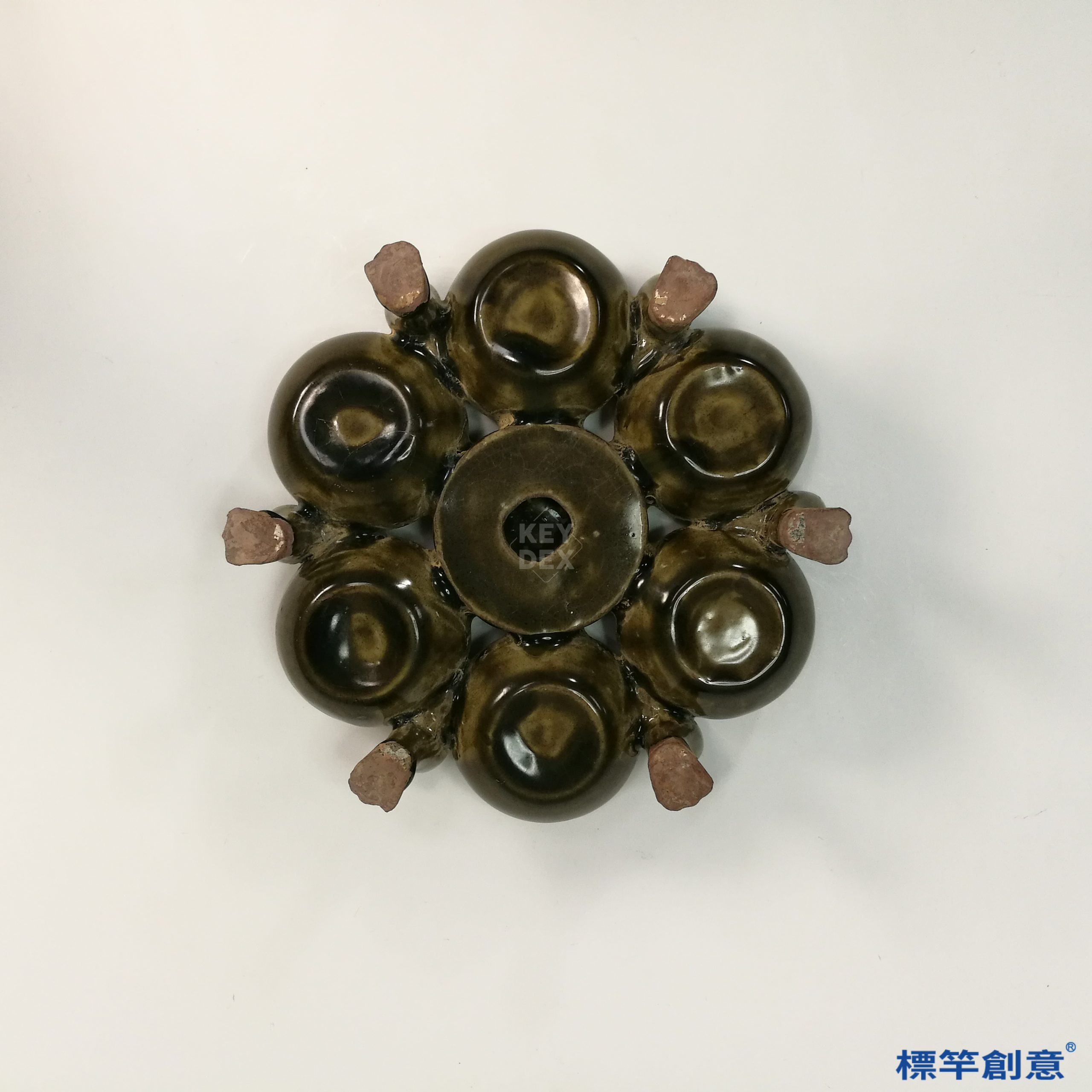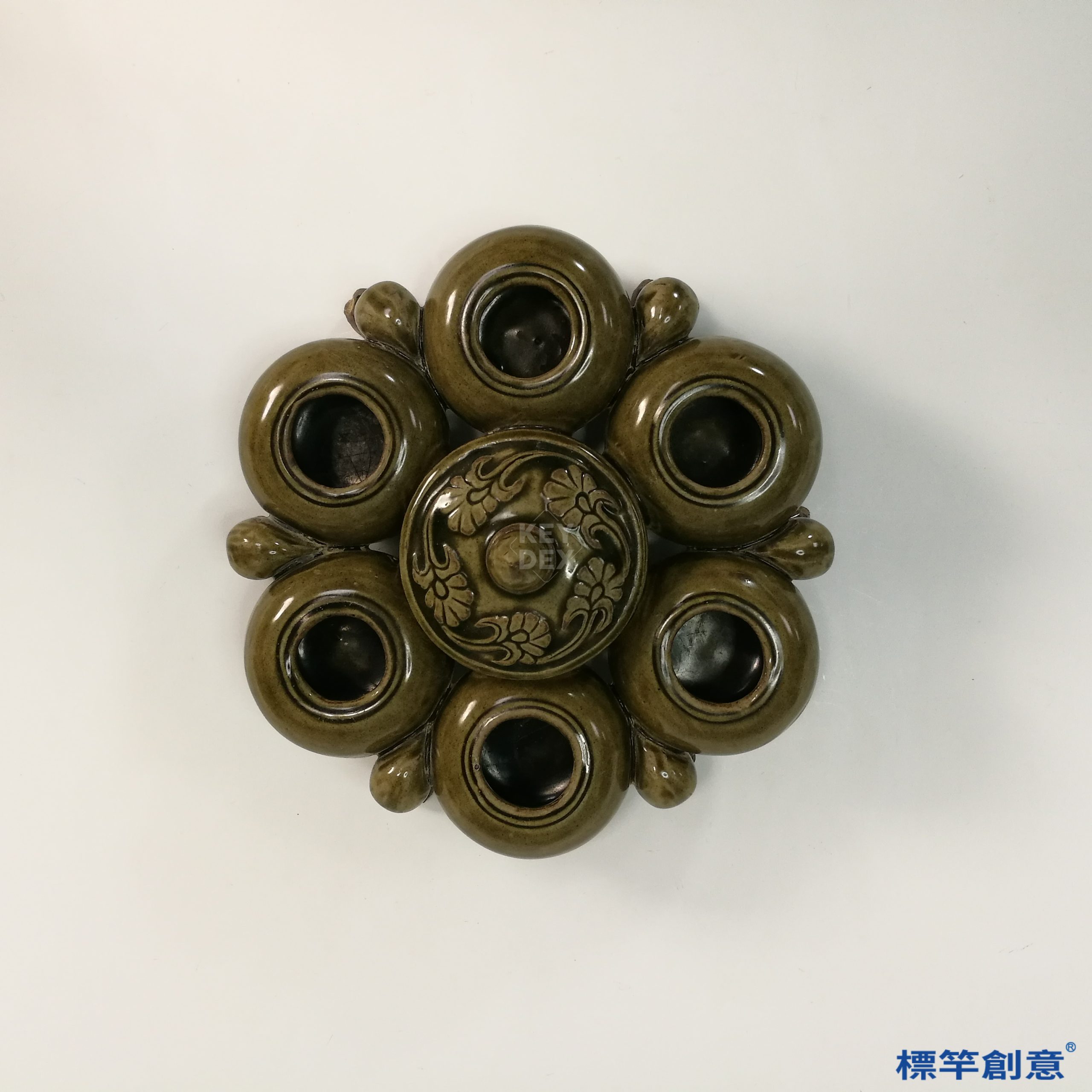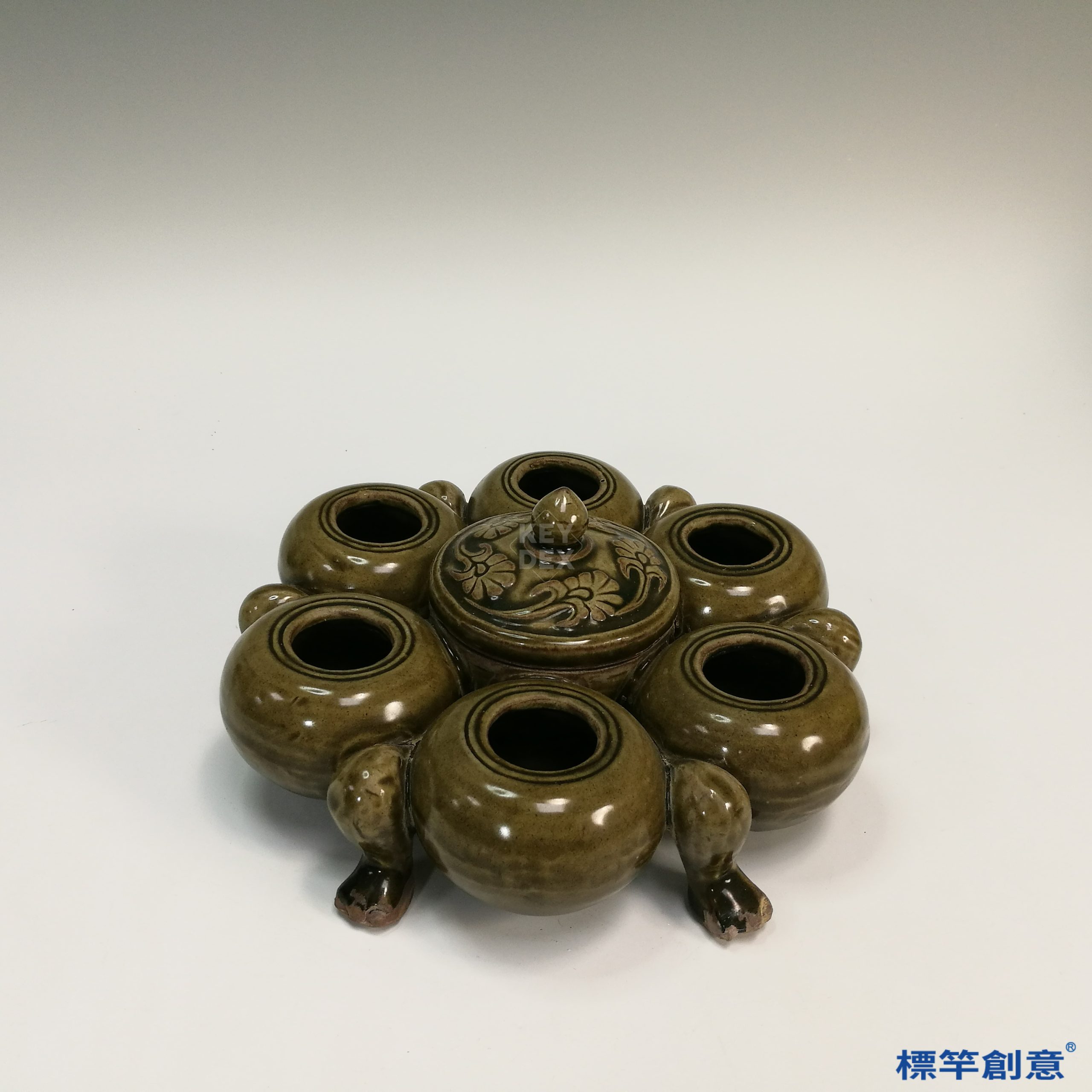 本器高9公分,最大直徑21公分,器形由中央主體與外圍多個小口環列構成,下承五隻獸足支撐。中心設蓋式開口,可作為筆洗主體,外圈均勻排列六個小口,各自獨立開孔,整體布局如六瓣蓮座,穩重對稱,極具文房器儀感。