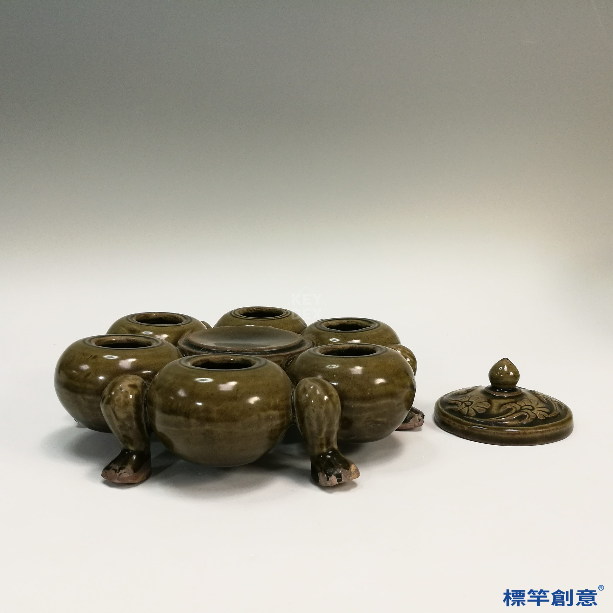 整器由多部分組件合模成型,獸足、主體與多口分段製作再黏接為一體。施釉後入還原氣氛中高溫燒成,溫度約攝氏1200度,釉層附著良好,色澤穩定,為越窯高階工藝表現之一。