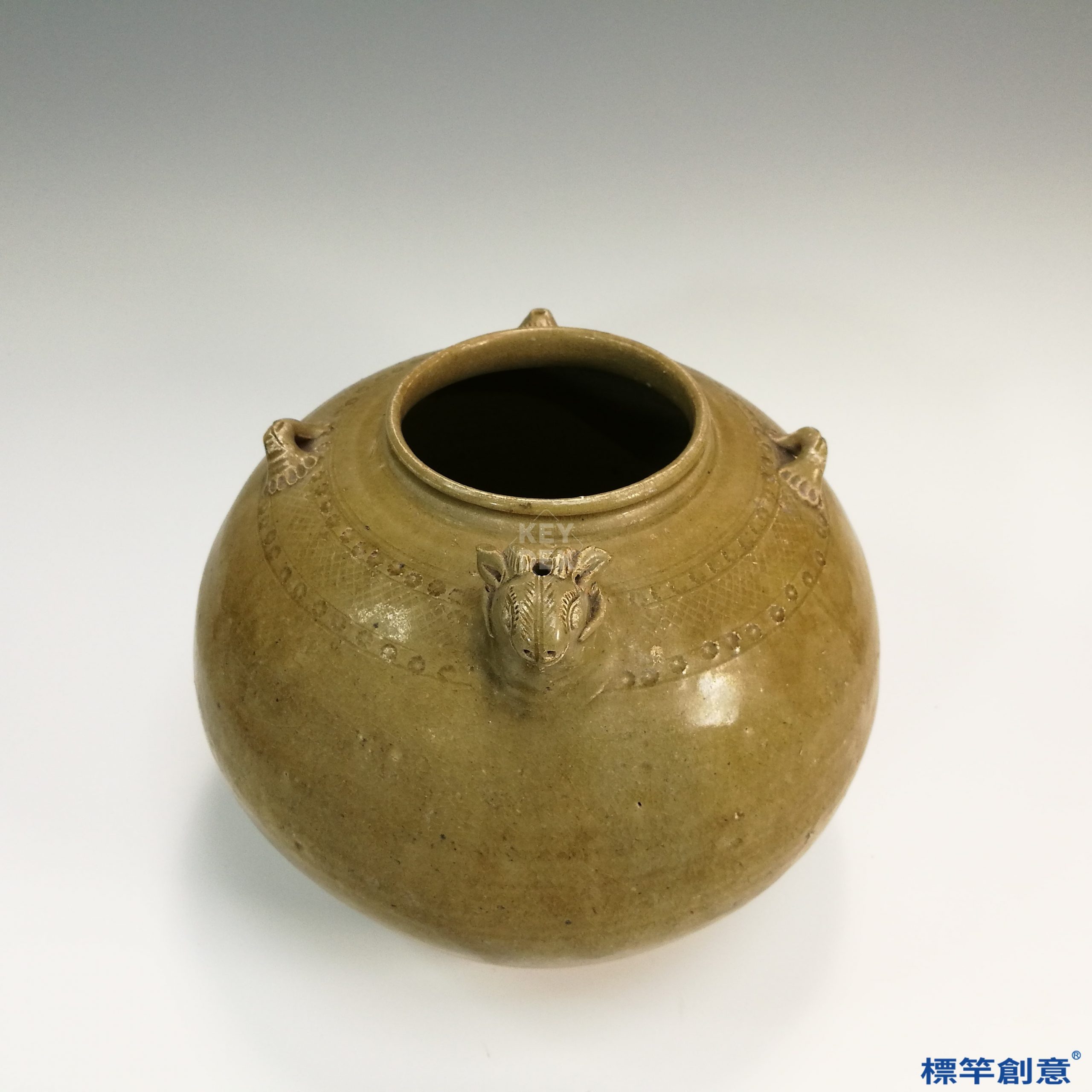 此罐通高25公分,腹最大直徑約29.5公分,器形呈圓鼓形,短頸寬口,口沿平整,肩部渾圓飽滿,器身下收至圈足。肩部對稱貼塑雙繫裝飾,繫端作羊首形象,生動細膩,具強烈立體感。