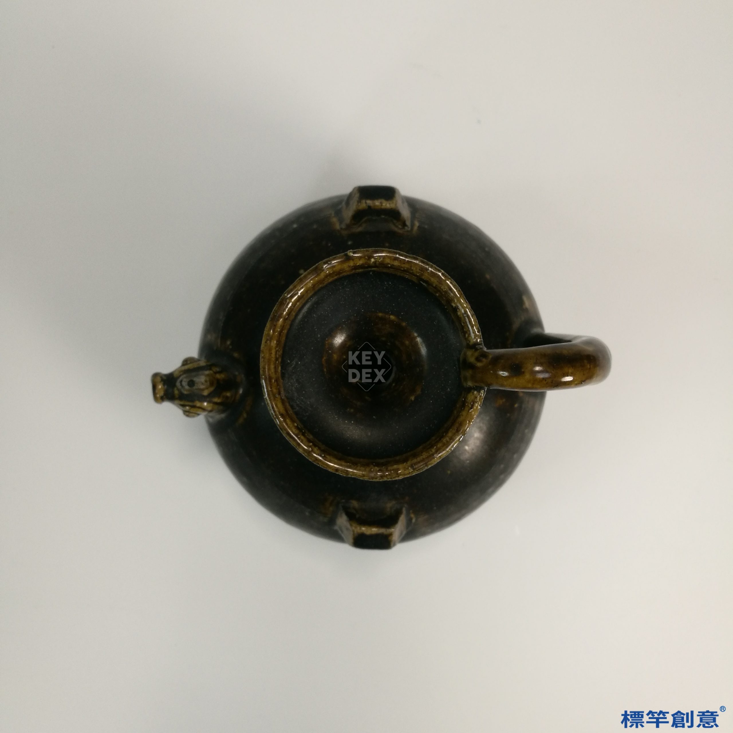 全器施黑釉,釉色厚潤沉穩,局部釉層自然流淌,器底露胎,呈灰褐色砂質胎,質地緊實。雞首為模印成形,五官生動,具有象徵意涵。雙繫耳與壺把成三點支撐,使提攜與繫綁攜帶皆具實用性。