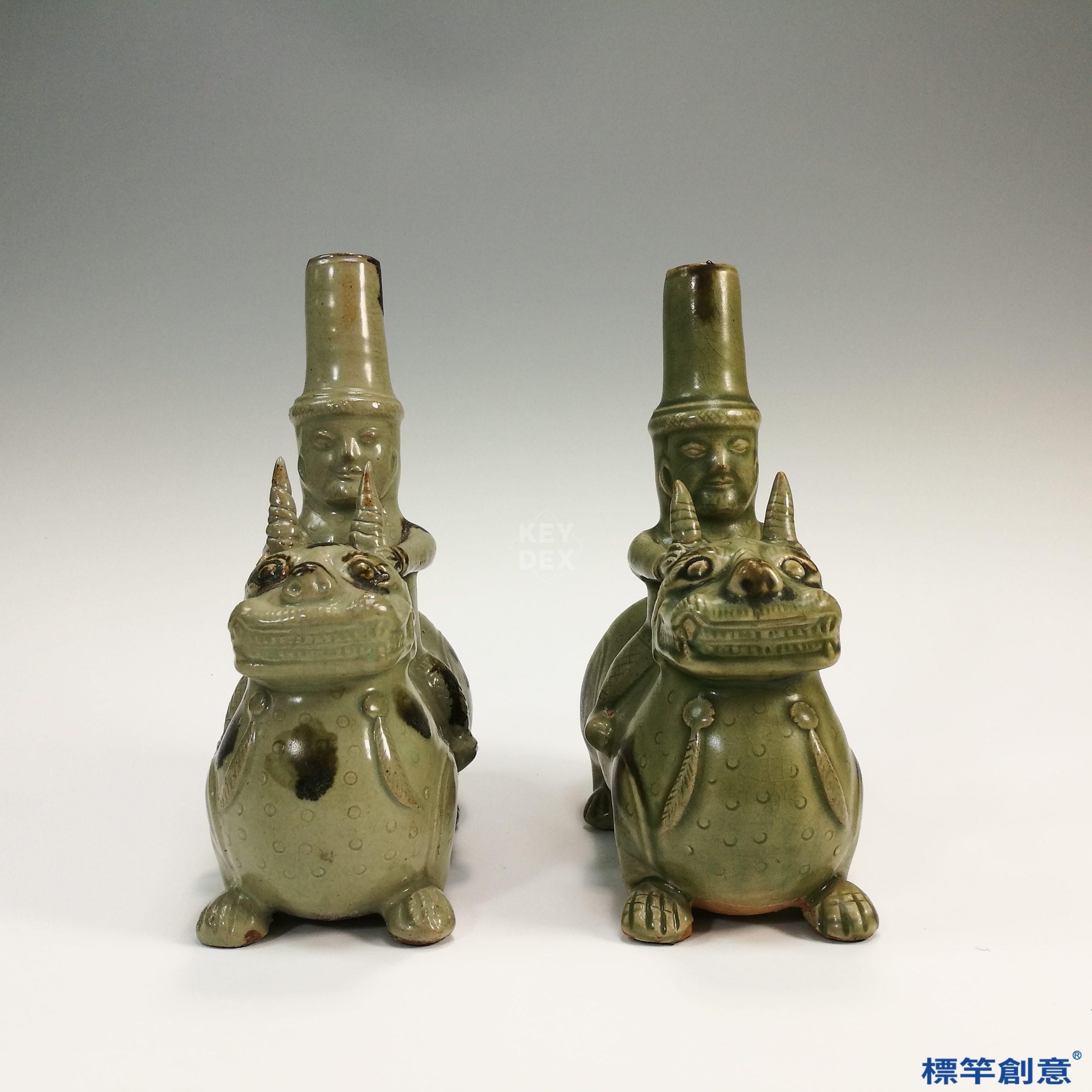 EB019 晉代越窯土青瓷胡人騎辟邪燈台一對