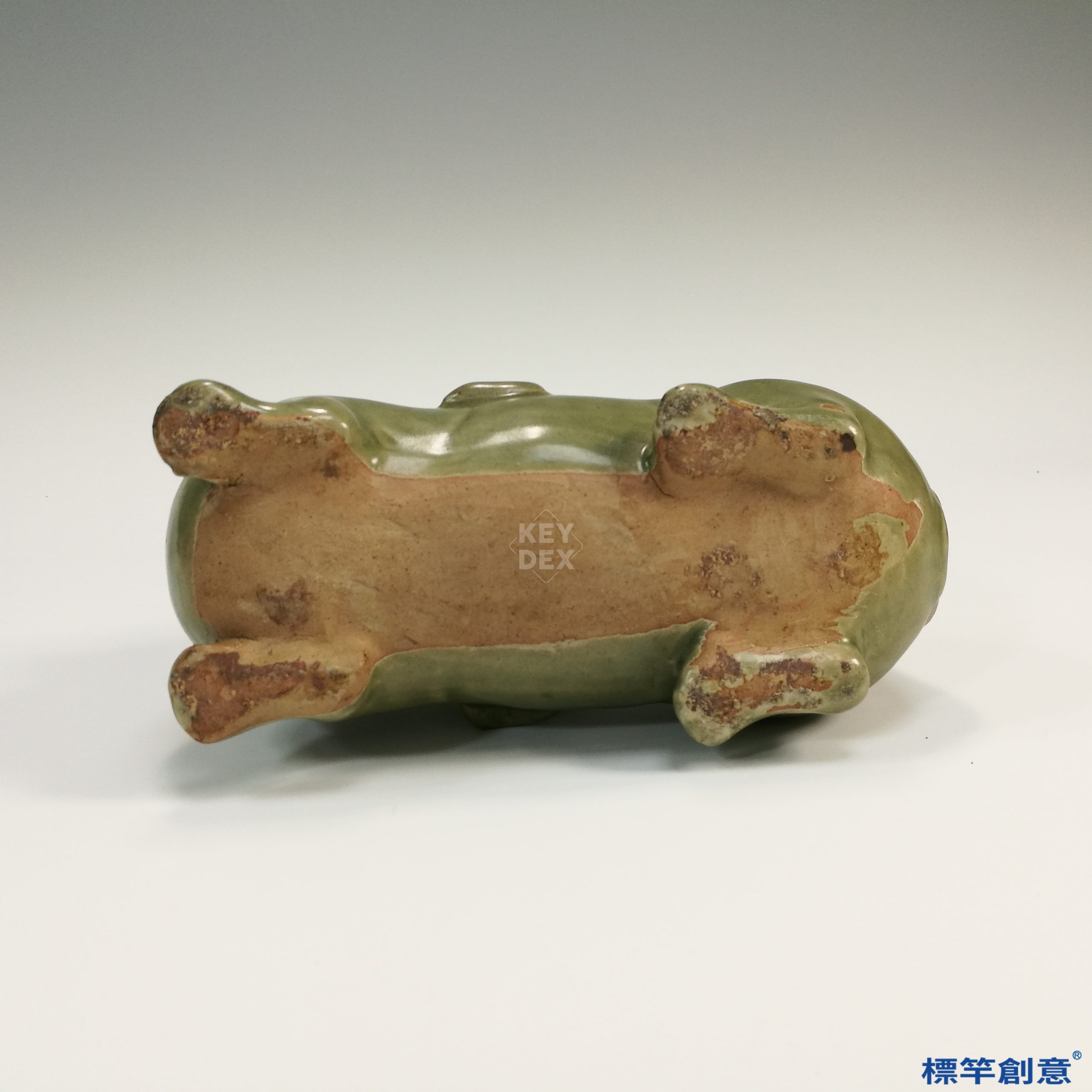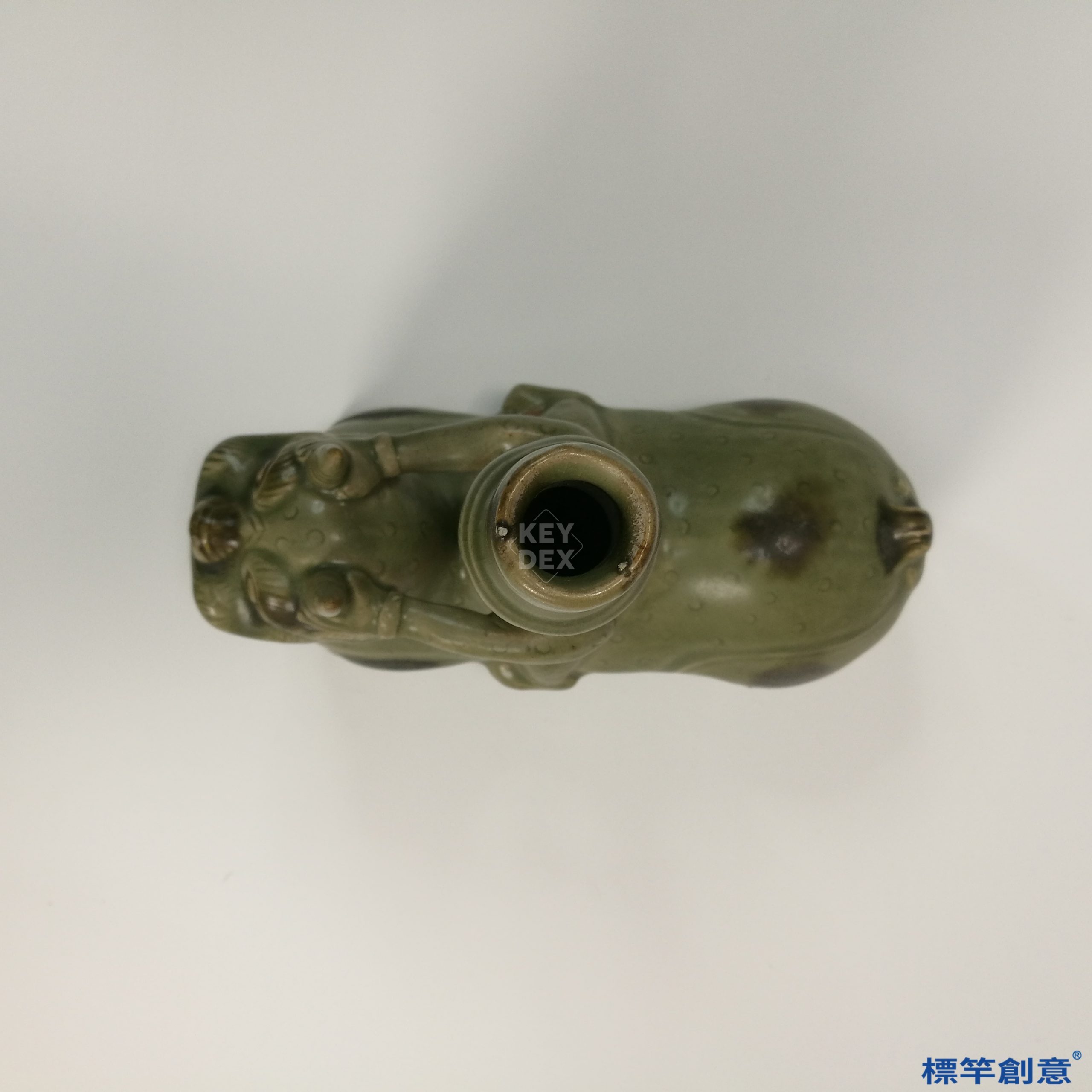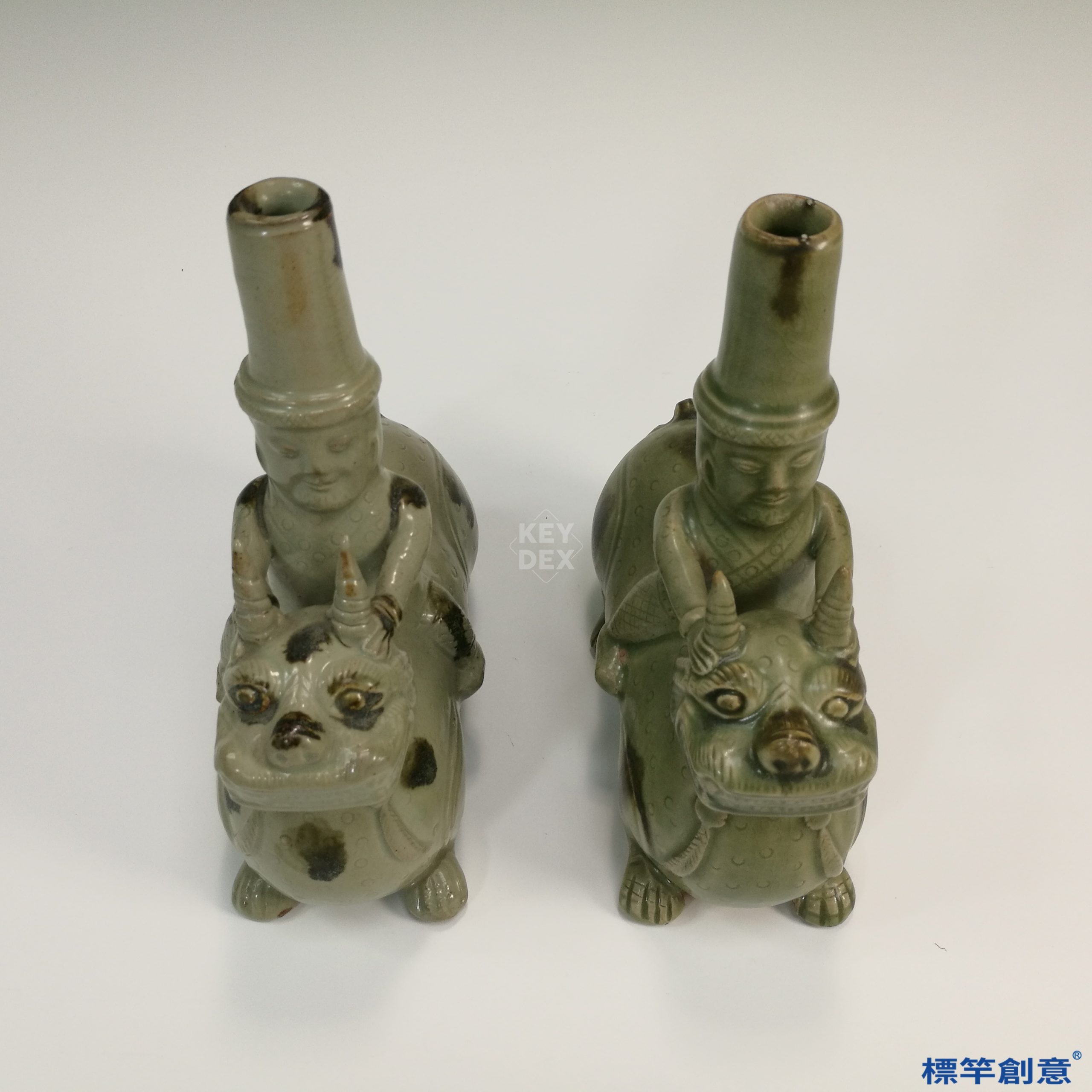 全器施罩一層色澤柔和的土青釉,呈灰青至淺青綠色,部分部位見釉下鐵斑點,屬於還原燒成下青釉的自然變化。騎獸形象以模製與貼塑成型,再進行簡單刻畫,輪廓分明,表情生動。燈盞座為上下通筒結構,具有導光通氣功能,實用與藝術兼具。