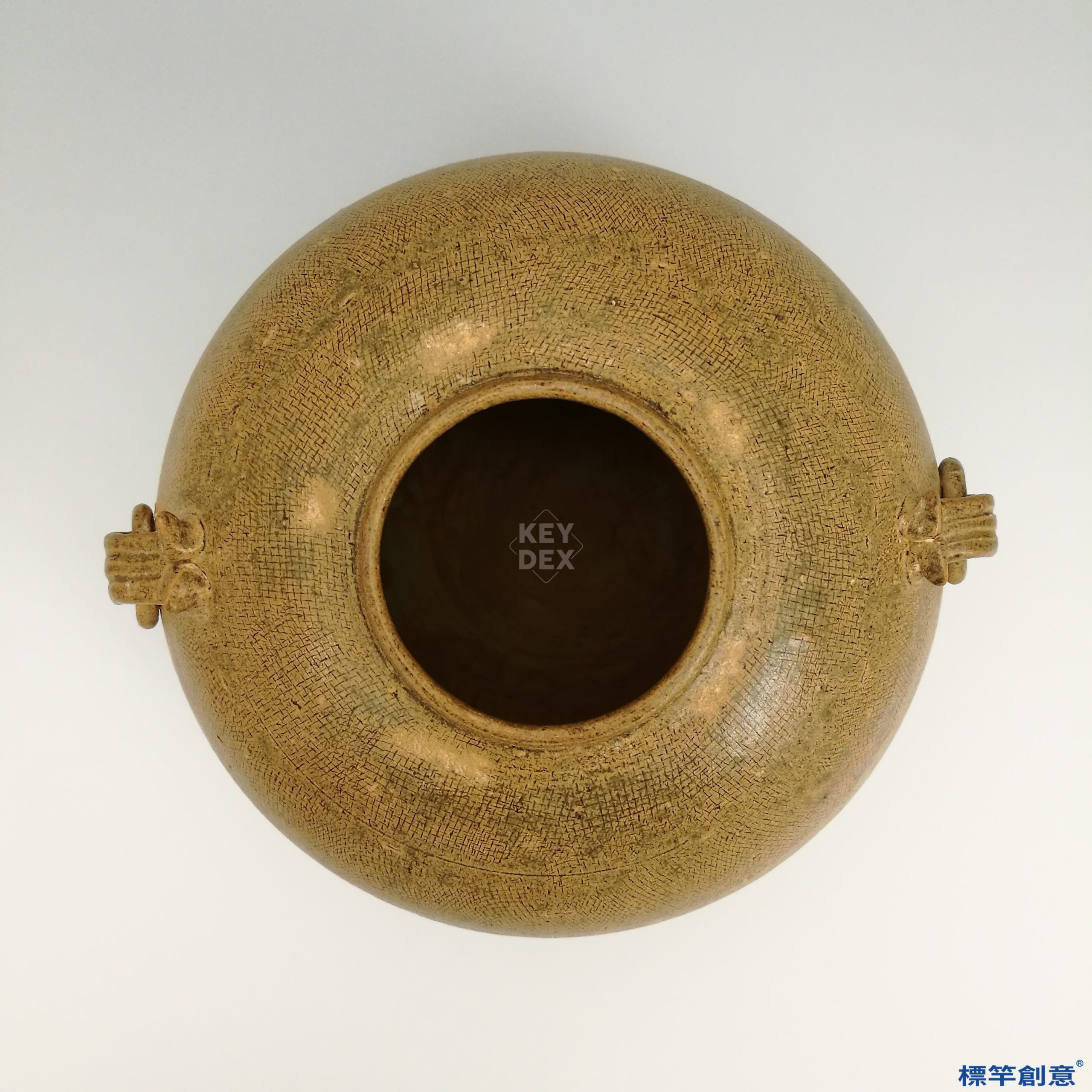 本器以輪製成形,肩部貼塑獸耳與銜環,腹部布紋以壓印模具連續壓製,乾燥後施黃釉入窯燒成。越窯黃釉屬高鐵釉料,經還原氣氛燒成後呈土黃色至橄欖黃,燒成溫度約在1200℃上下,釉面穩定且貼合胎體。
