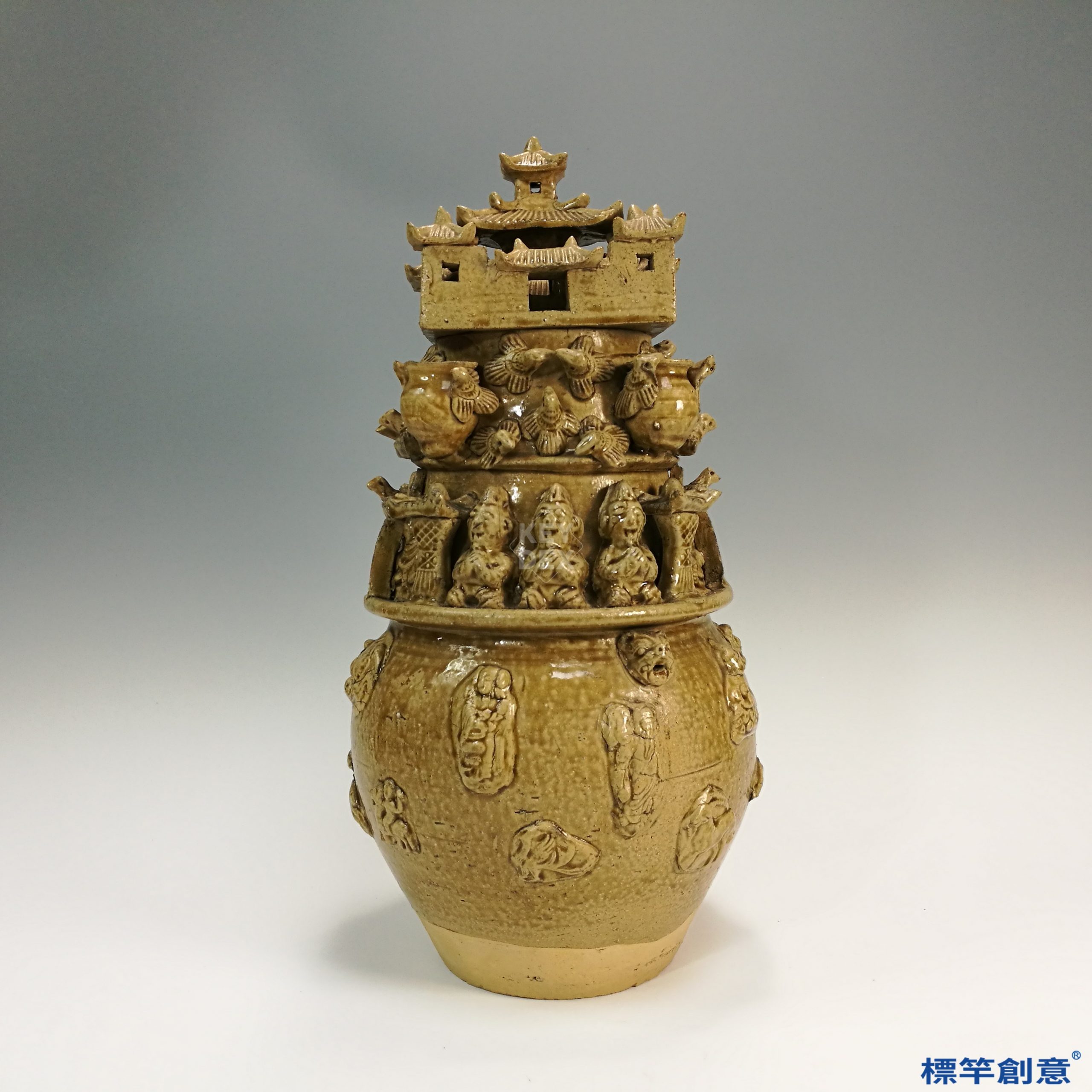 EC006 西晉越窯土黃釉貼塑樓閣人物穀倉罐魂瓶