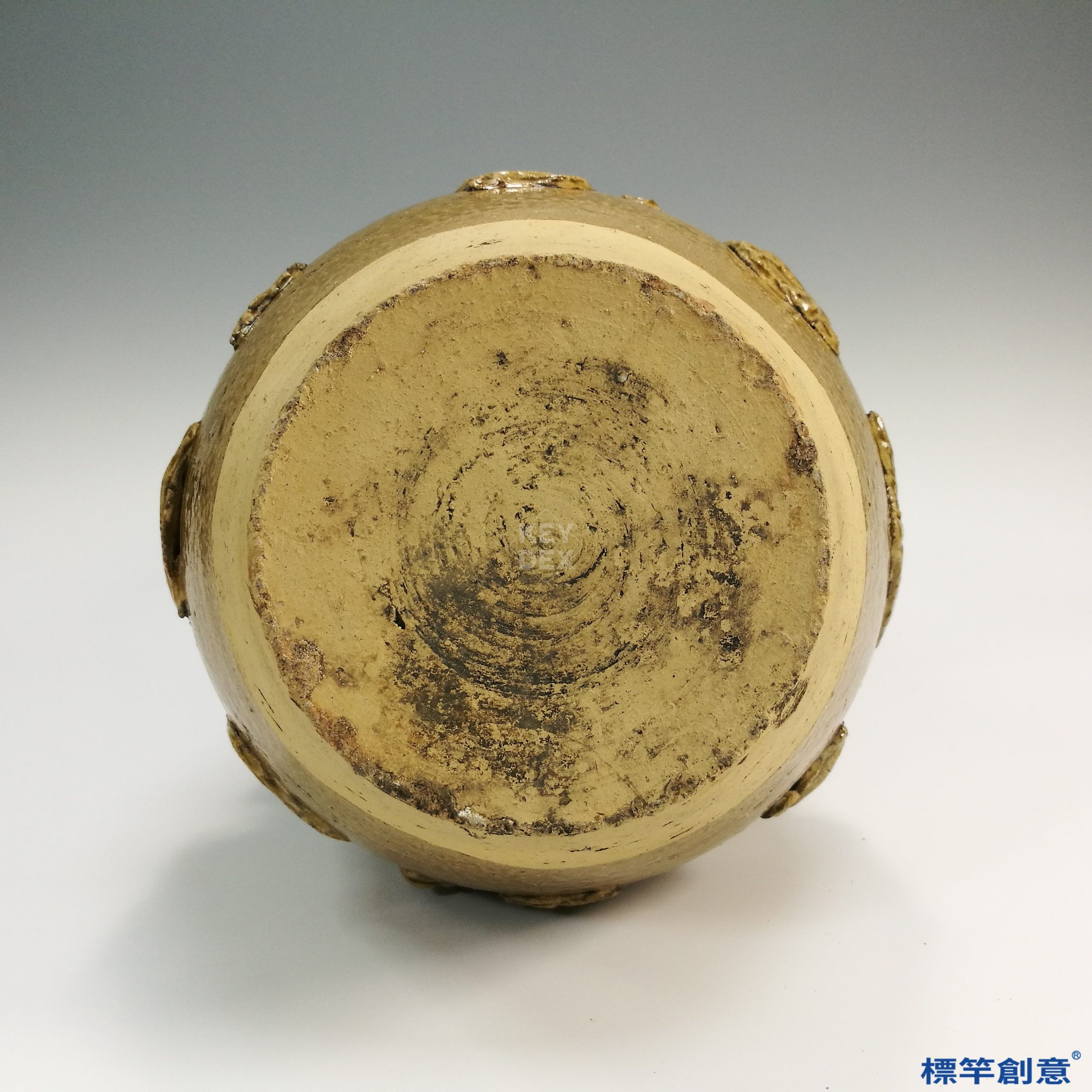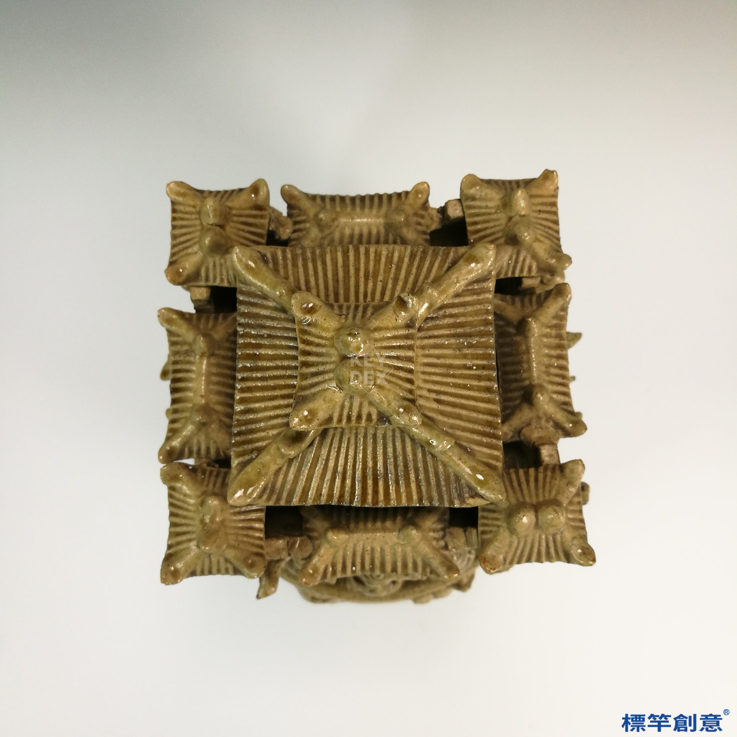 整體採分段成型、貼塑裝飾再組合入窯燒成之技法。胎體先燒呈堅實後覆掛釉料,於氧化氣氛中高溫燒製,釉色呈土黃至褐黃之間,表面晶瑩而穩定。