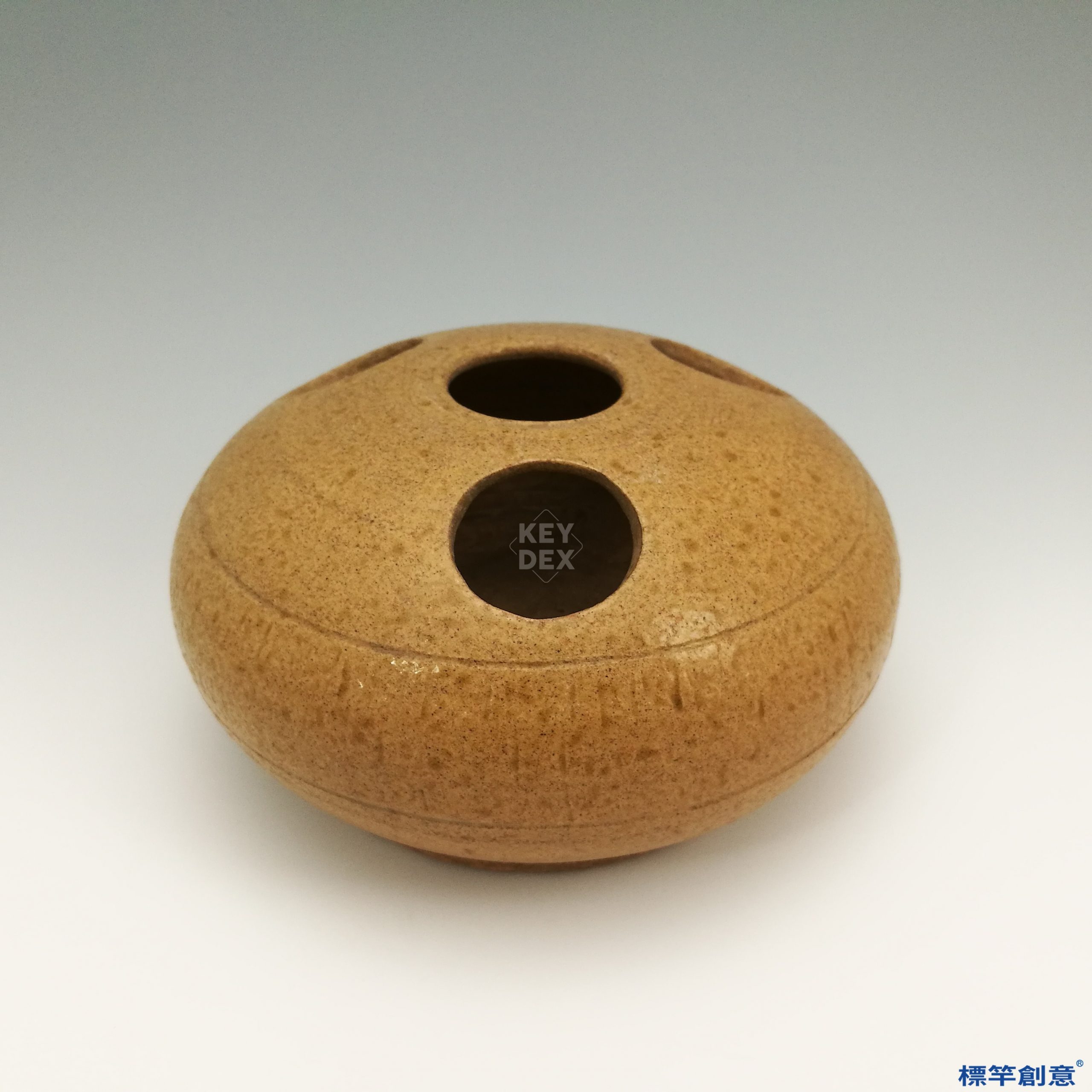 高 8 公分,最大直徑 15.5 公分。整體呈扁圓形,外觀似「墩」形,底部外撇圈足穩固,頂部設有四個等距分佈的插孔,中央一孔略大於周圍三孔,線條簡潔,器形沉穩渾厚。