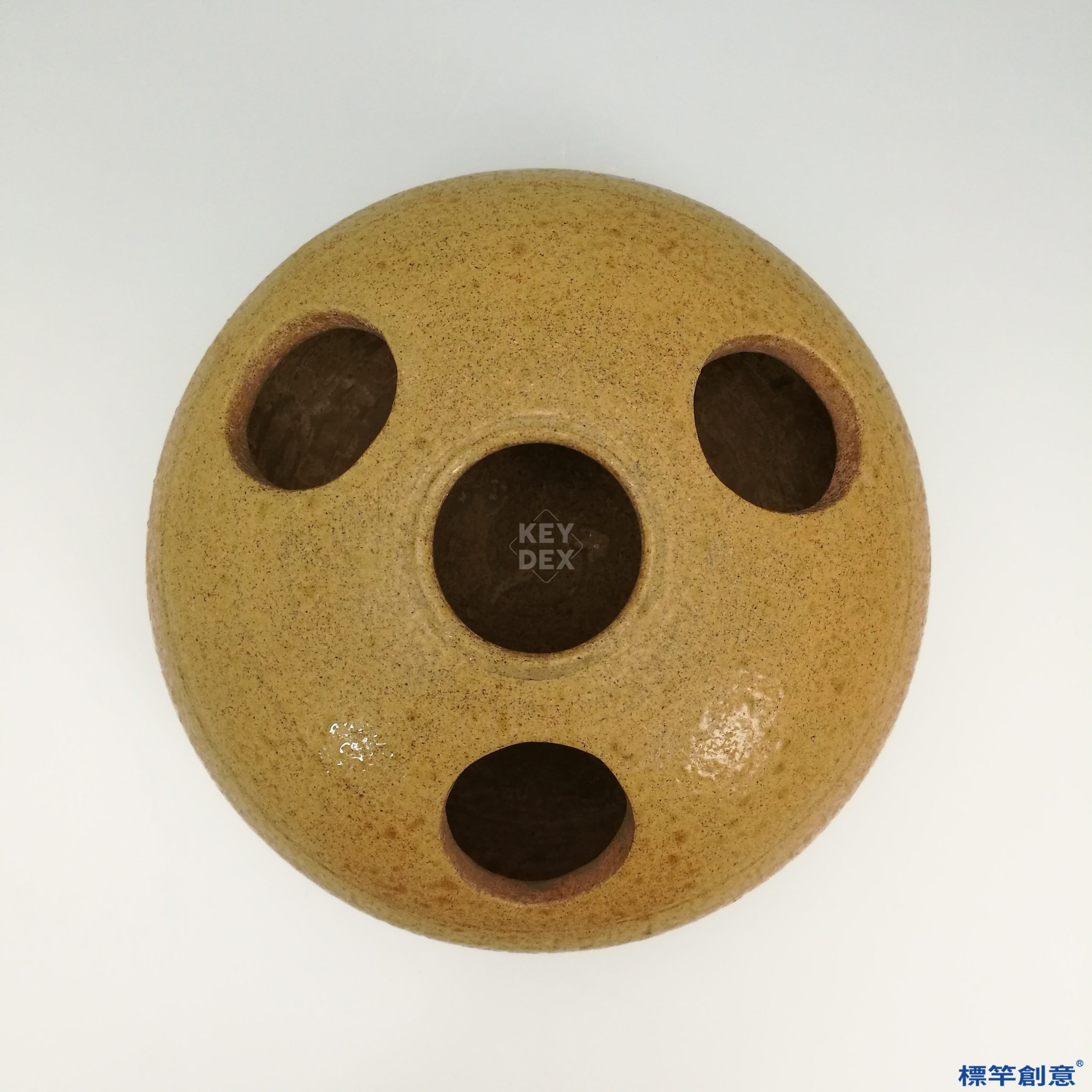施釉為黃釉,色澤淺黃泛褐,釉面略帶細小開片,光澤柔和。器表無任何貼飾或刻劃,通體素面,以造型取勝。插孔內緣打磨圓滑,製作工整,為兼具實用與審美的設計。