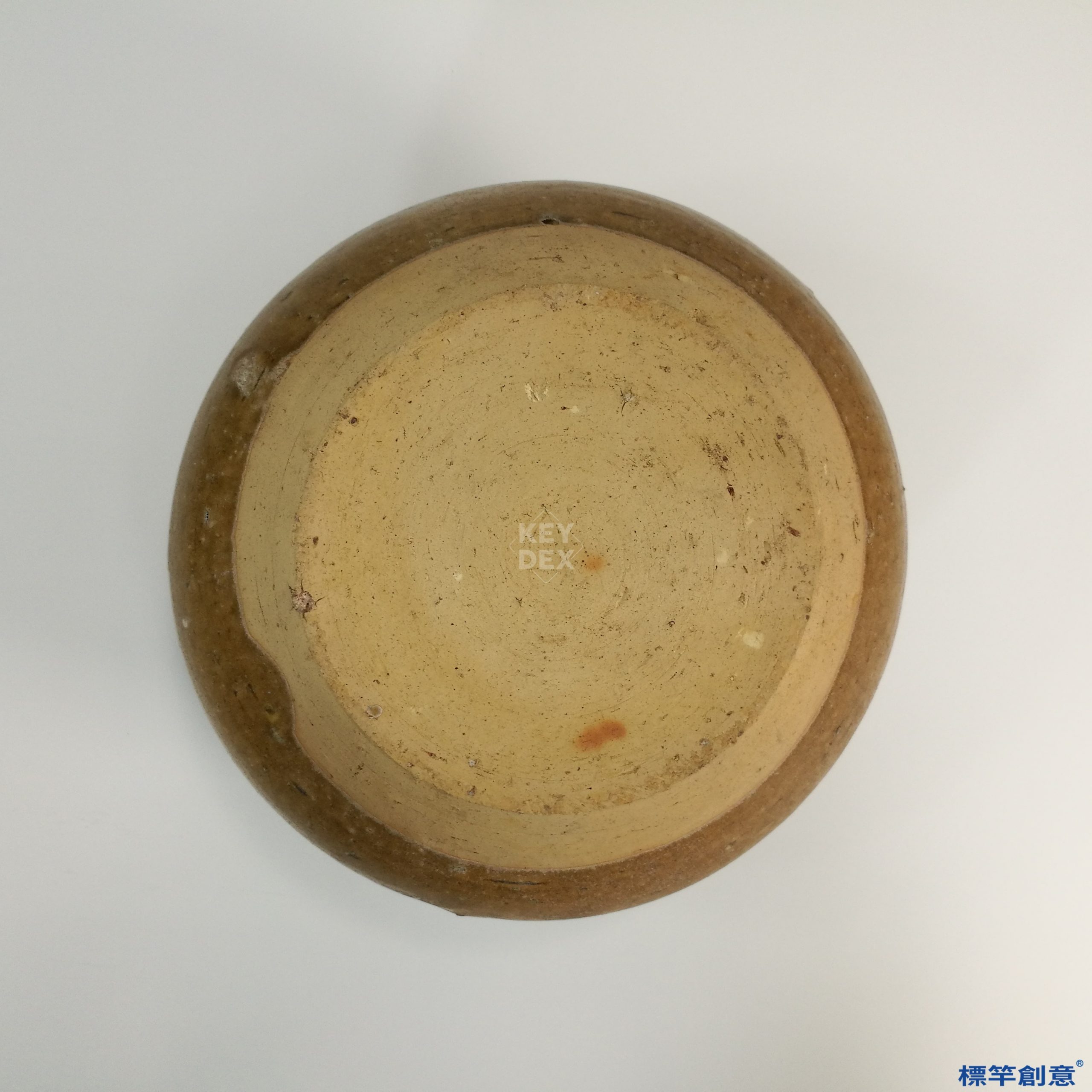 通體施褐青釉,釉色偏褐黃,光澤沉穩,屬越窯中後期常見釉調。蛙與魚均以模製後貼塑於器表,比例得當,構圖巧妙,展現手工貼飾與立體雕塑技法之結合。貼飾施釉均勻,釉層流暢自然,局部可見窯變與開片痕跡。