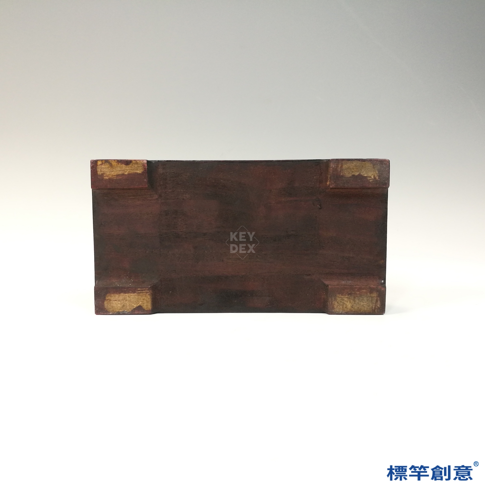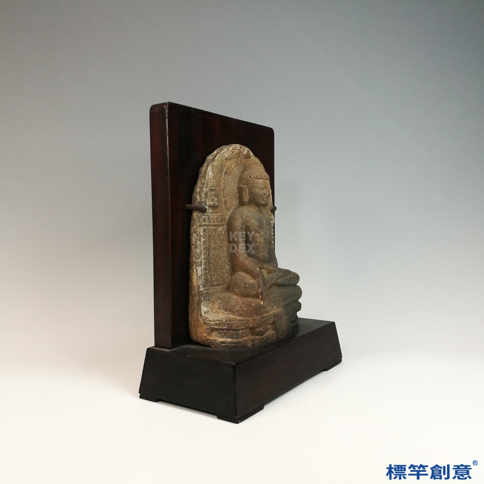 本件雕像高17公分、寬12.5公分,為小型方形佛龕結構,主體為釋迦牟尼佛結跏趺坐於覆蓮座上,雙手施禪定印,神情安詳。佛身背後雕有拱形背光,背光左右及兩側浮雕立像,底座完整,外框另配有木座底座以便展示。