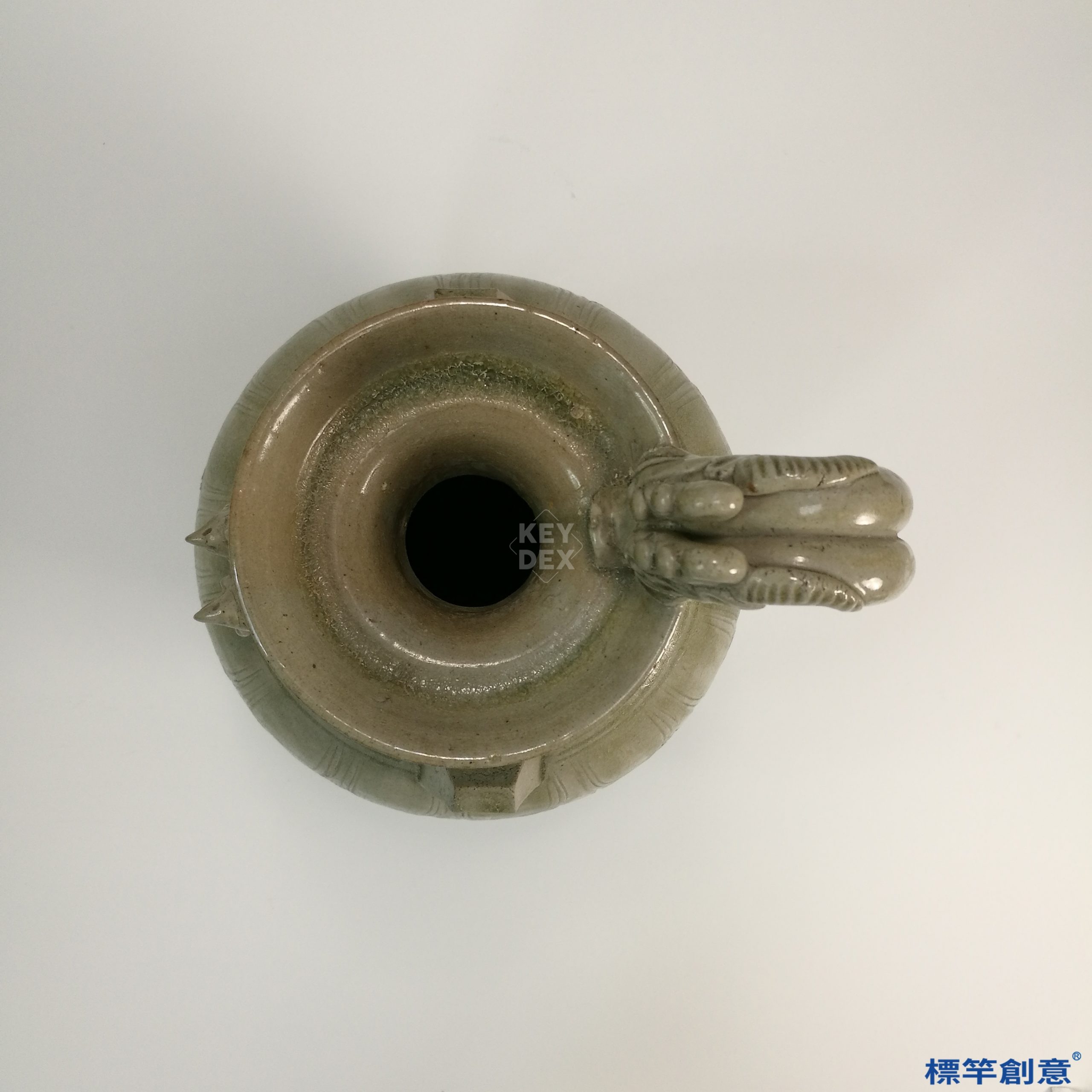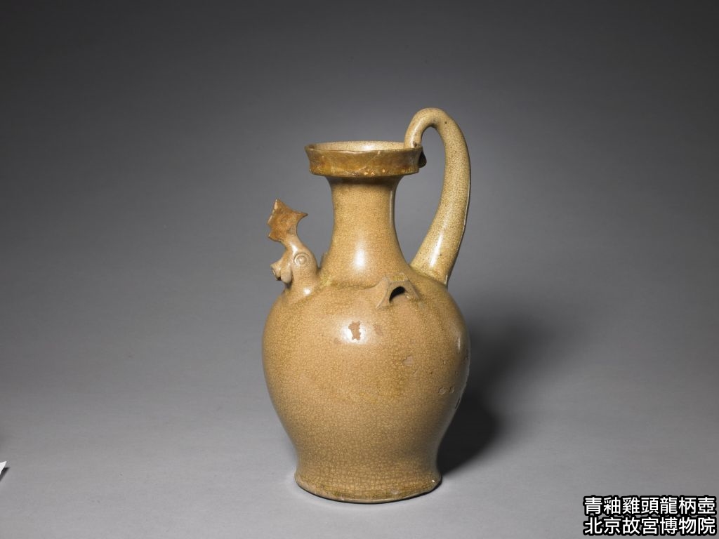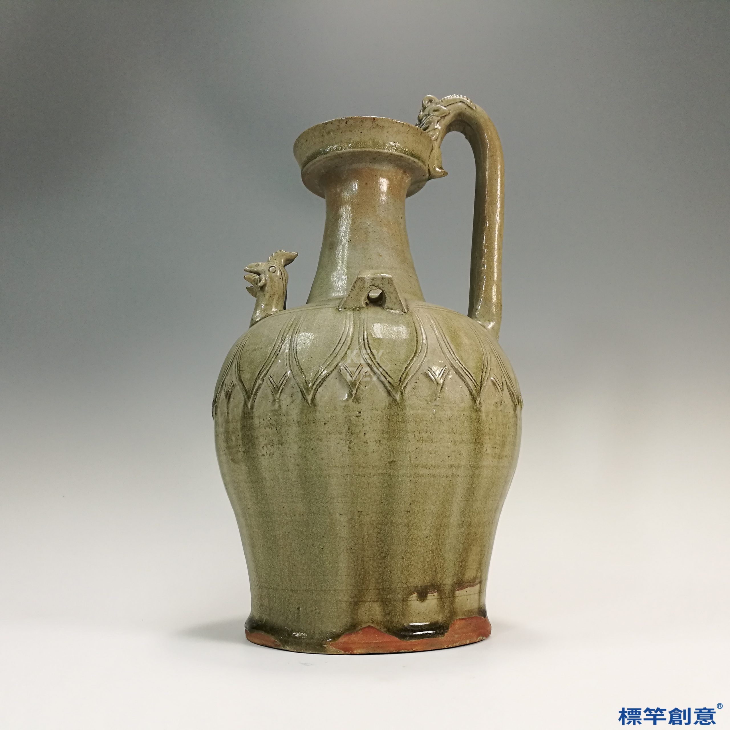採輪製成形後細部雕塑,局部貼塑龍雞首與鋬,並以刻花刀具精細雕出蓮瓣紋樣,隨後整體施釉,入窯於還原氣氛中高溫燒成,底部露胎部分可見鐵質胎色與火痕痕跡。