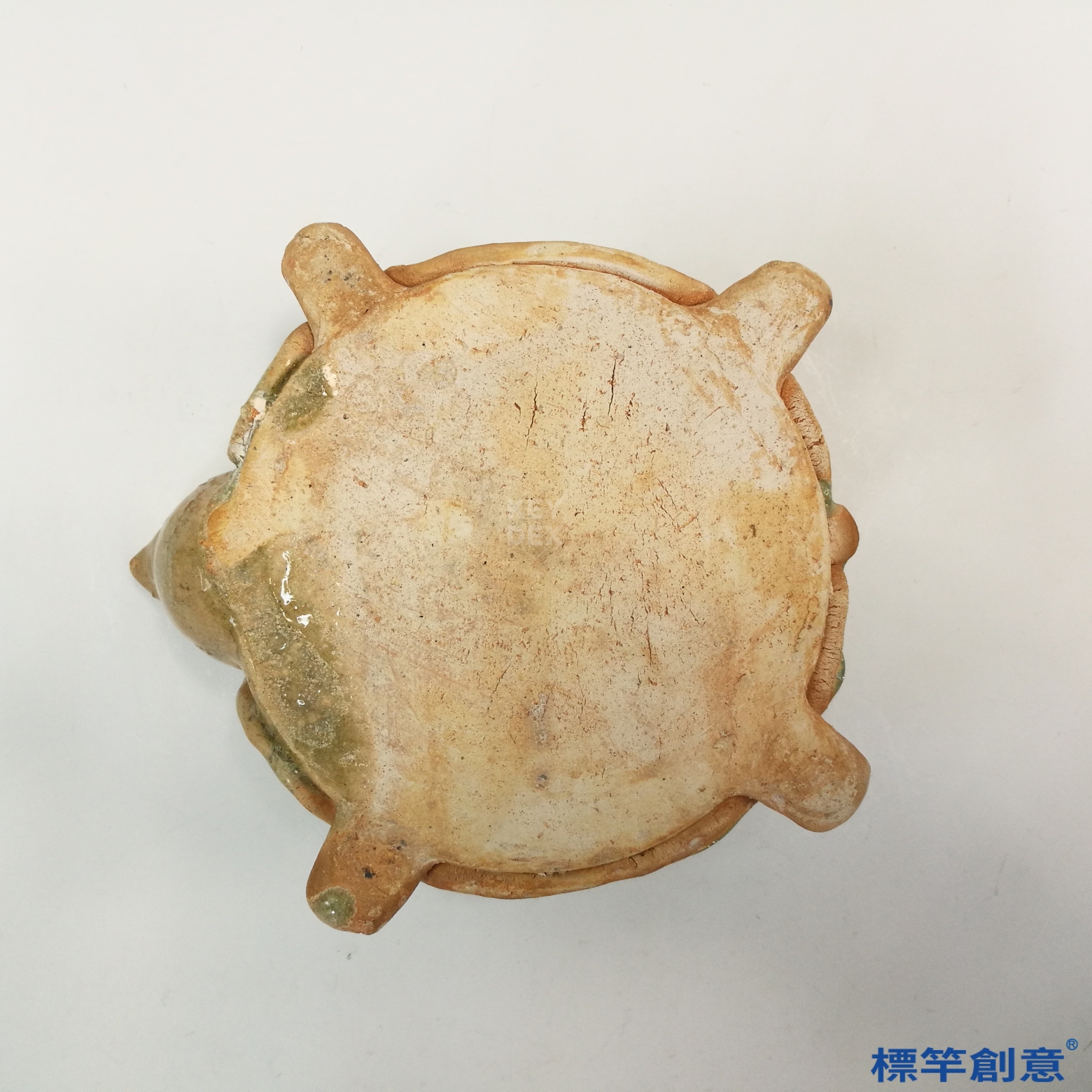 器表施黃釉,局部流釉處可見淡綠自然釉變效果,釉層薄透,光澤柔和。胎色呈淡紅褐色,龜背周緣以波浪狀陰刻線飾,四足與龜首細部均有刻劃,整體造型簡樸中見巧思。