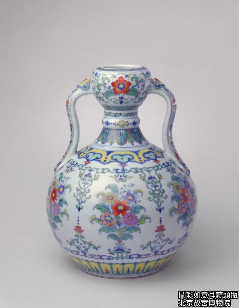 本器高28.5公分、腹徑約19公分,瓶身上圓下鼓,頸細高挑,口部作瓣形外撇,形如蒜頭,故稱蒜頭瓶。肩部以下轉圓腹,底承小圈足。器身通體分段貼飾蓮瓣與寶相花紋,構圖對稱繁麗,形式穩重莊嚴。