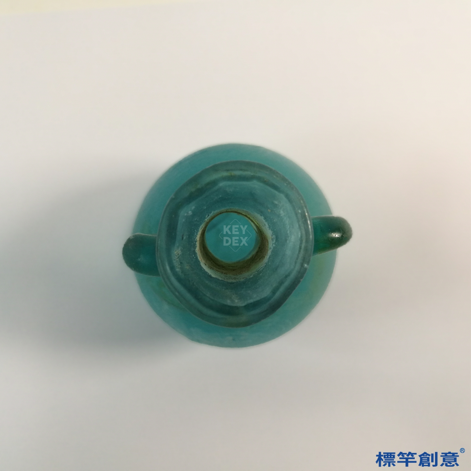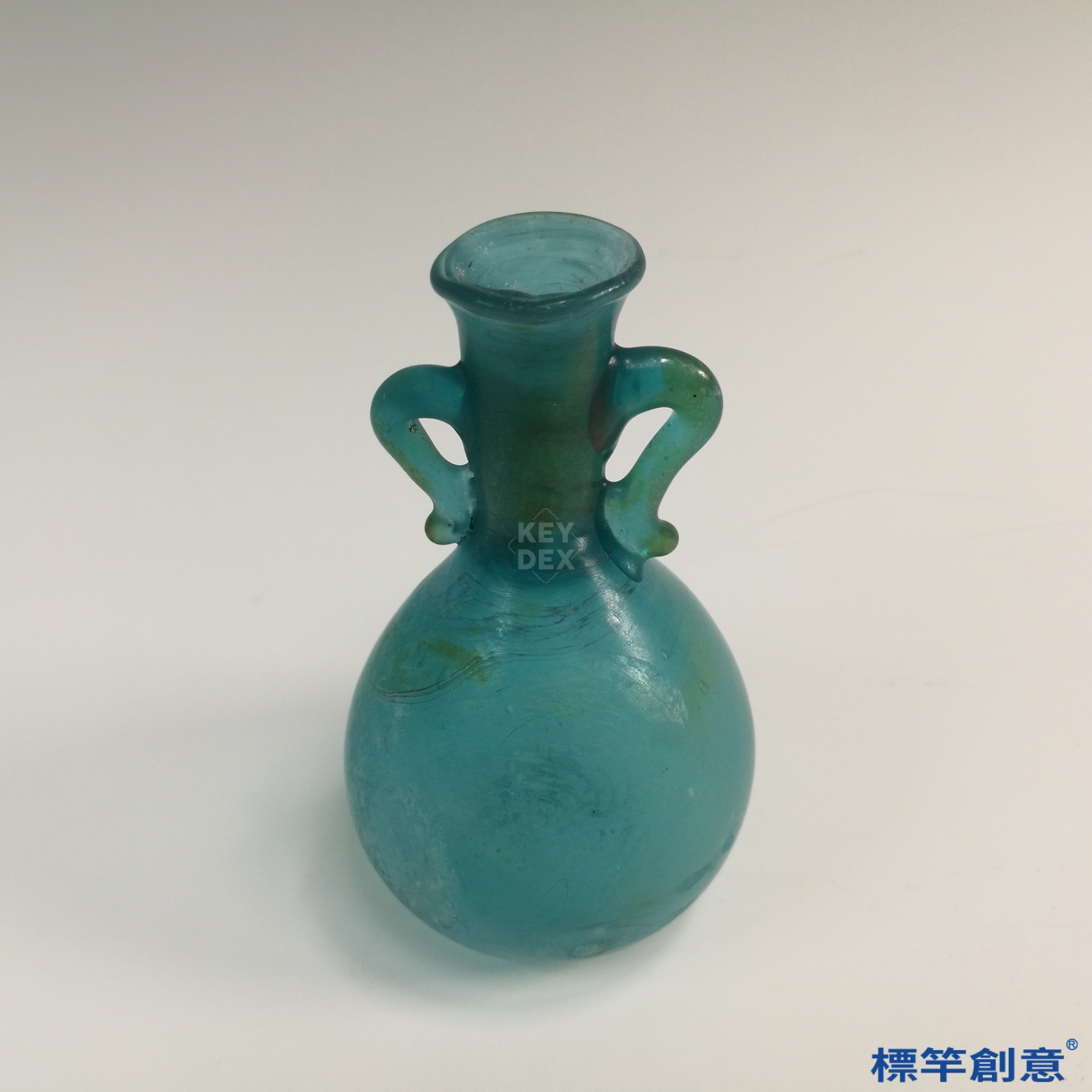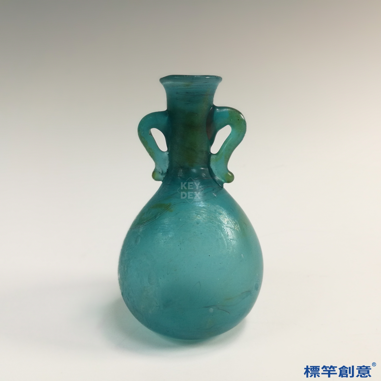 器物通體以孔雀藍琉璃製成,色澤沉穩透亮,在自然光下呈半透明光澤。瓶身可見旋吹氣泡與流動紋理,乃古代吹製工藝之自然痕跡。雙耳經由熔接技法手工黏附,造形對稱均衡,與瓶身連結緊密。口沿厚實圓鈍,具實用與美觀雙重功能。