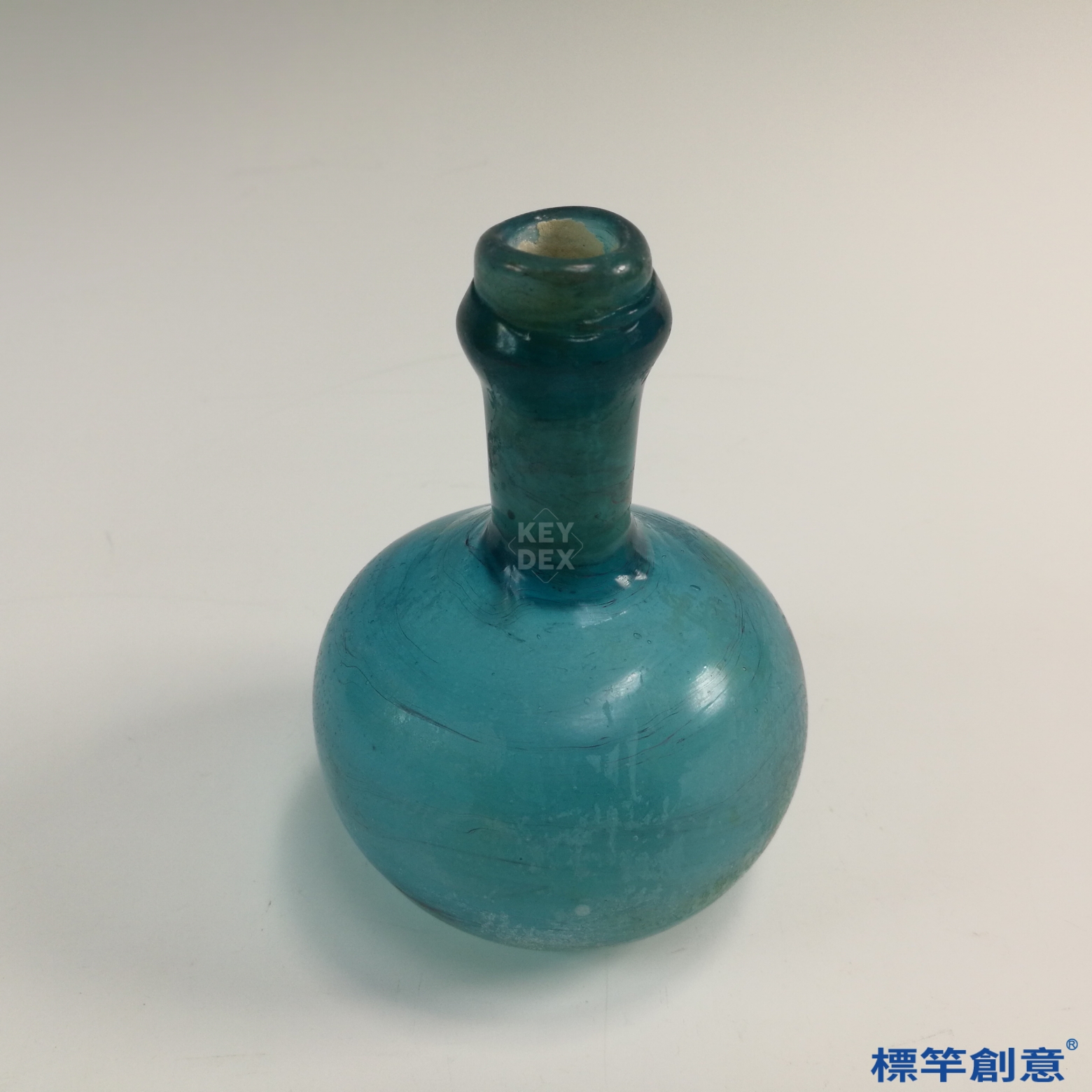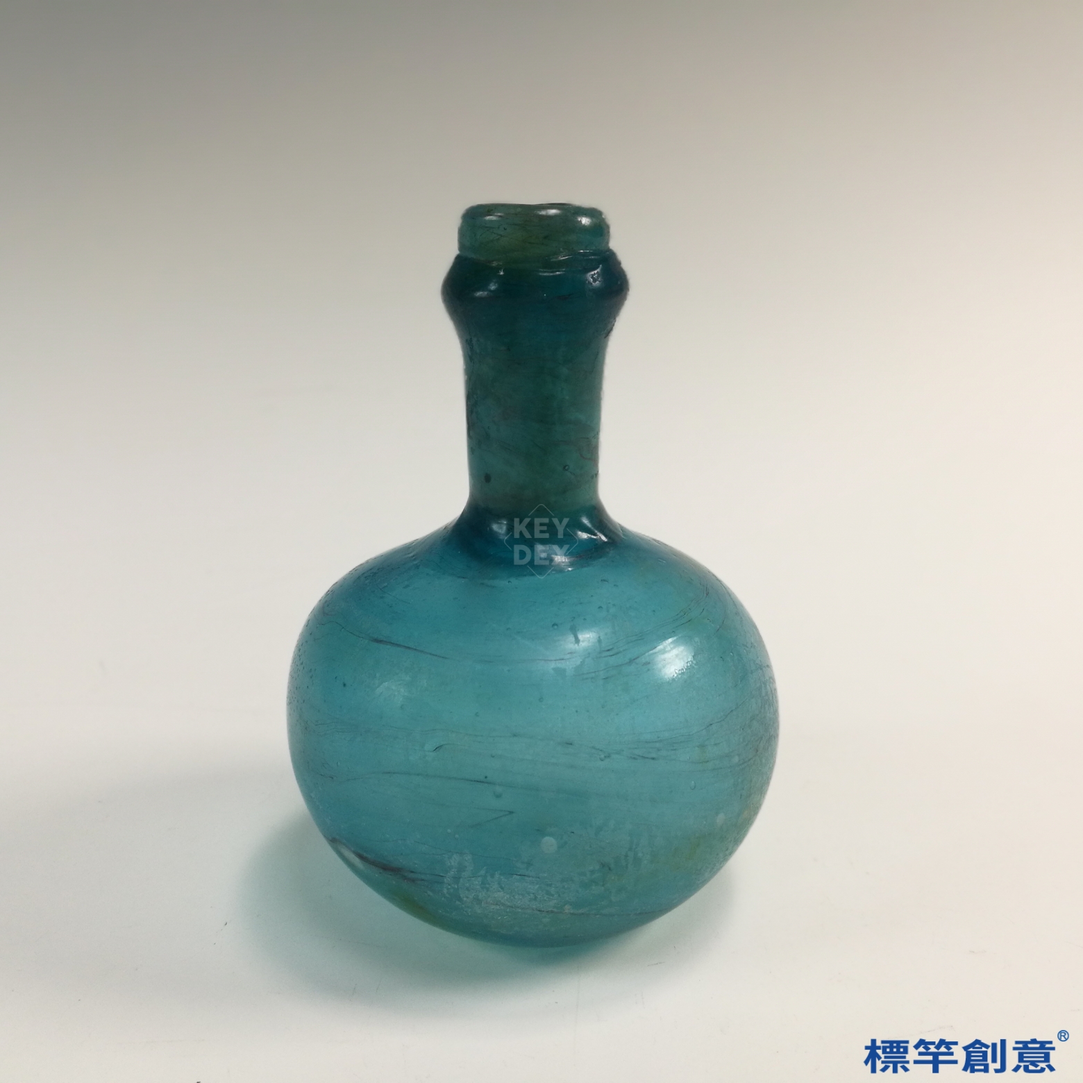 採孔雀藍琉璃材質製成,色澤深邃鮮亮,瓶身可見玻璃拉坯製程所留下的旋紋痕跡,瓶體略有氣泡及不規則流動紋,為古代熔製玻璃器常見特徵,無任何外加裝飾,造型樸素。