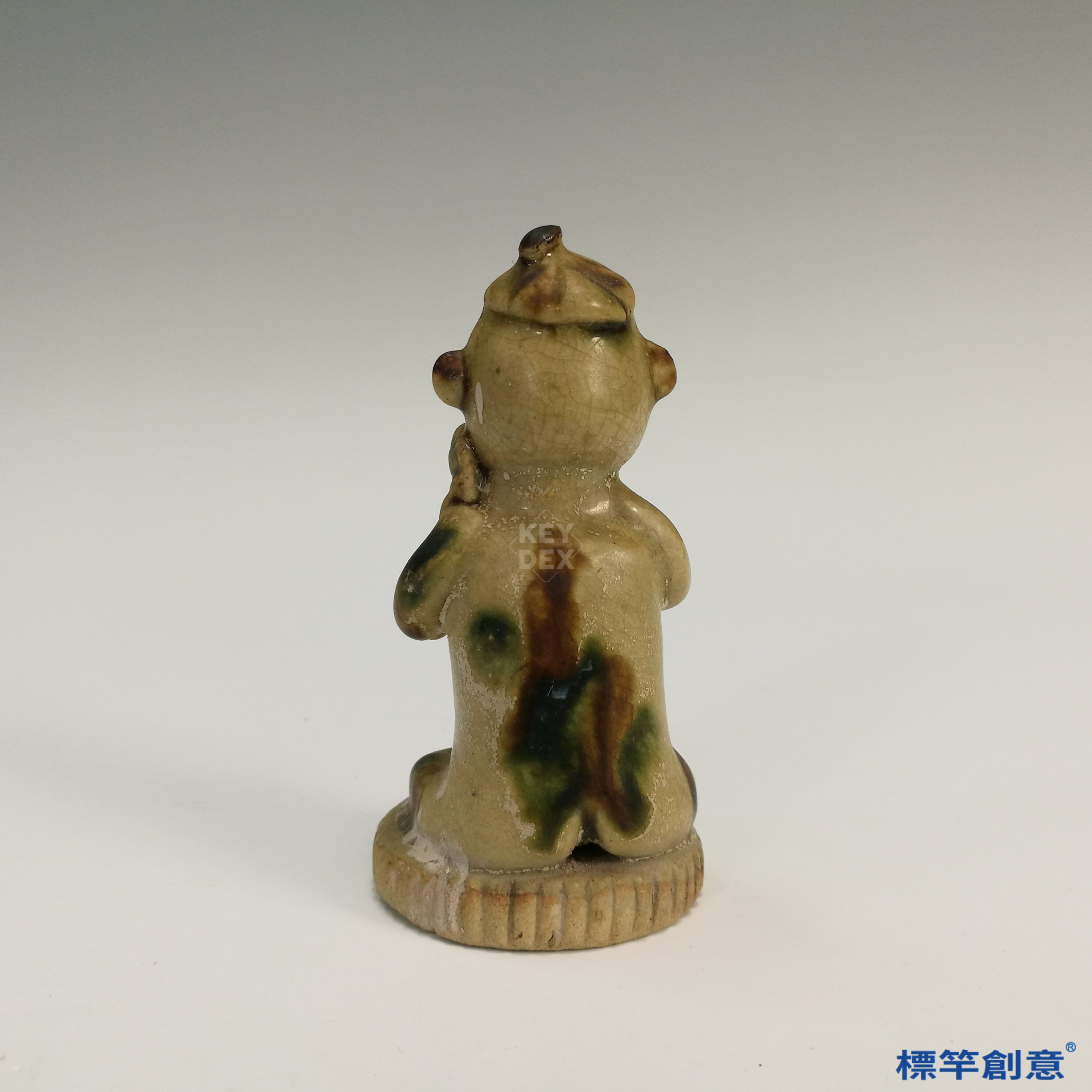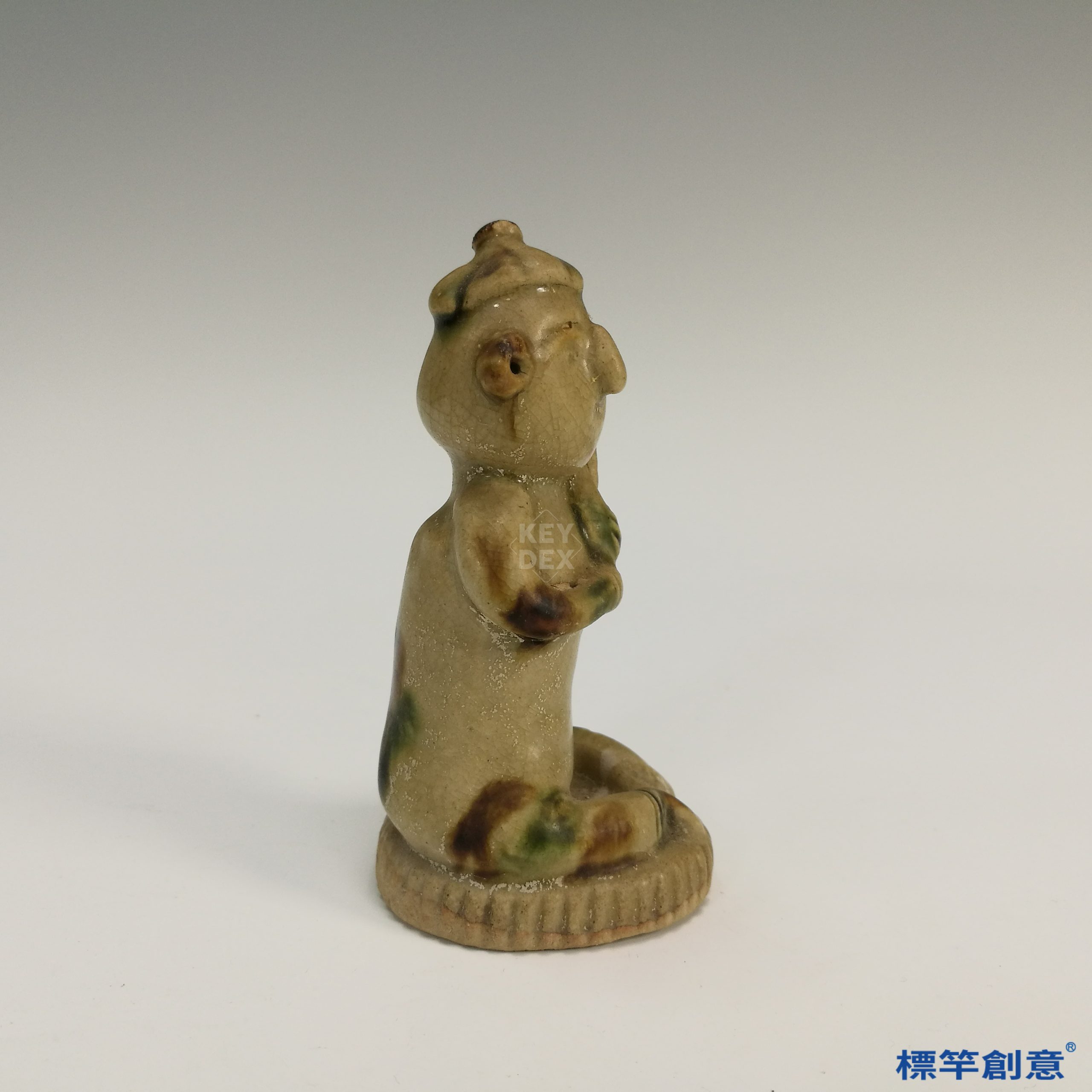 此件俑像高10公分,通體坐於齒輪狀盤座之上,頭戴尖帽,五官立體,雙手交握持物於胸前,神情莊重,體態穩定。通體比例勻稱,具唐代陶俑之寫實風格。