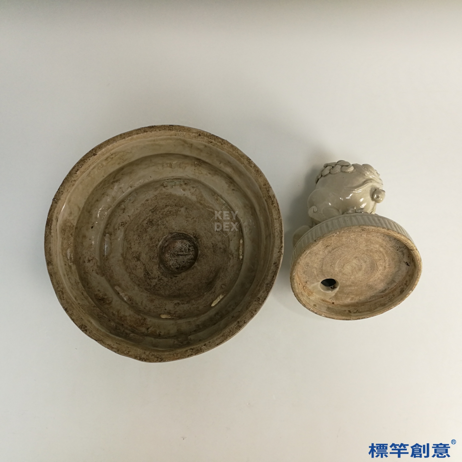 通體施米白釉,釉層潤澤凝厚,色澤溫潤如玉,展現邢窯高超釉質掌控。底座與爐體以模印及手工雕刻裝飾蓮瓣與雲紋,蓋上獅像由單獨雕塑後結合而成,細節豐富,鬃毛、眼神均細緻刻畫。整體結構對稱嚴謹,組合嚴密。