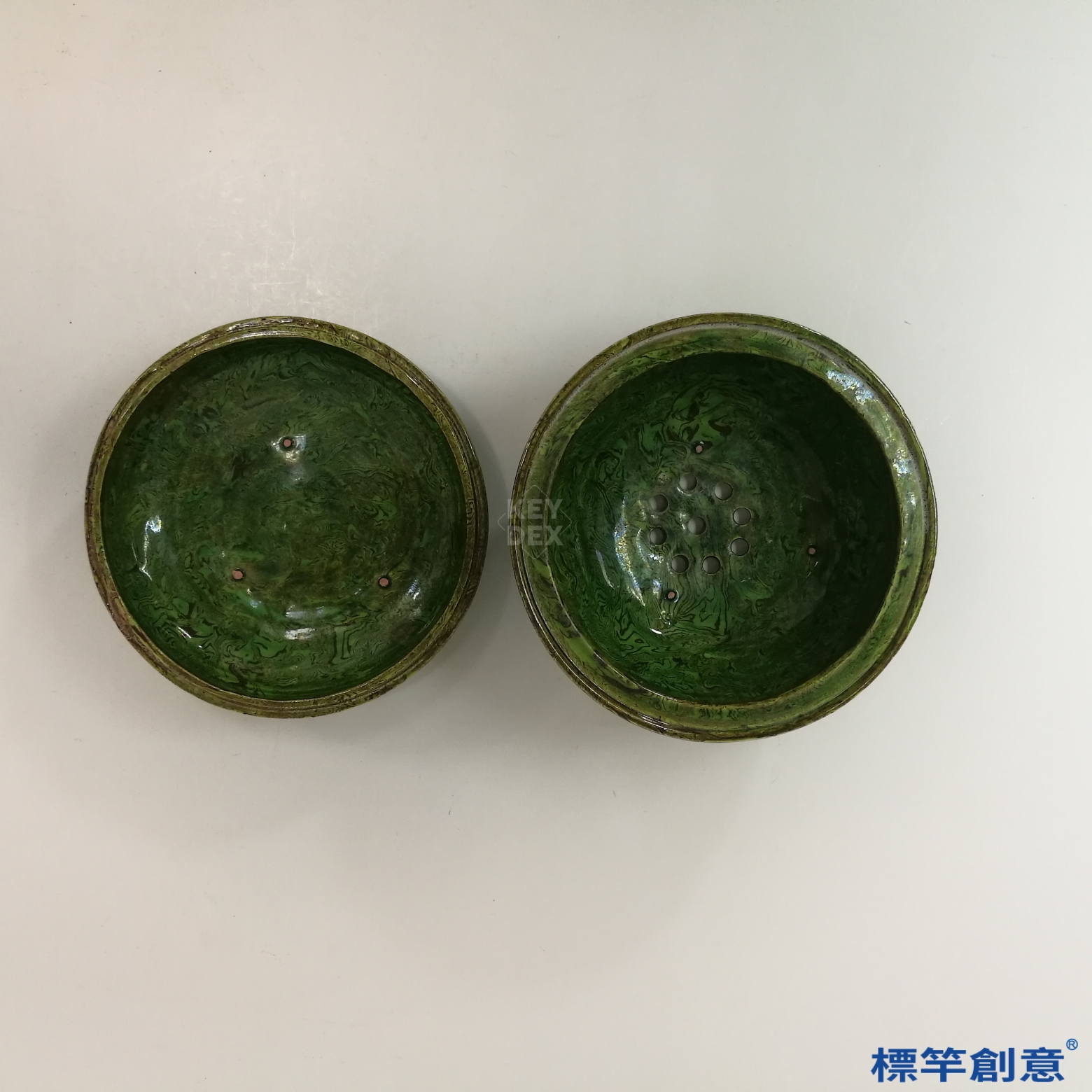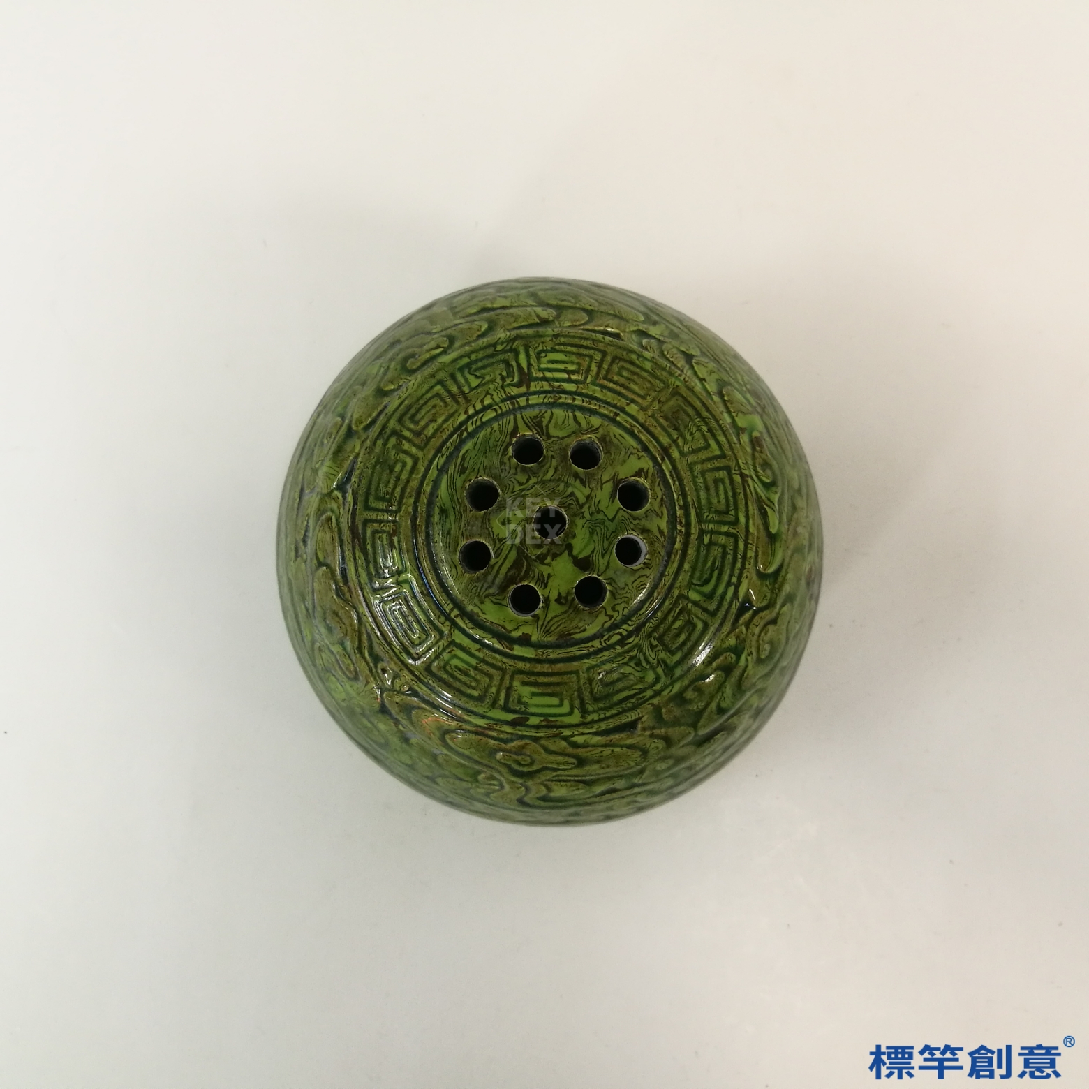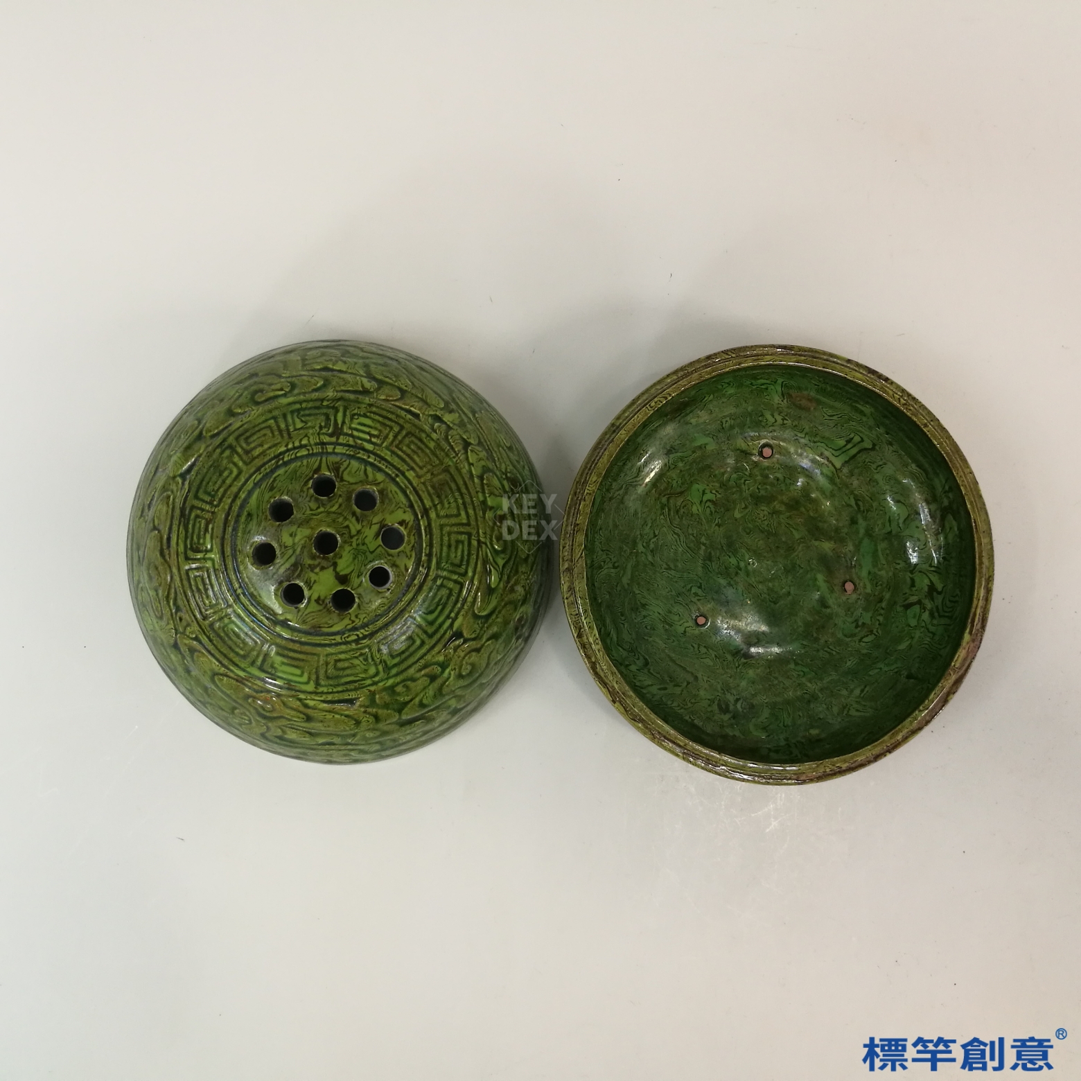 本器高8公分,口徑約11.5公分,呈圓鼓形蓋罐結構,上蓋微隆,設有多孔以利薰香透氣,下部為淺腹盌形座,整體比例勻稱穩重。