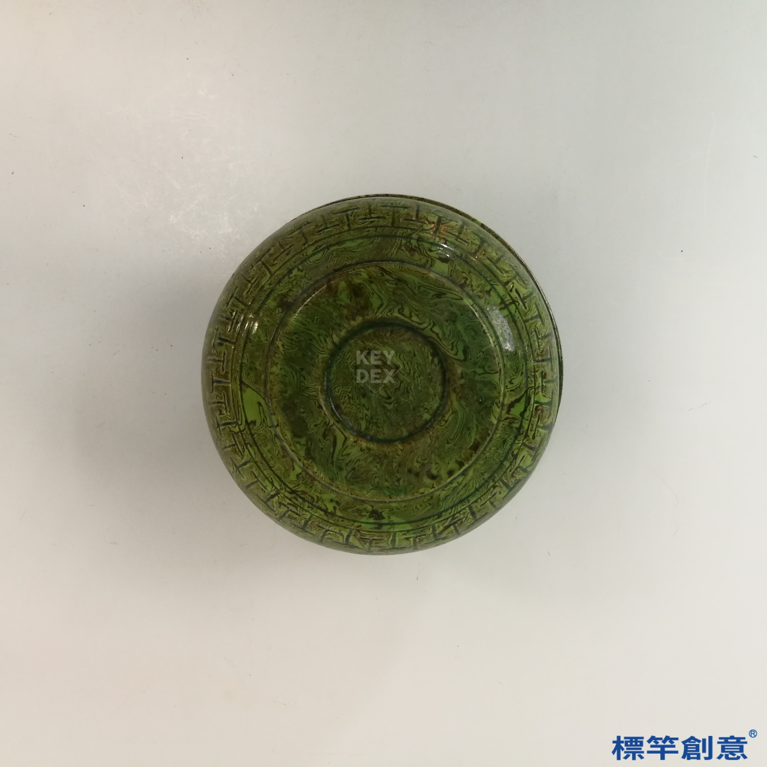 器物以細密胎土成形,經素燒後施掛含鉛銅的綠釉,置於低溫氧化氣氛中燒成。刻紋施於釉下,燒後呈現深淺分明的圖案層次。