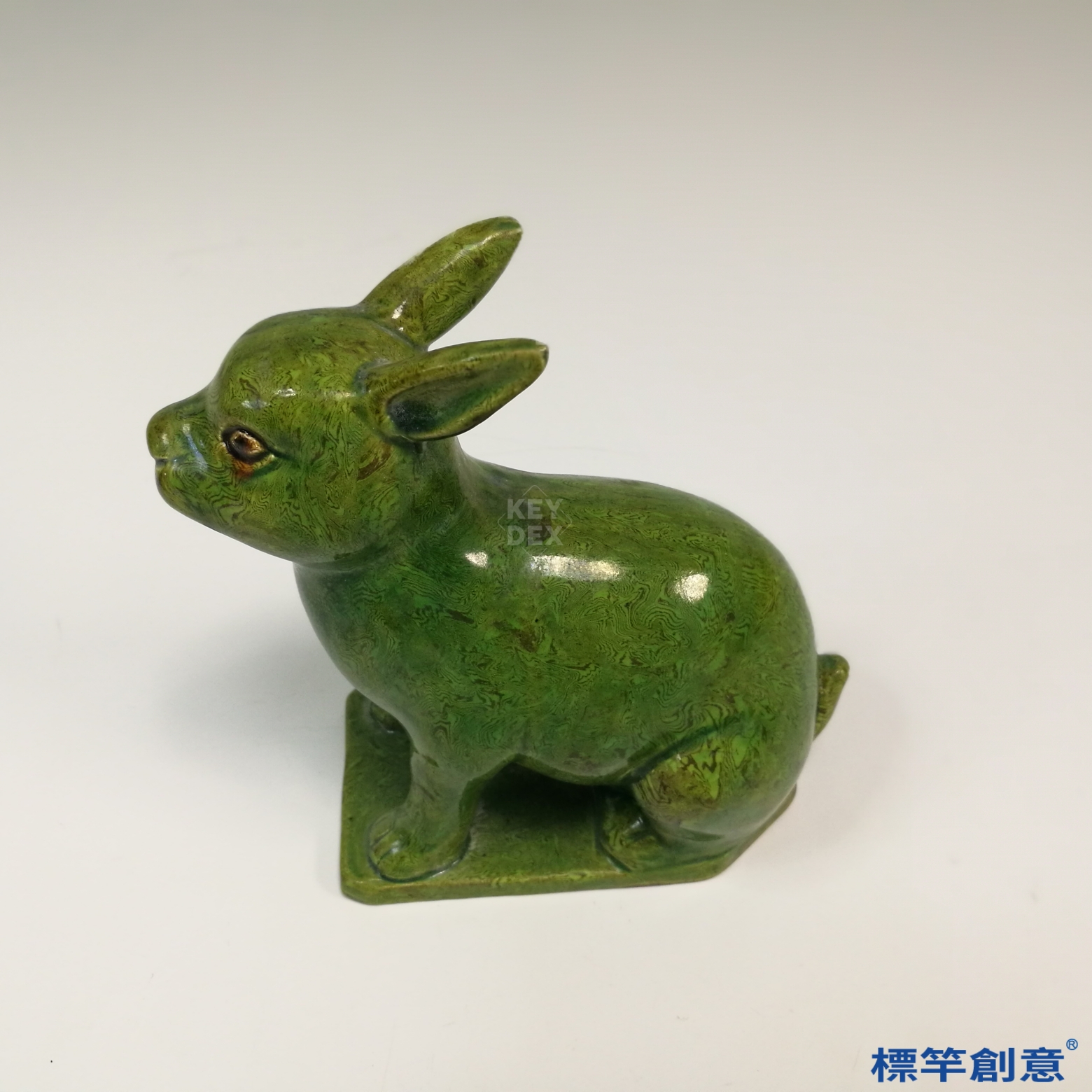通體施橄欖綠釉,釉層厚潤均勻,釉面具自然流暢的紋理,為典型「紋胎瓷」風格。胎體細密,刻畫紋理細緻,耳部、眼部與四肢處形態寫實,顯示模塑與細修技藝高超。釉中可見深淺不一的旋渦狀紋路,係由兩種不同色澤釉料混合流動所致。