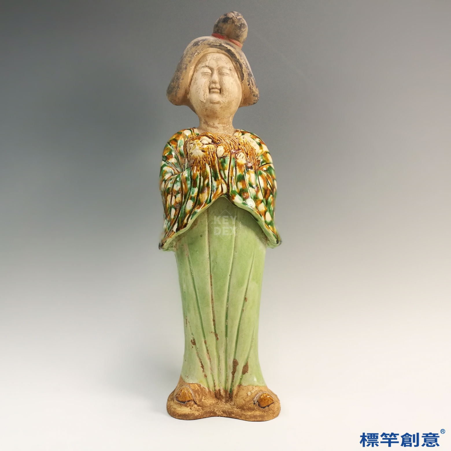 此俑出土於唐代(約公元8世紀),屬中唐至晚唐之風格。三彩俑多燒製於河南洛陽、鞏義一帶,但因地方民窯普遍仿製,故本品歸屬為無款無記名之唐代北方三彩窯系,一般通稱為「唐三彩」。該時期的三彩陶俑廣泛用於隨葬,代表唐人重視死後世界之生活延續觀。