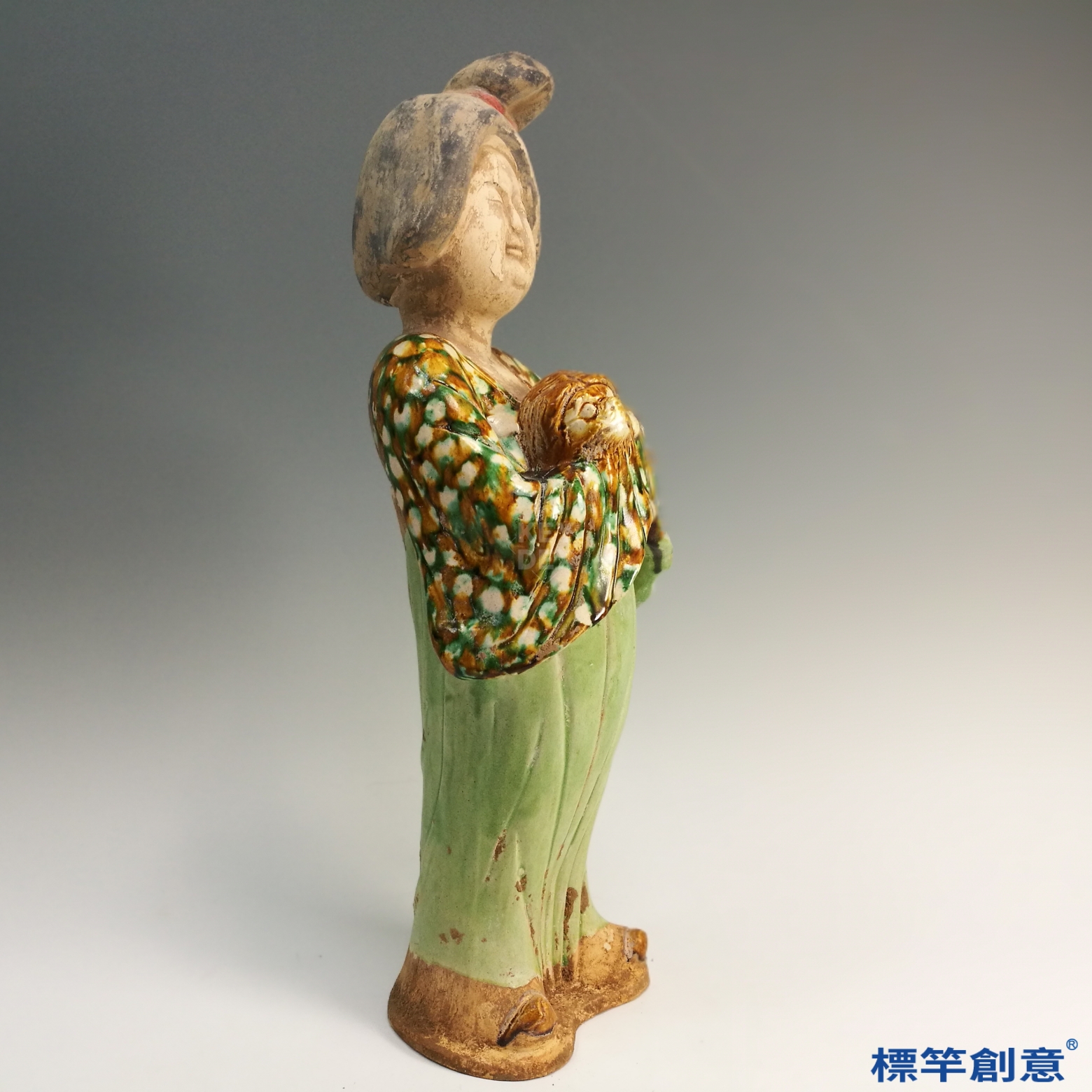 FB071 唐代淺綠釉三彩陶仕女抱犬俑