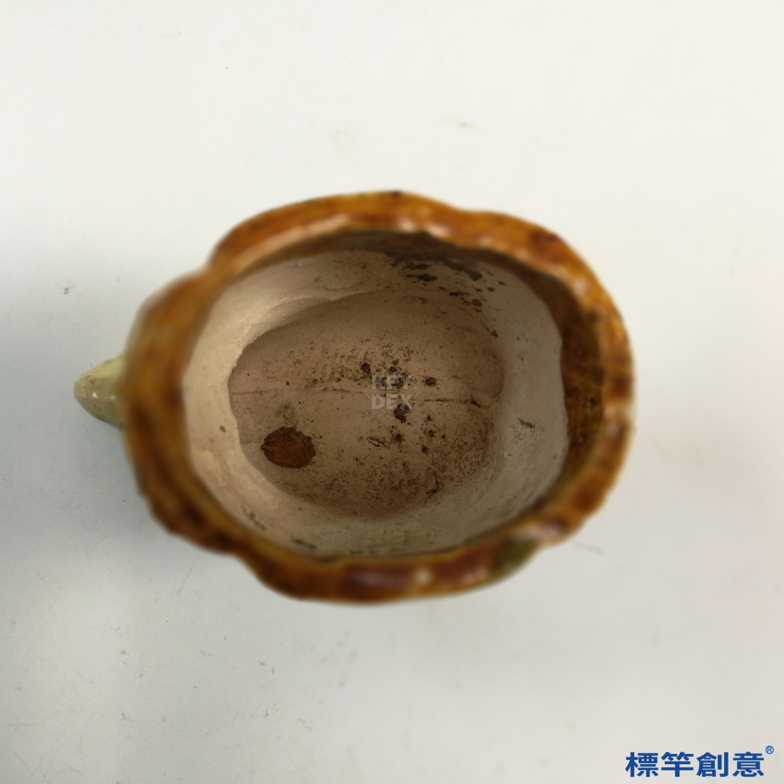 本器施以典型唐三彩釉,釉色以綠、褐、黃為主,釉層厚潤、自然流淌。杯體施模印裝飾,獸首部分以立體塑造方式形成,五官清晰,神態逼真。三彩釉彩沿器壁自然交融,呈現強烈視覺效果與異域風情。