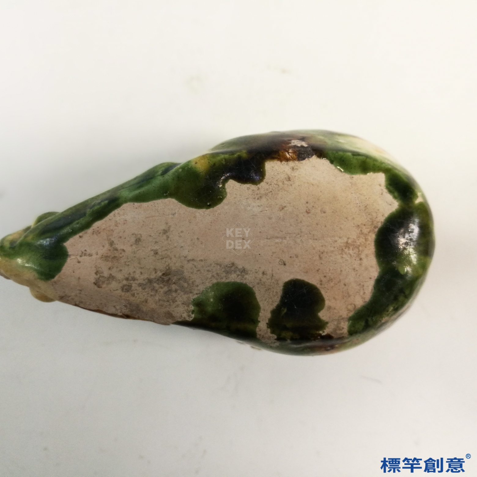 器體經模製成形後,細部修飾、雕塑獸首部位,施褐、綠、黃三彩鉛釉,入窯於攝氏800度左右低溫釉上燒成。釉色流動自然,釉面富有光澤,為唐三彩典型製程。