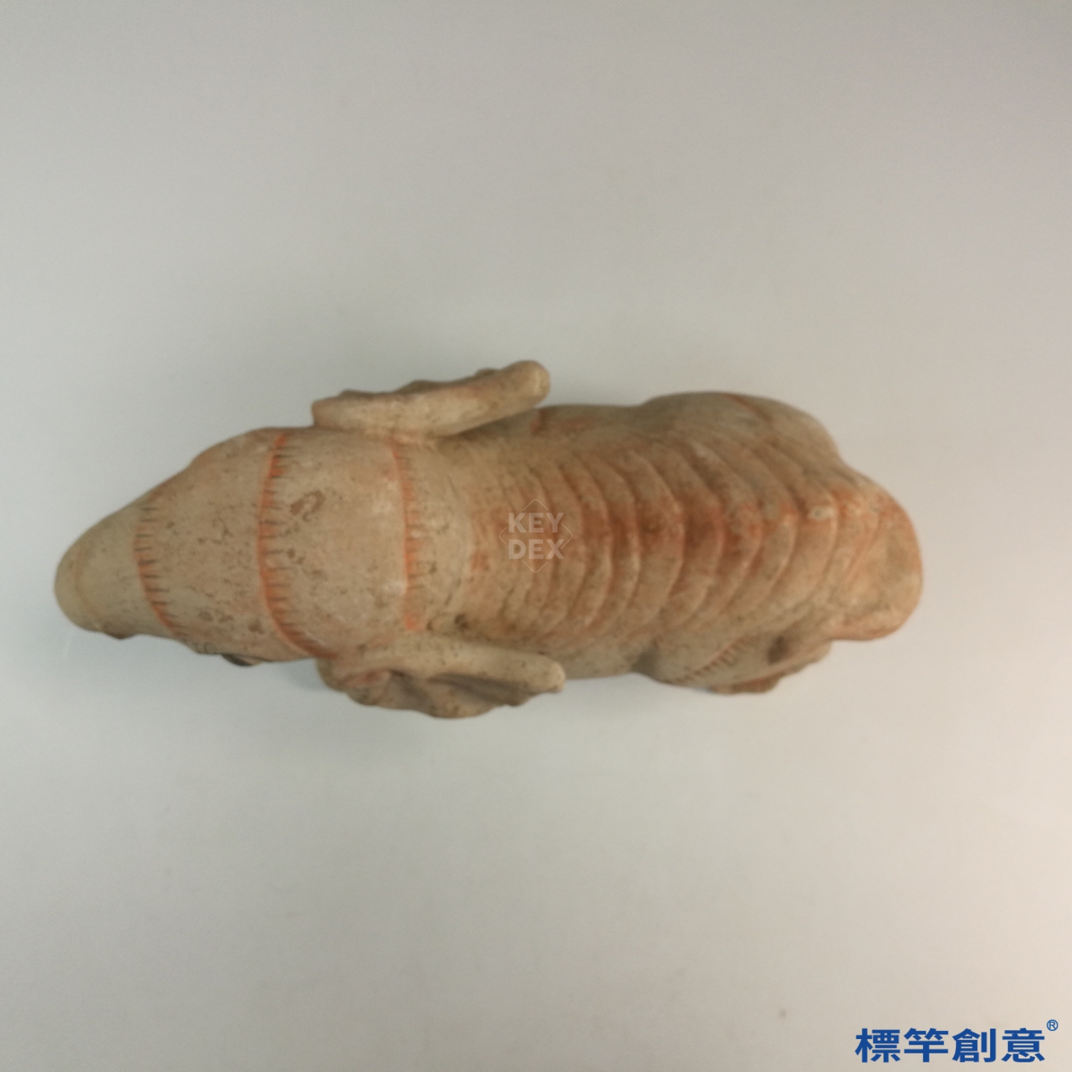 本器為典型灰陶胎,表面施以土黃釉,並以赭紅、橙褐等礦物顏料進行彩繪,構成條紋狀裝飾與肌理描繪。象面五官立體,眼睛部位施加黑彩強調神態,牙齒與耳廓細節均以刻劃方式處理。整體製作比例準確,動作表現穩重,色彩柔和,氣勢莊嚴。