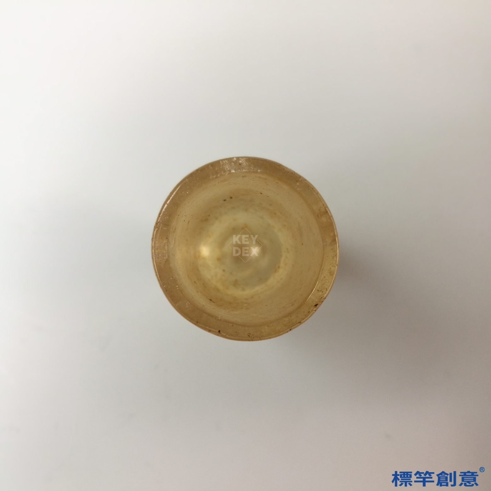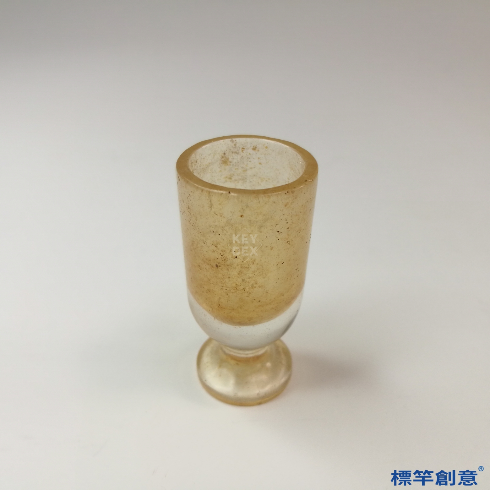 本件高4.8公分,口徑約2.3公分,屬微型高足杯器形。器身呈圓筒形,杯口直口平沿,底部承以小型實心高足,足部與杯身一體雕琢,比例精巧對稱,手感細緻,整體呈透明微黃的天然水晶質地。